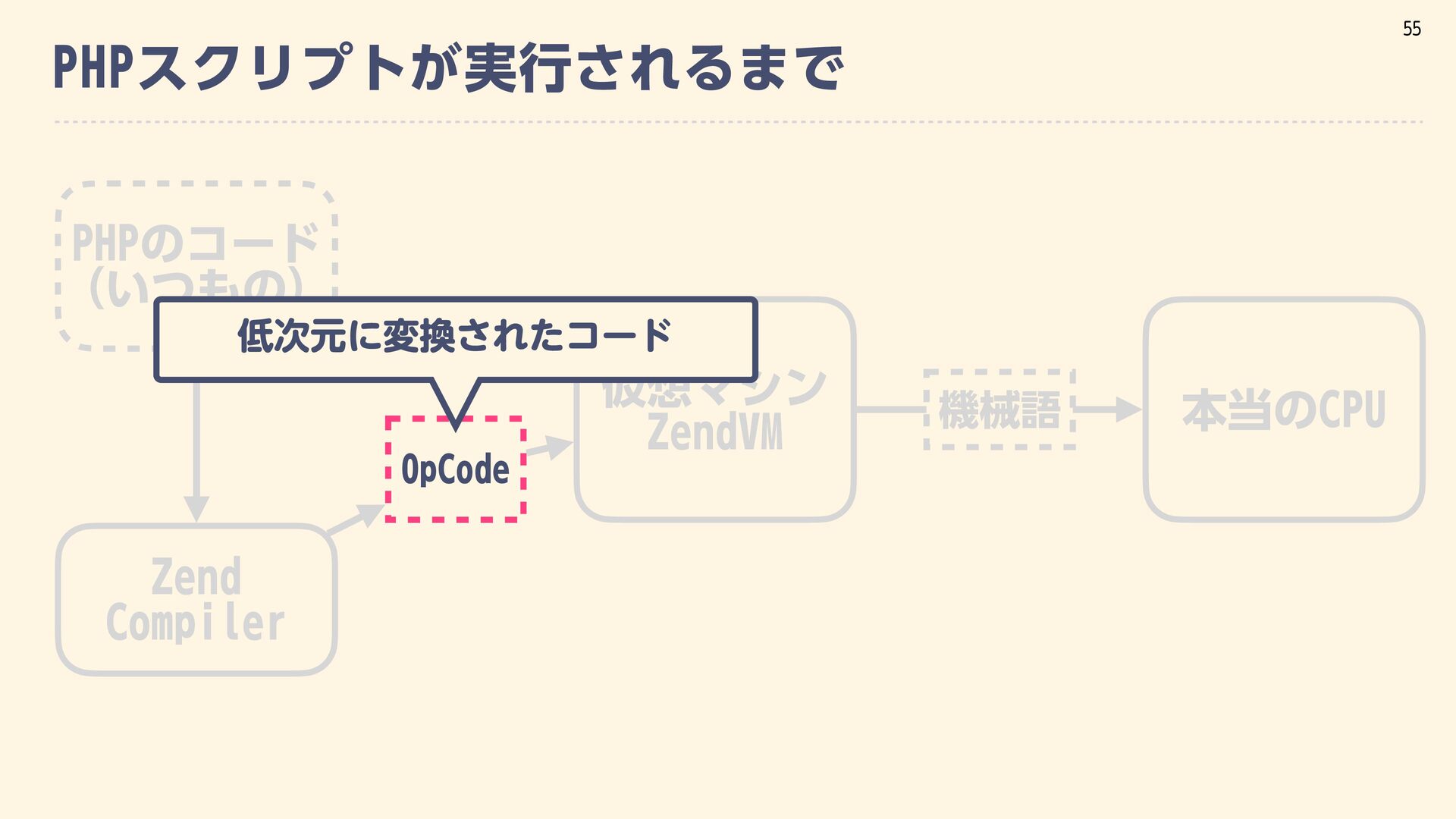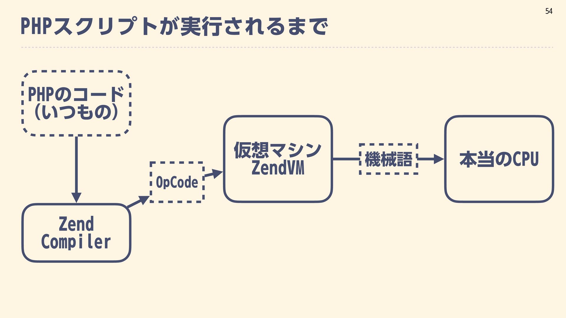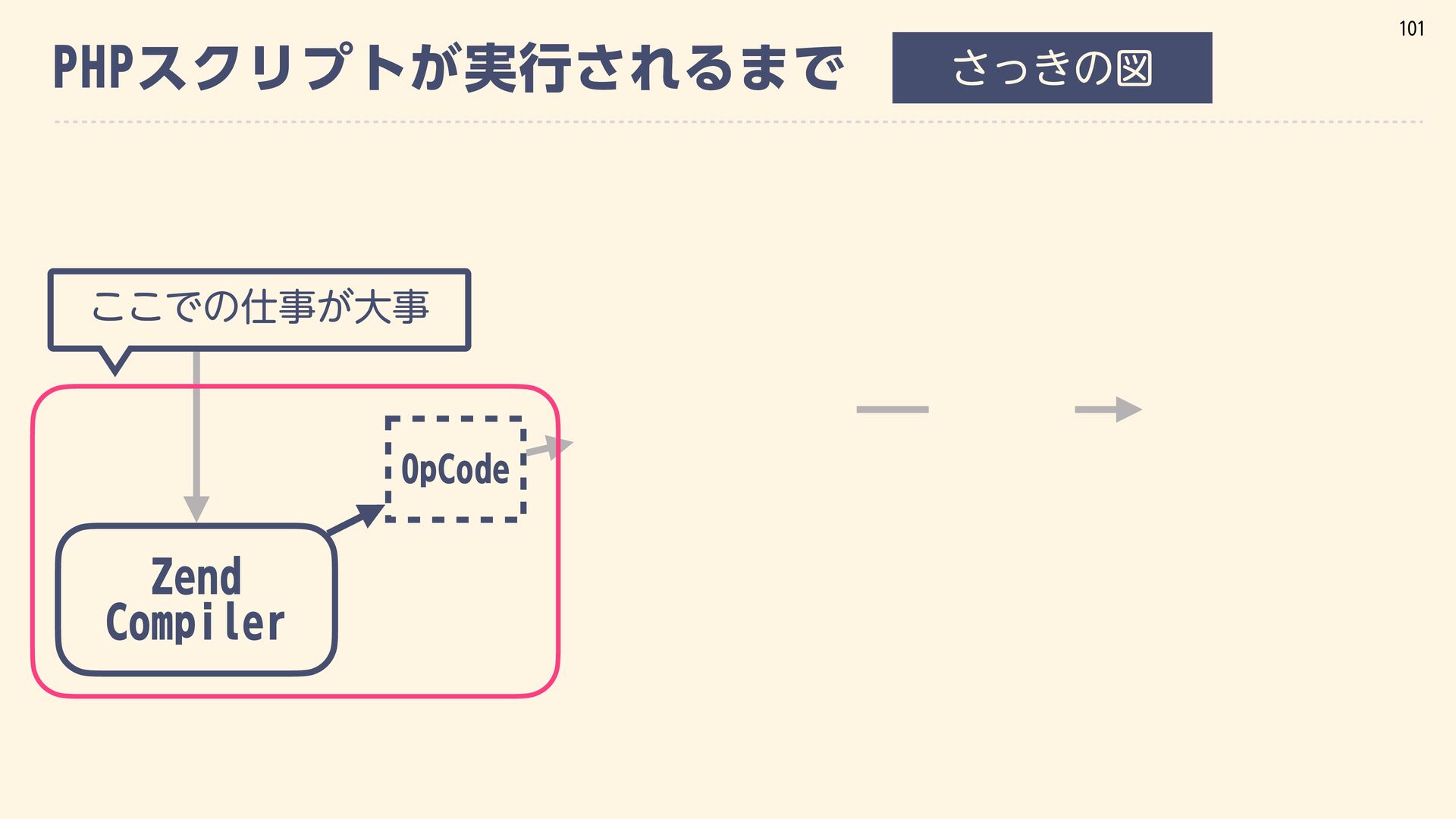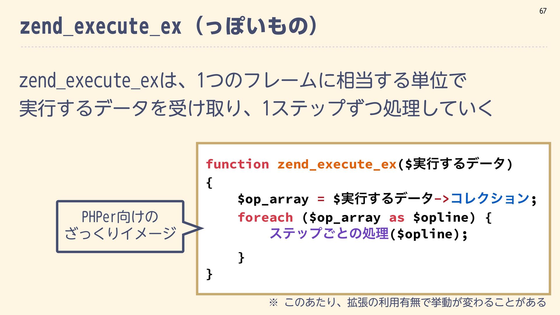 $࣮ߦ͢Δσʔλ->ίϨΫγϣϯ; foreach ($op_array as $opline) { εςοϓ͝ͱͷॲཧ($opline); } } PHPer向けの ざっくりイメージ ※ このあたり、拡張の利用有無で挙動が変わることがある