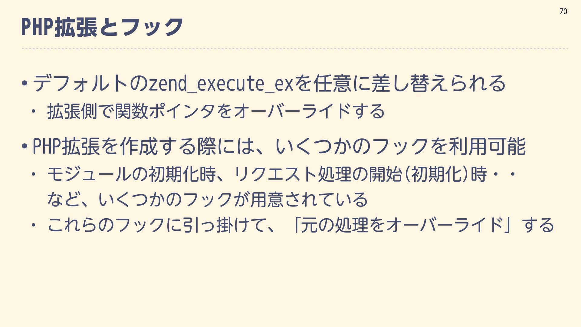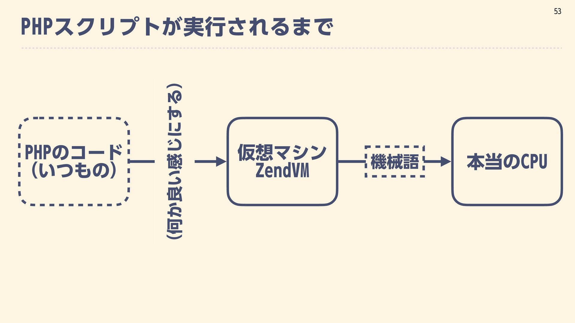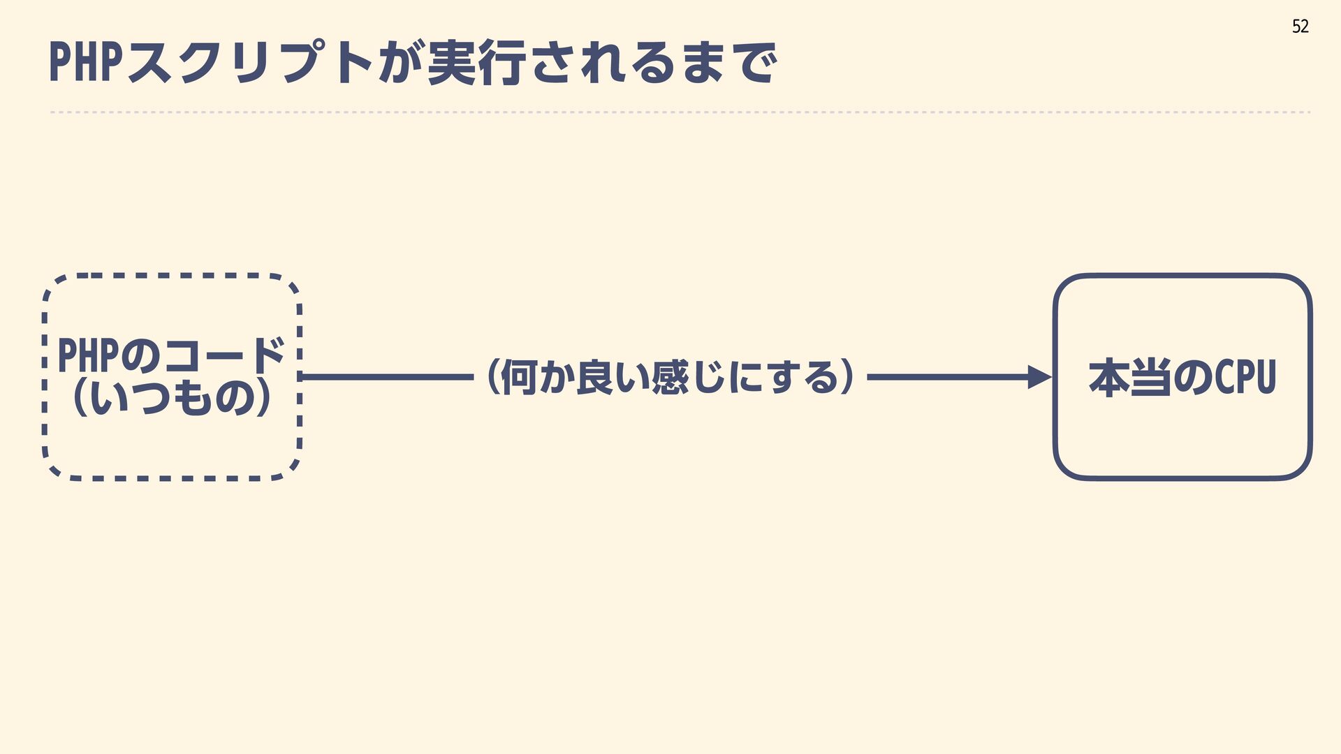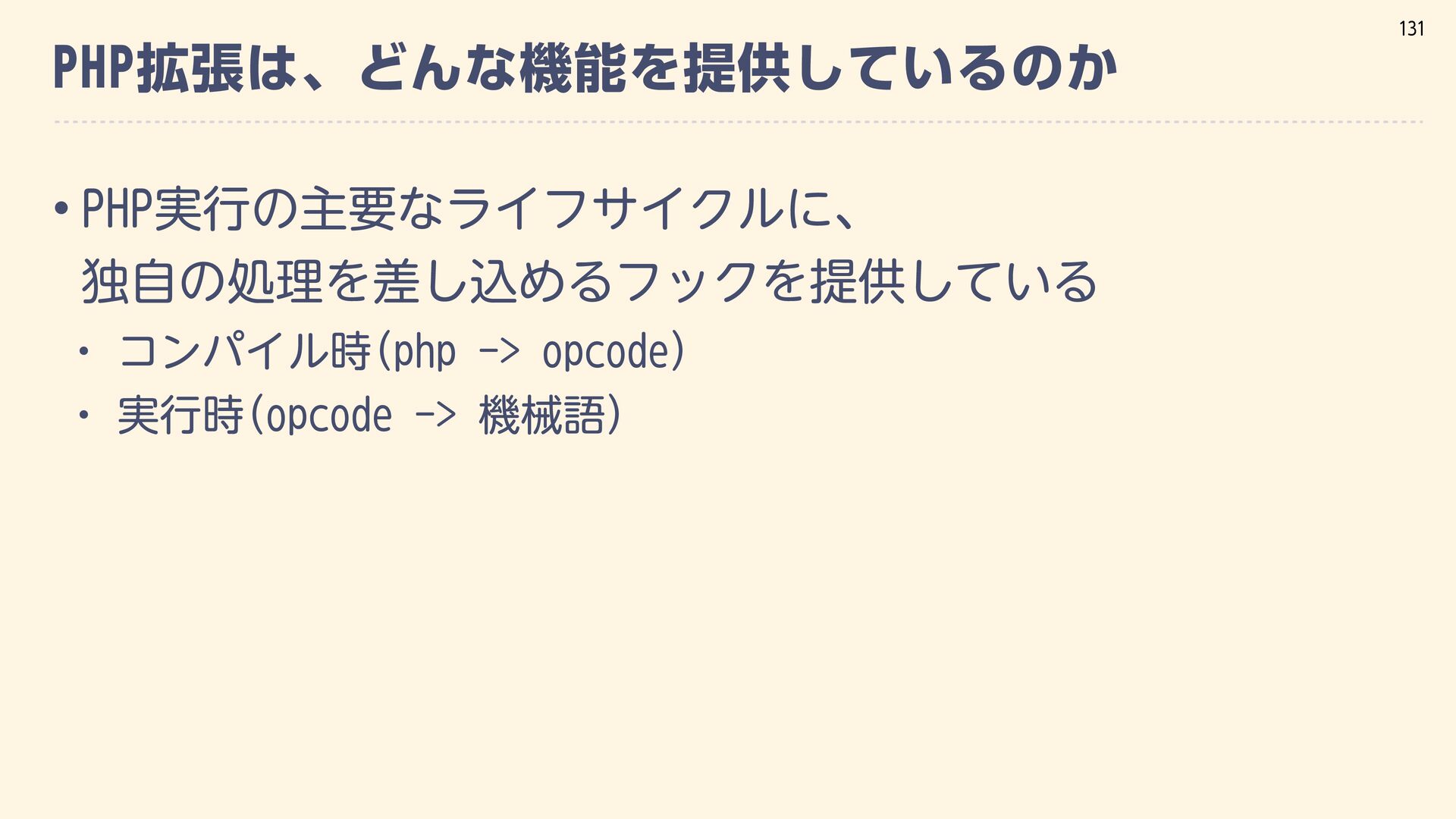 $࣮ߦ͢Δσʔλ->ίϨΫγϣϯ; foreach ($op_array as $opline) { εςοϓ͝ͱͷॲཧ($opline); } } PHPer向けの ざっくりイメージ ※ このあたり、拡張の利用有無で挙動が変わることがある