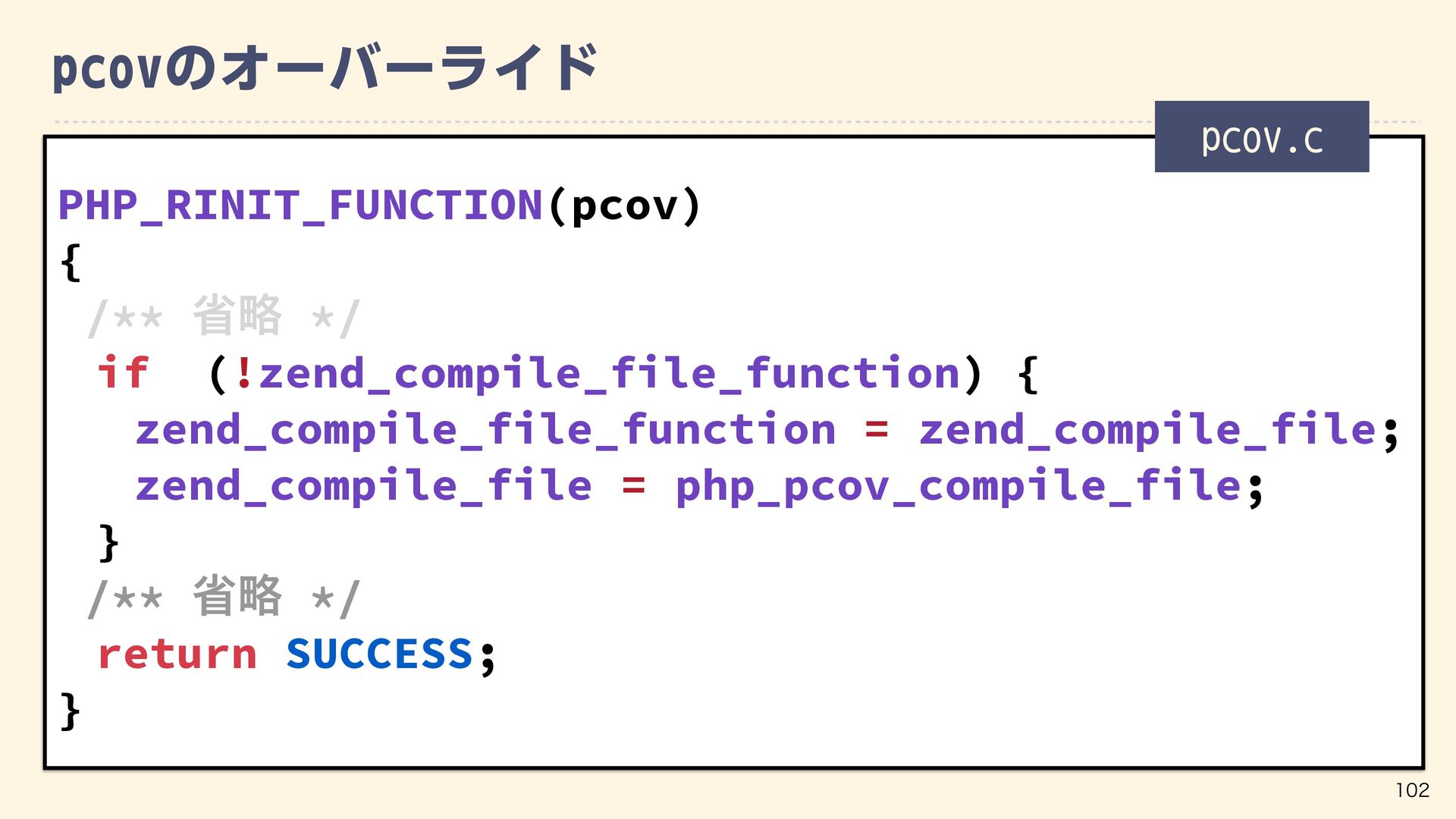 44. pcovのオーバーライド PHP_RINIT_FUNCTION(pcov) { /** লུ */ if (!zend_compile_file_function) { zend_compile_file_function