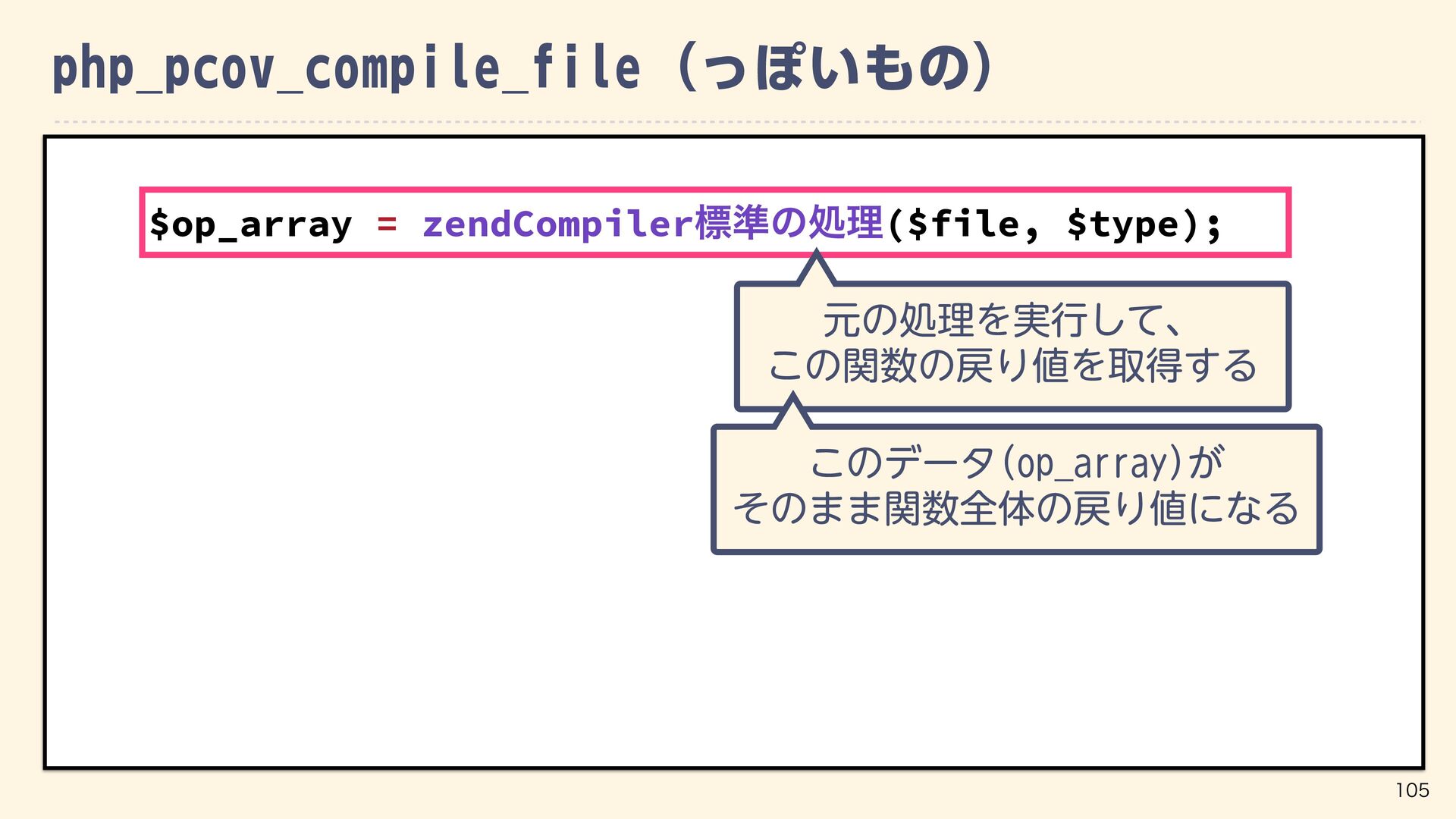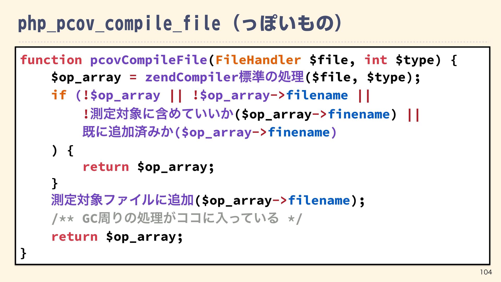 zendCompilerඪ४ͷॲཧ($file, $type); if (!$op_array || !$op_array->filename || !ଌఆର৅ʹؚΊ͍͍͔ͯ($op_array->filename) || طʹ௥ՃࡁΈ͔($op_array->finename) ) { return $op_array; } ଌఆର৅ϑΝΠϧʹ௥Ճ($op_array->filename); /** GCपΓͷॲཧ͕ίίʹೖ͍ͬͯΔ */ return $op_array; }  $op_array = zendCompilerඪ४ͷॲཧ($file, $type); 元の処理を実行して、 この関数の戻り値を取得する このデータ(op_array)が そのまま関数全体の戻り値になる