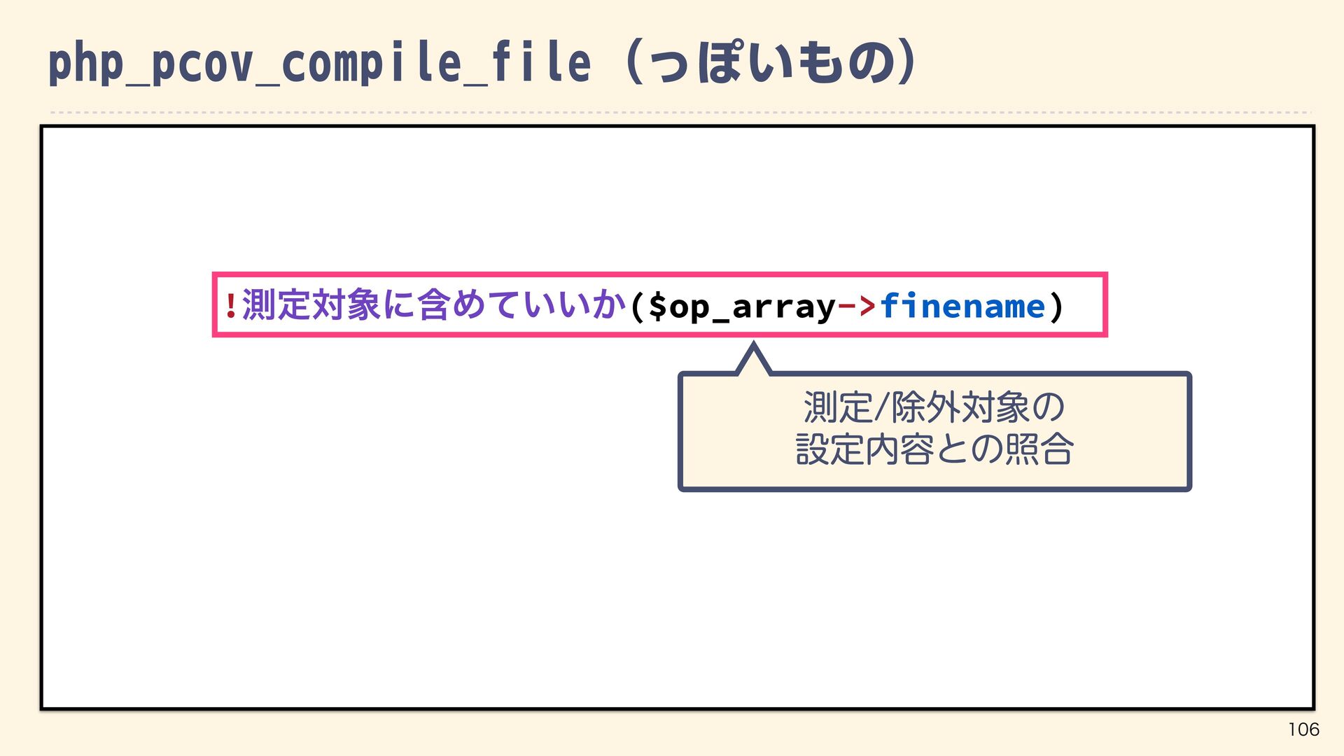 zendCompilerඪ४ͷॲཧ($file, $type); if (!$op_array || !$op_array->filename || !ଌఆର৅ʹؚΊ͍͍͔ͯ($op_array->finename) || طʹ௥ՃࡁΈ͔($op_array->finename) ) { return $op_array; } ଌఆର৅ϑΝΠϧʹ௥Ճ($op_array->filename); /** GCपΓͷॲཧ͕ίίʹೖ͍ͬͯΔ */ return $op_array; }  !ଌఆର৅ʹؚΊ͍͍͔ͯ($op_array->finename) 測定/除外対象の 設定内容との照合