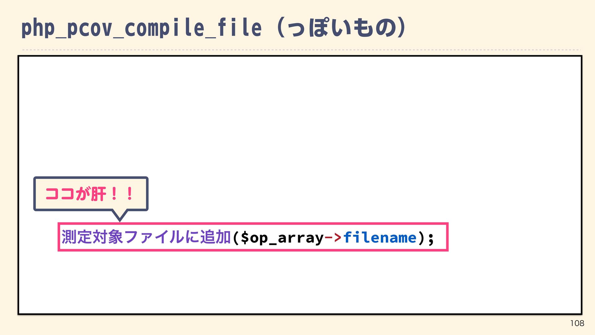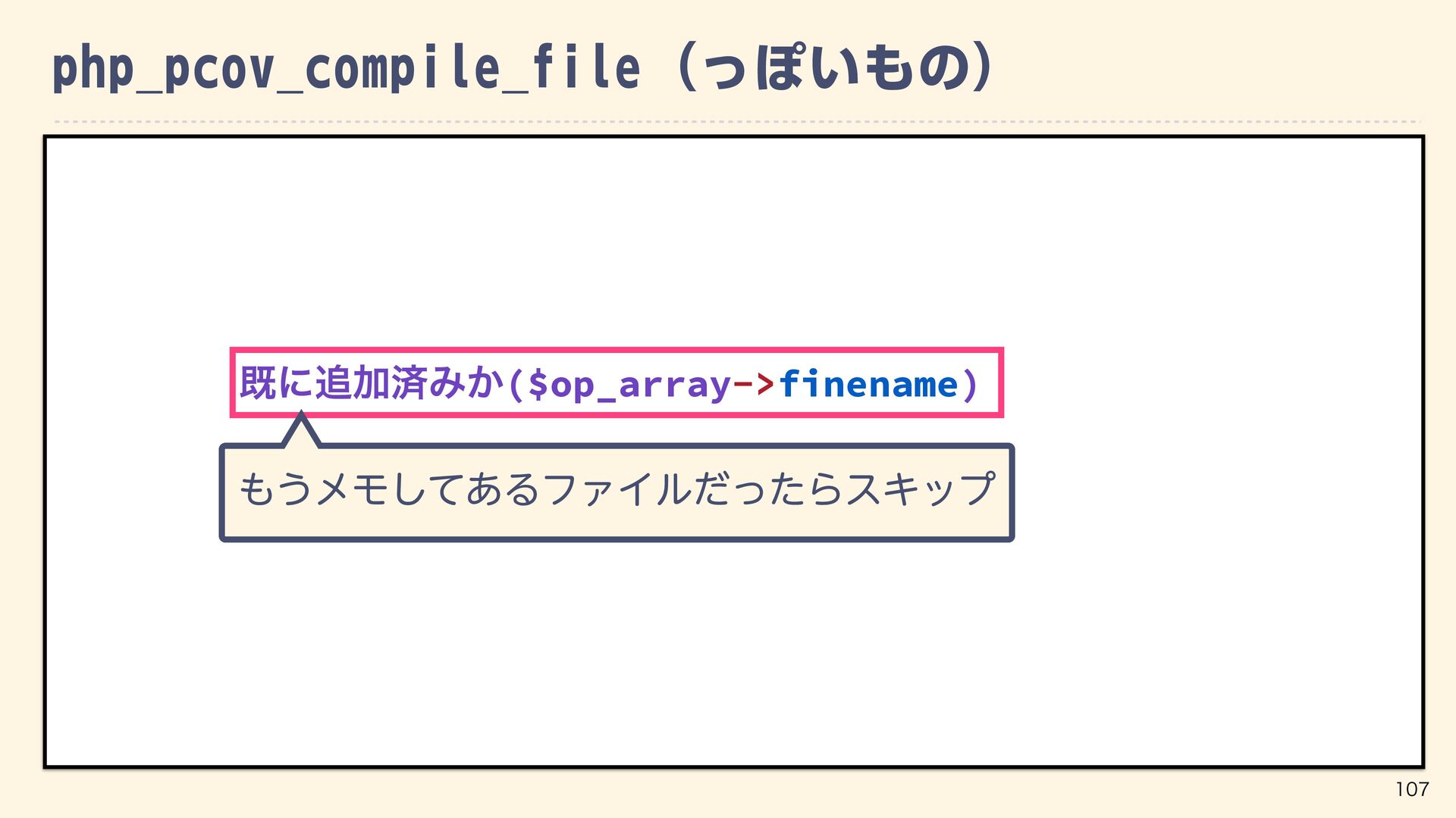 zendCompilerඪ४ͷॲཧ($file, $type); if (!$op_array || !$op_array->filename || !ଌఆର৅ʹؚΊ͍͍͔ͯ($op_array->finename) || طʹ௥ՃࡁΈ͔($op_array->finename) ) { return $op_array; } ଌఆର৅ϑΝΠϧʹ௥Ճ($op_array->filename); /** GCपΓͷॲཧ͕ίίʹೖ͍ͬͯΔ */ return $op_array; }  ଌఆର৅ϑΝΠϧʹ௥Ճ($op_array->filename); ココが肝!!