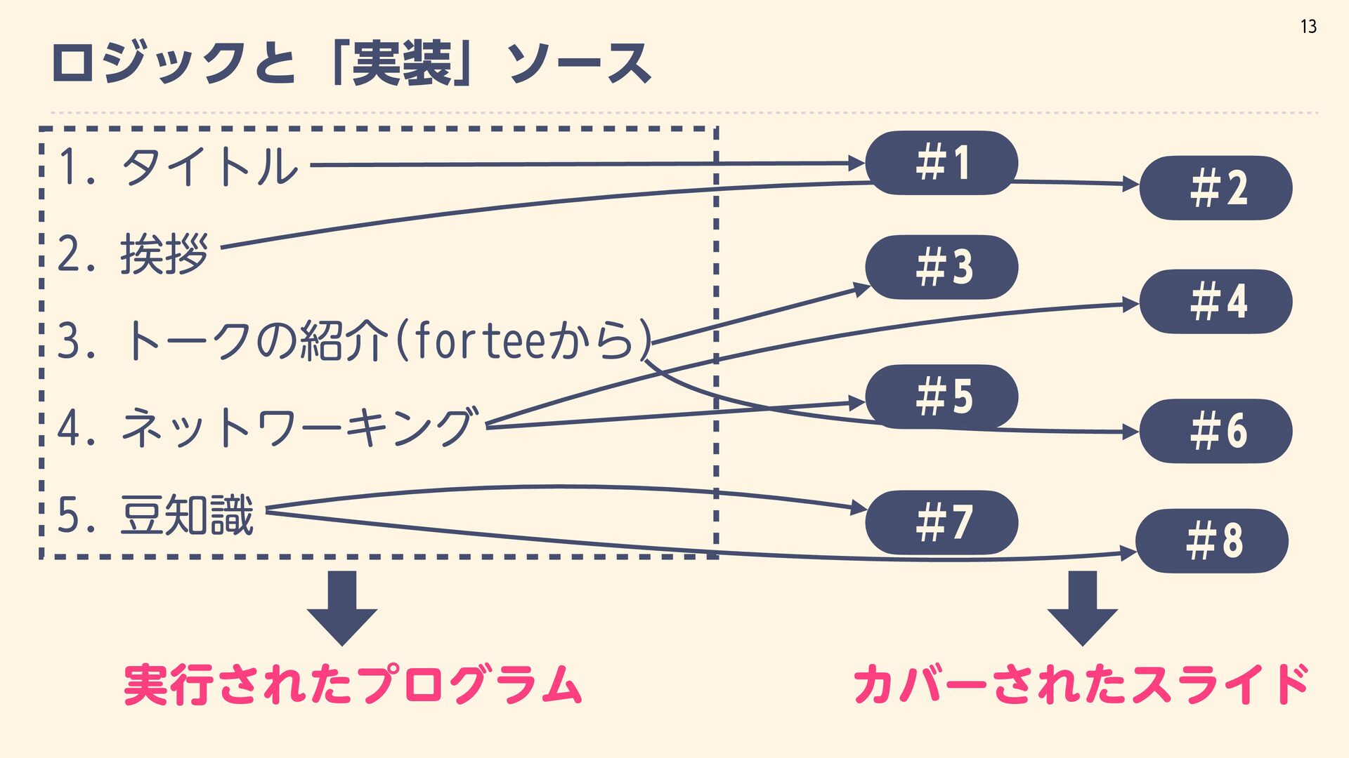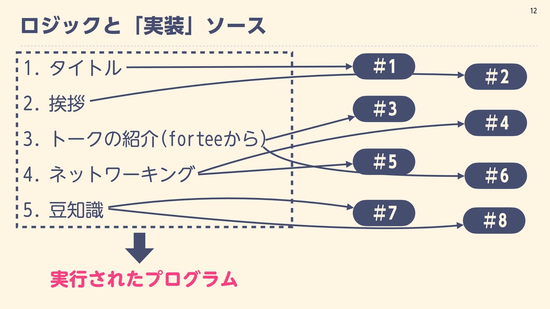 2. ロジックと「実装」ソース 13 実行されたプログラム 1. タイトル 2. 挨拶 3. トークの紹介(forteeから) 4.