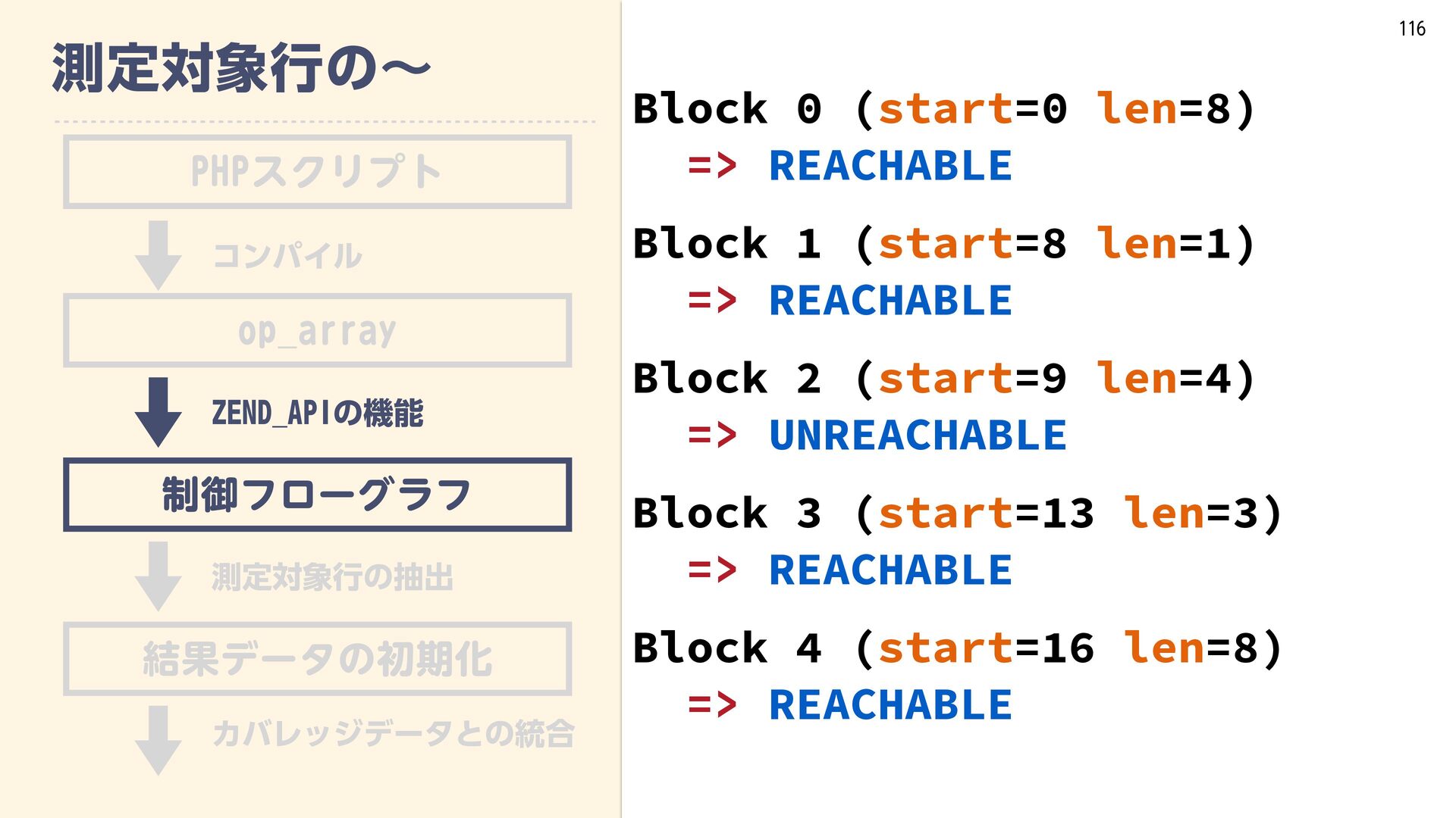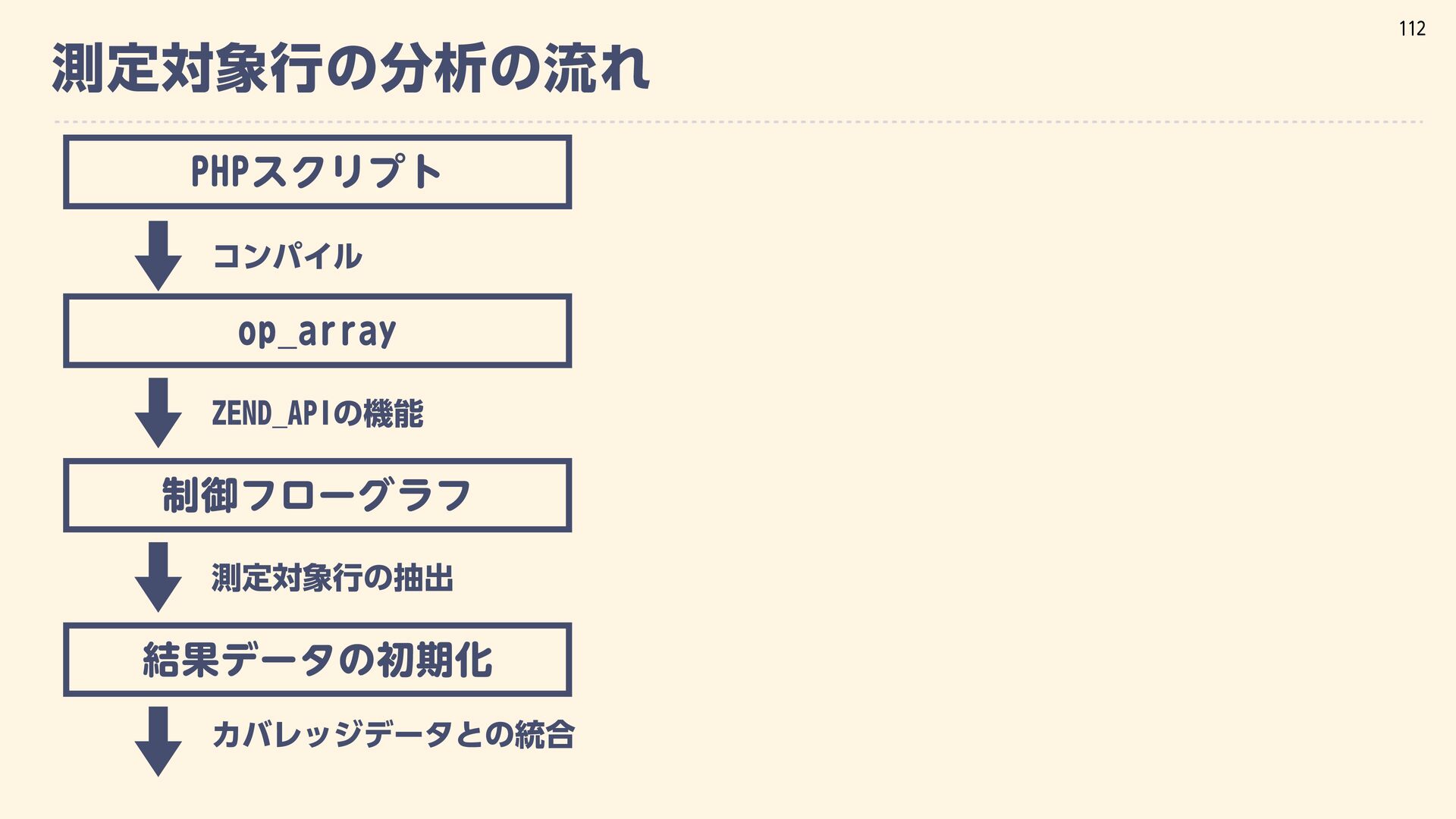 55. 測定対象行の〜 116 op_array 結果データの初期化 コンパイル 測定対象行の抽出 カバレッジデータとの統合 PHPスクリプト 制御フローグラフ ZEND_APIの機能