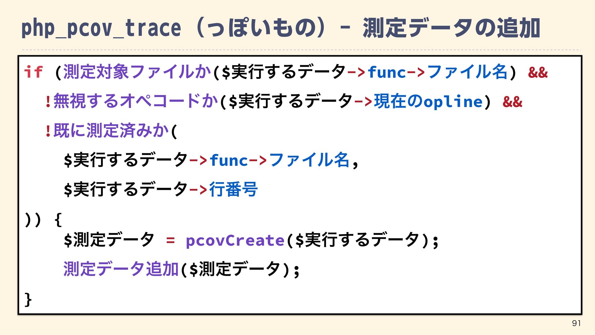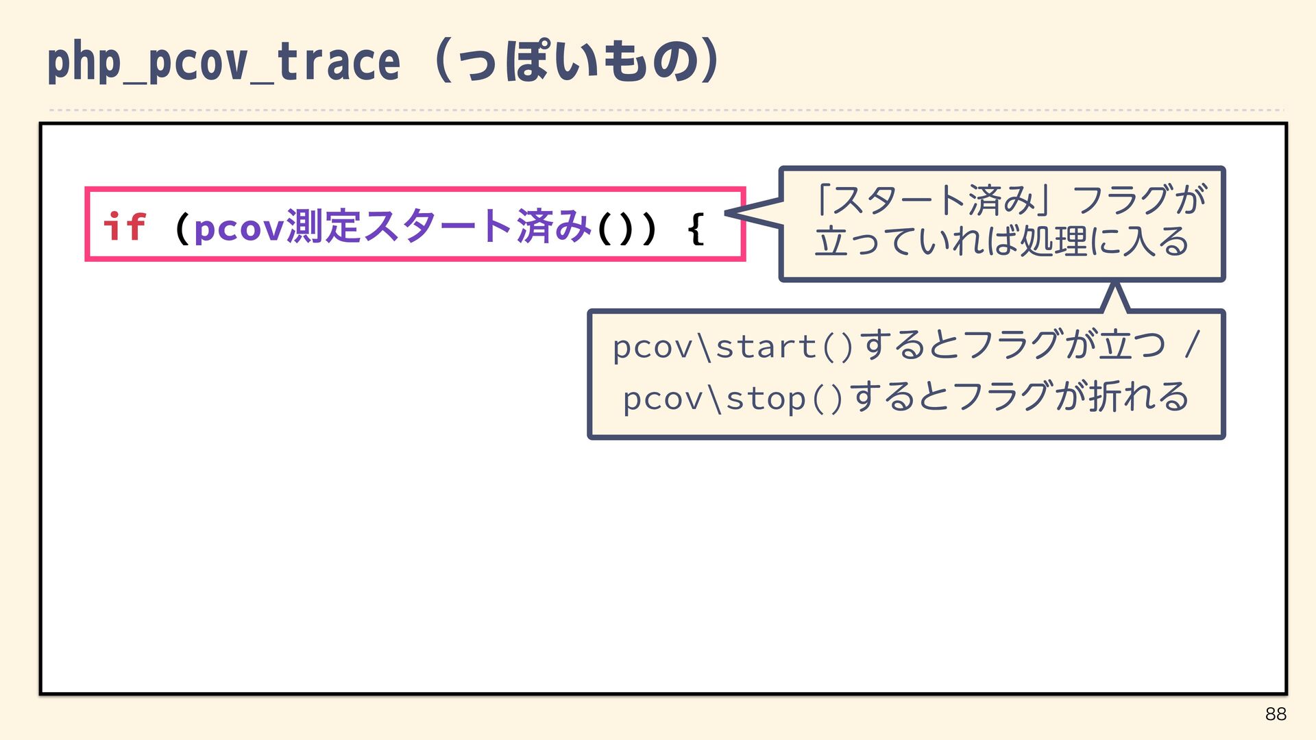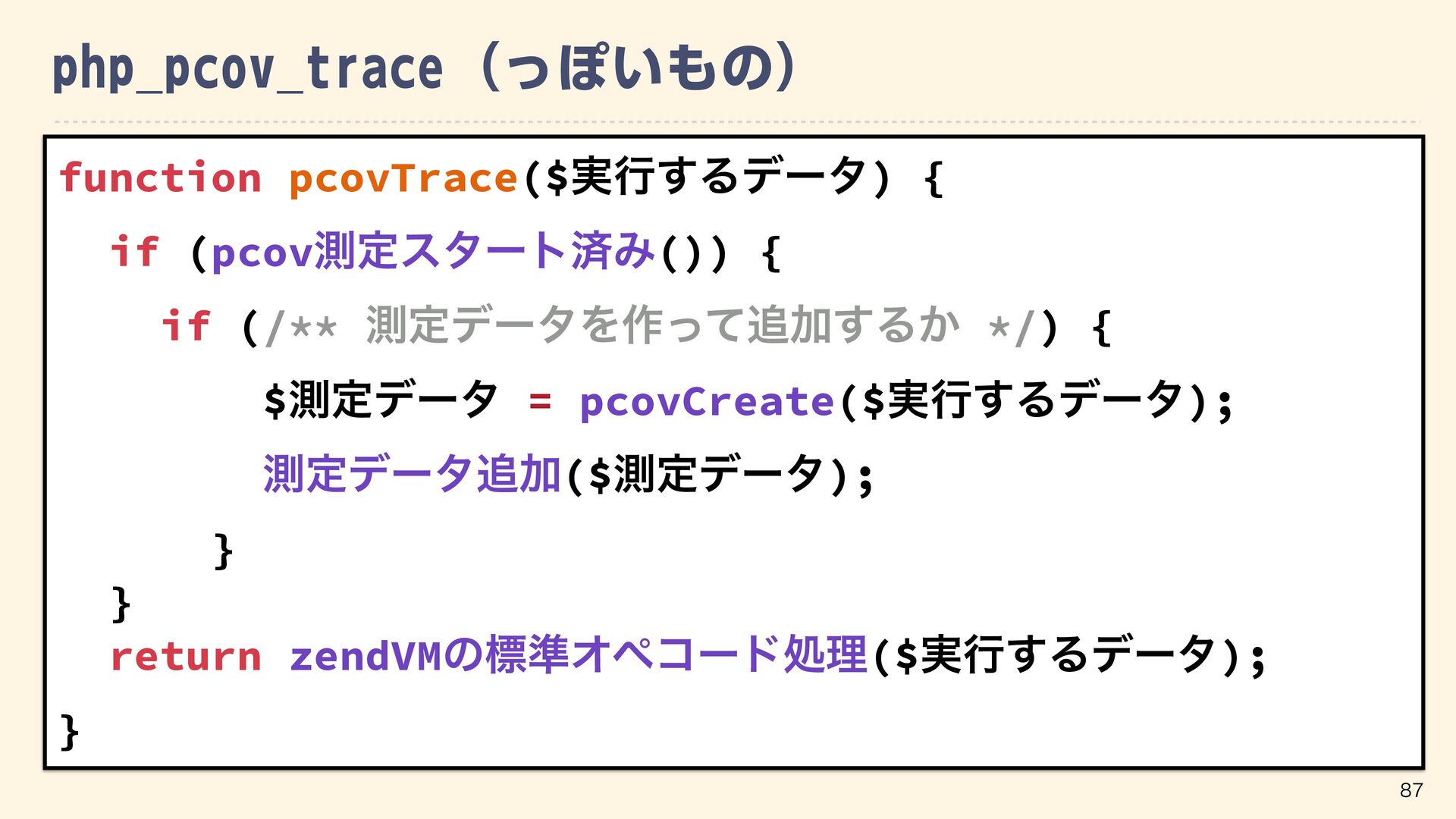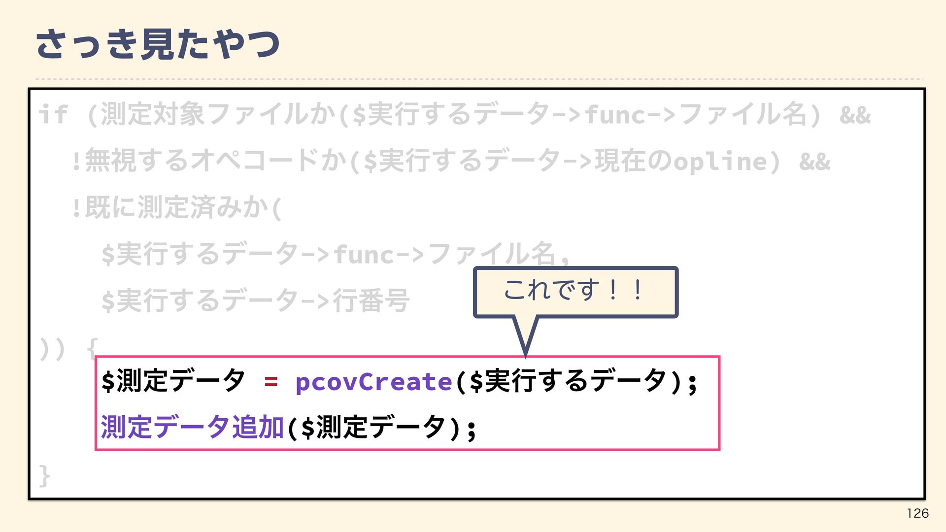 ଌఆσʔλΛ࡞ͬͯ௥Ճ͢Δ͔ */) { $ଌఆσʔλ = pcovCreate($࣮ߦ͢Δσʔλ); ଌఆσʔλ௥Ճ($ଌఆσʔλ); } } return zendVMͷඪ४Φϖίʔυॲཧ($࣮ߦ͢Δσʔλ); }  if (pcovଌఆελʔτࡁΈ()) { pcov\start()するとフラグが立つ / pcov\stop()するとフラグが折れる 「スタート済み」フラグが 立っていれば処理に入る