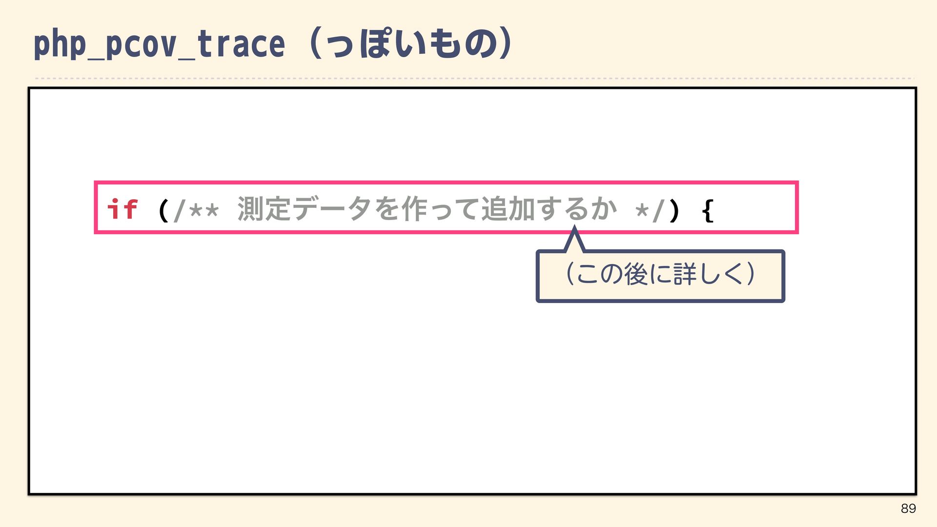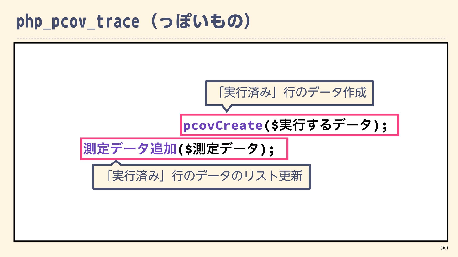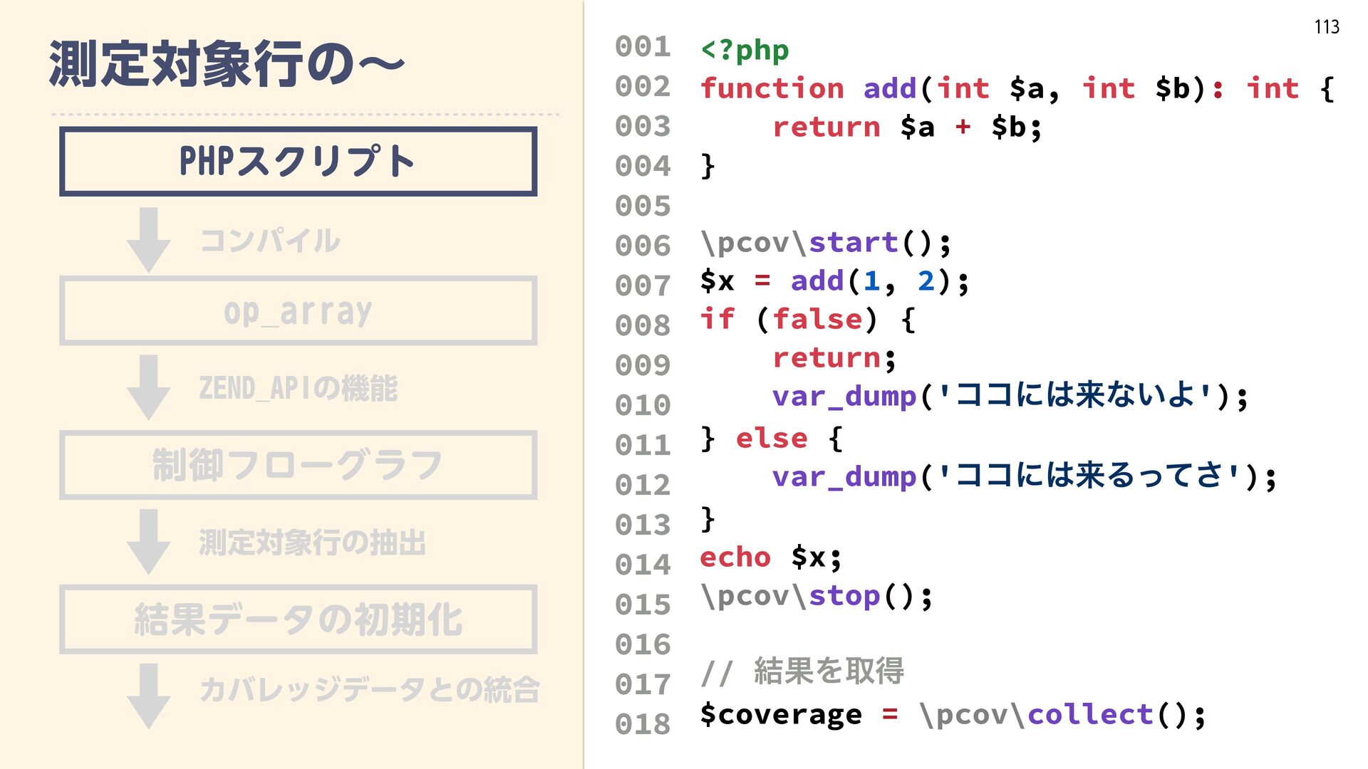 ଌఆσʔλΛ࡞ͬͯ௥Ճ͢Δ͔ */) { $ଌఆσʔλ = pcovCreate($࣮ߦ͢Δσʔλ); ଌఆσʔλ௥Ճ($ଌఆσʔλ); } } return zendVMͷඪ४Φϖίʔυॲཧ($࣮ߦ͢Δσʔλ); }  if (pcovଌఆελʔτࡁΈ()) { pcov\start()するとフラグが立つ / pcov\stop()するとフラグが折れる 「スタート済み」フラグが 立っていれば処理に入る