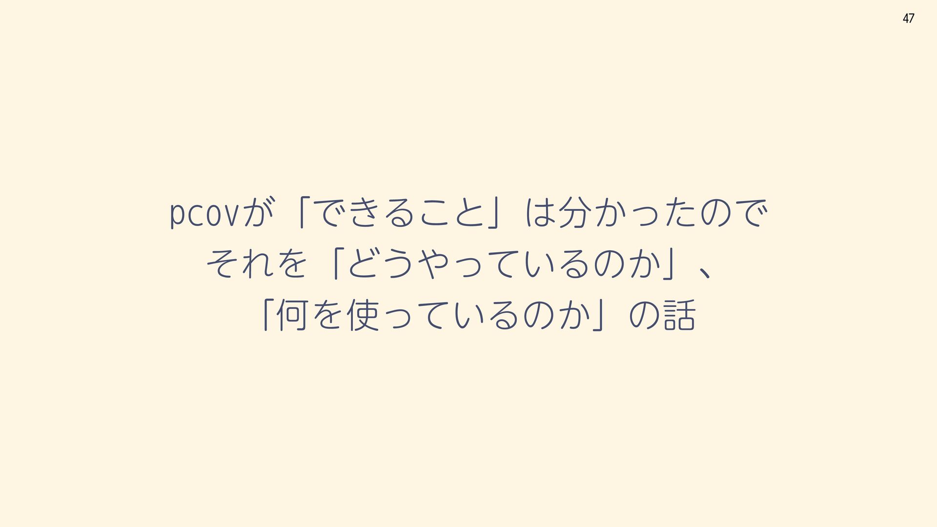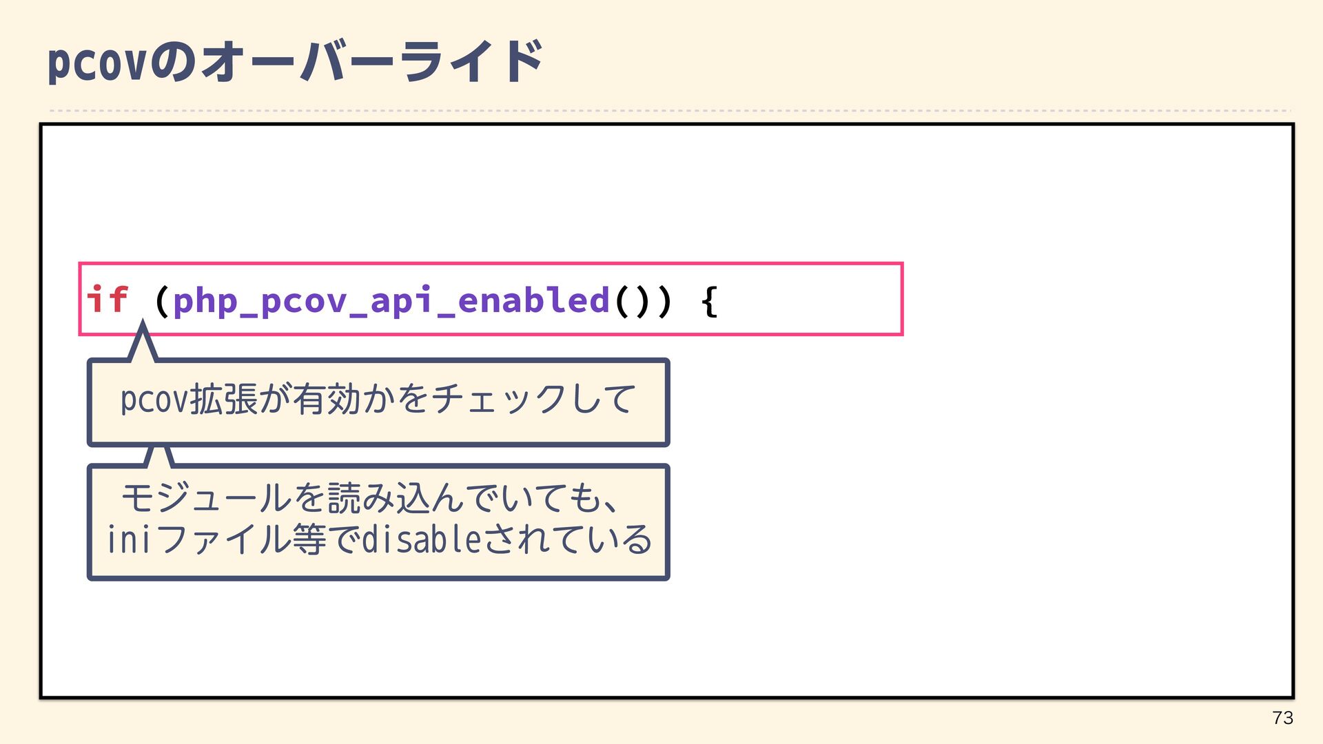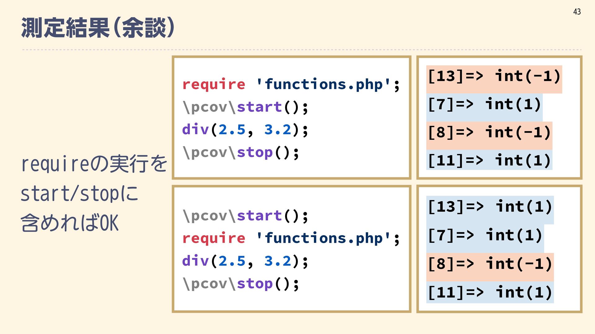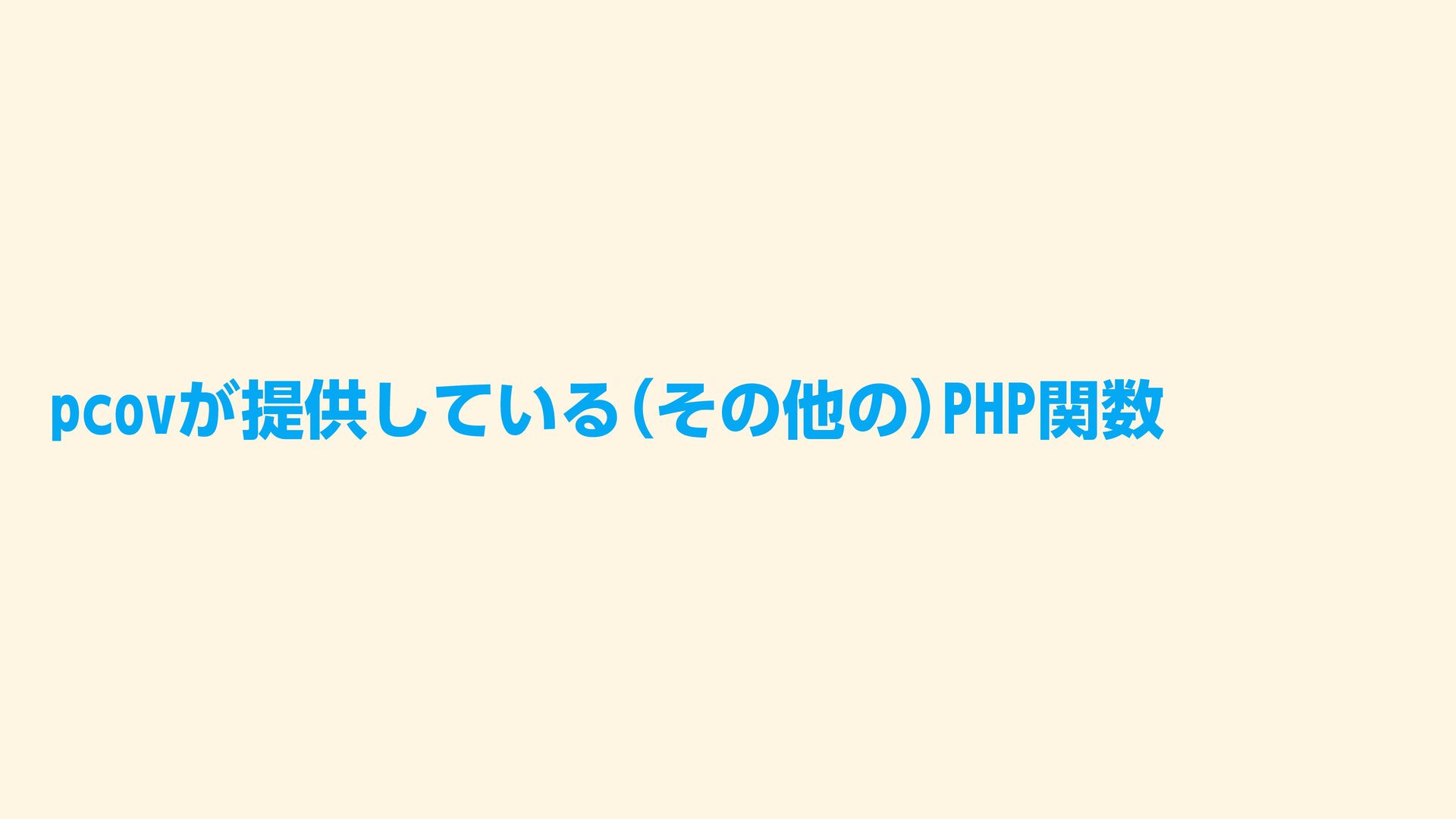 ଌఆσʔλΛ࡞ͬͯ௥Ճ͢Δ͔ */) { $ଌఆσʔλ = pcovCreate($࣮ߦ͢Δσʔλ); ଌఆσʔλ௥Ճ($ଌఆσʔλ); } } return zendVMͷඪ४Φϖίʔυॲཧ($࣮ߦ͢Δσʔλ); }  if (pcovଌఆελʔτࡁΈ()) { pcov\start()するとフラグが立つ / pcov\stop()するとフラグが折れる 「スタート済み」フラグが 立っていれば処理に入る