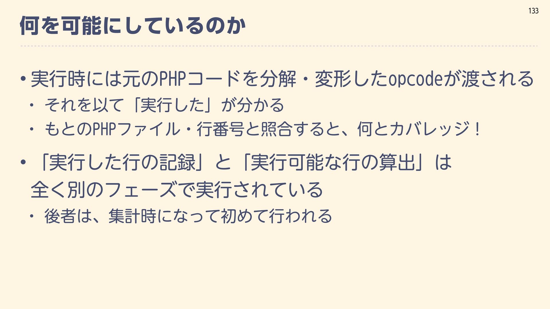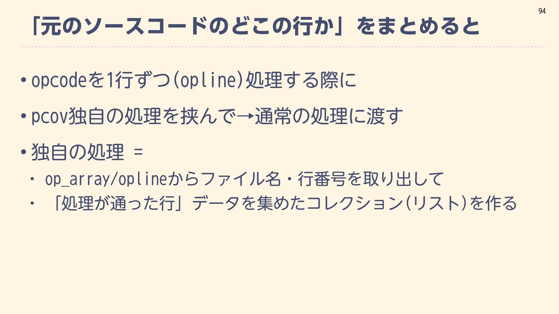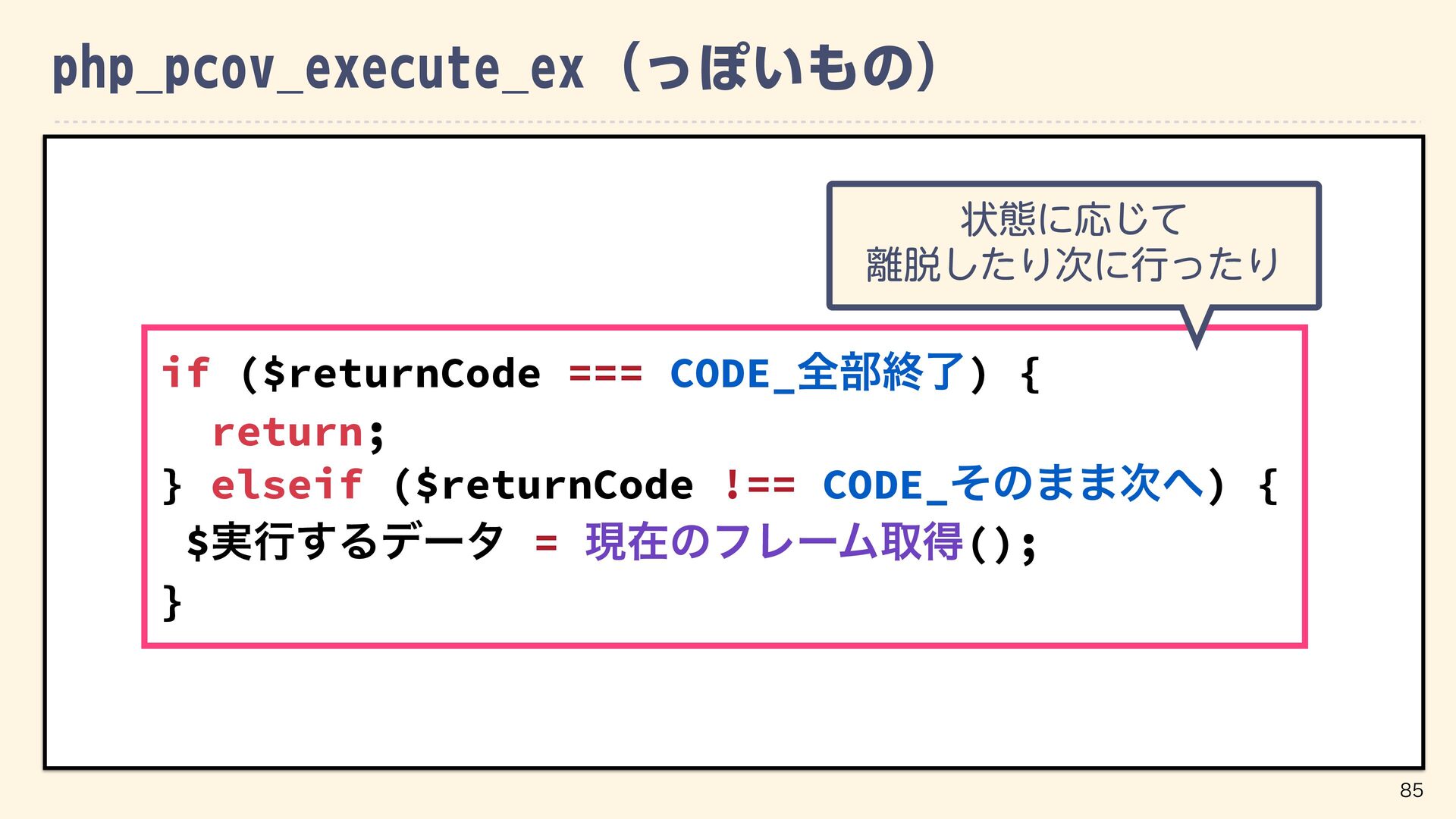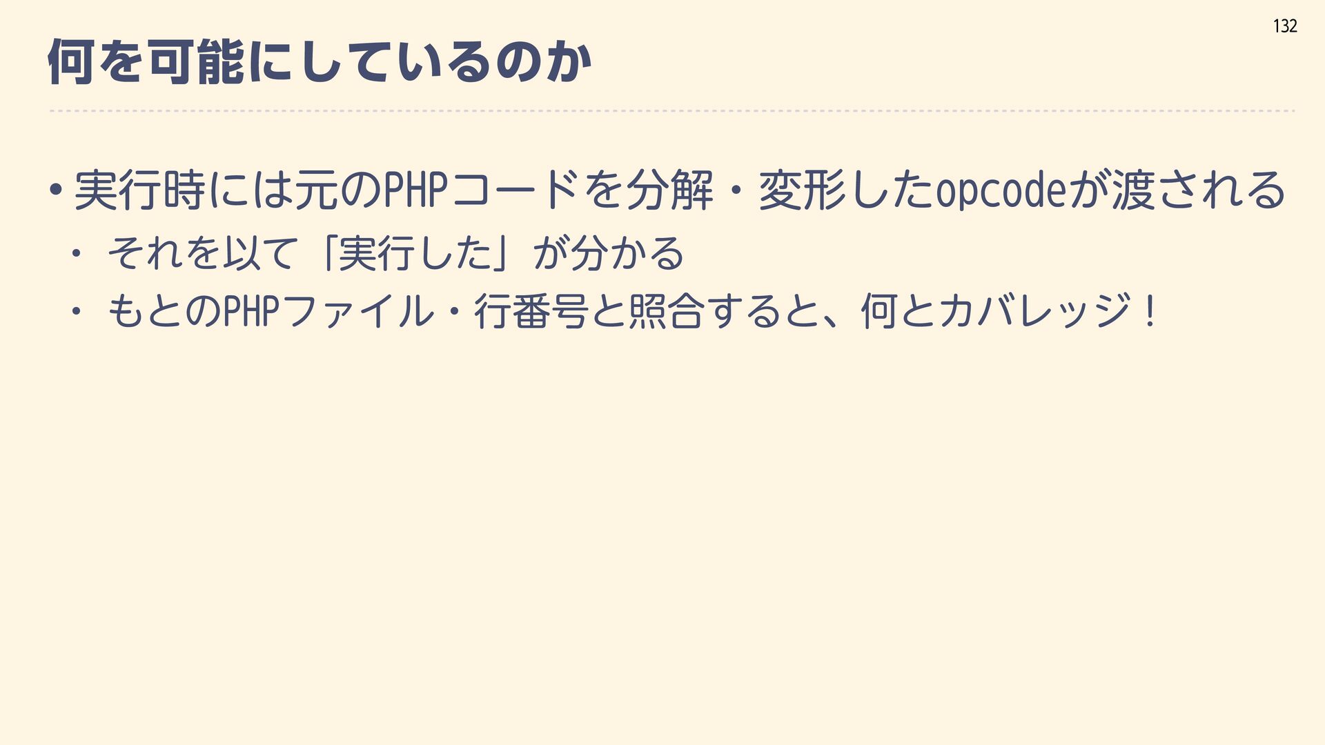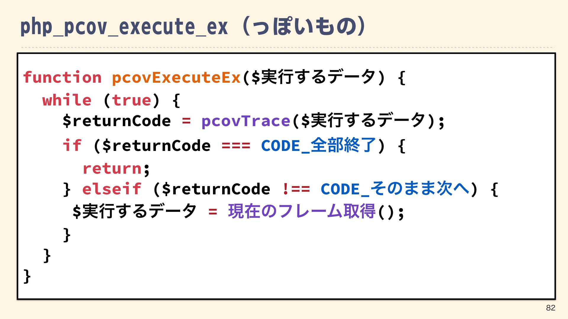 pcovTrace($࣮ߦ͢Δσʔλ); if ($returnCode === CODE_શ෦ऴྃ) { return; } elseif ($returnCode !== CODE_ͦͷ··࣍΁) { $࣮ߦ͢Δσʔλ = ݱࡏͷϑϨʔϜऔಘ(); } } }  pcovTrace($࣮ߦ͢Δσʔλ); opcodeを1ステップずつ実行 対応するPHPスクリプトの行を記録 実行結果状態を返す