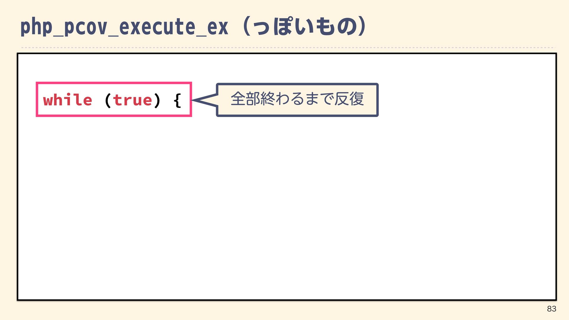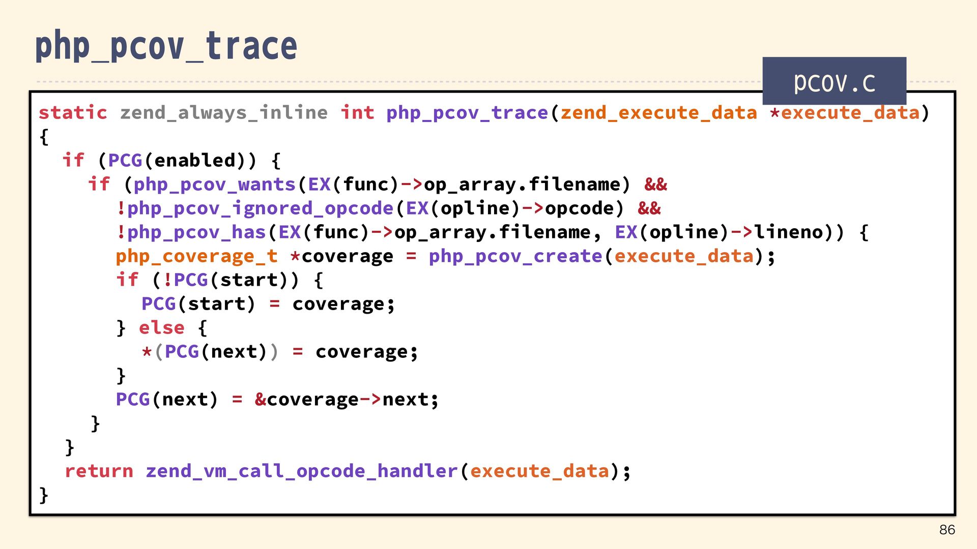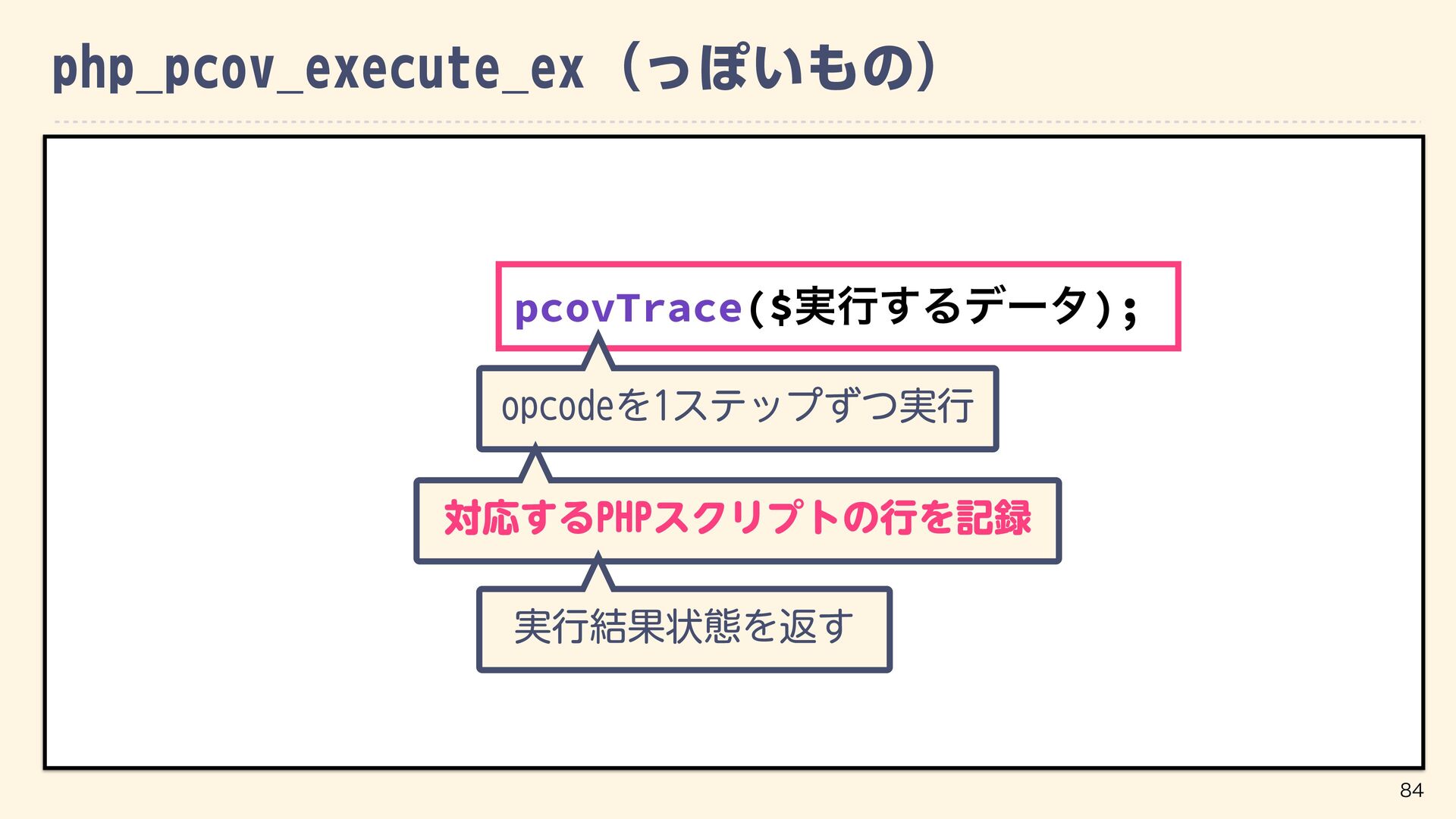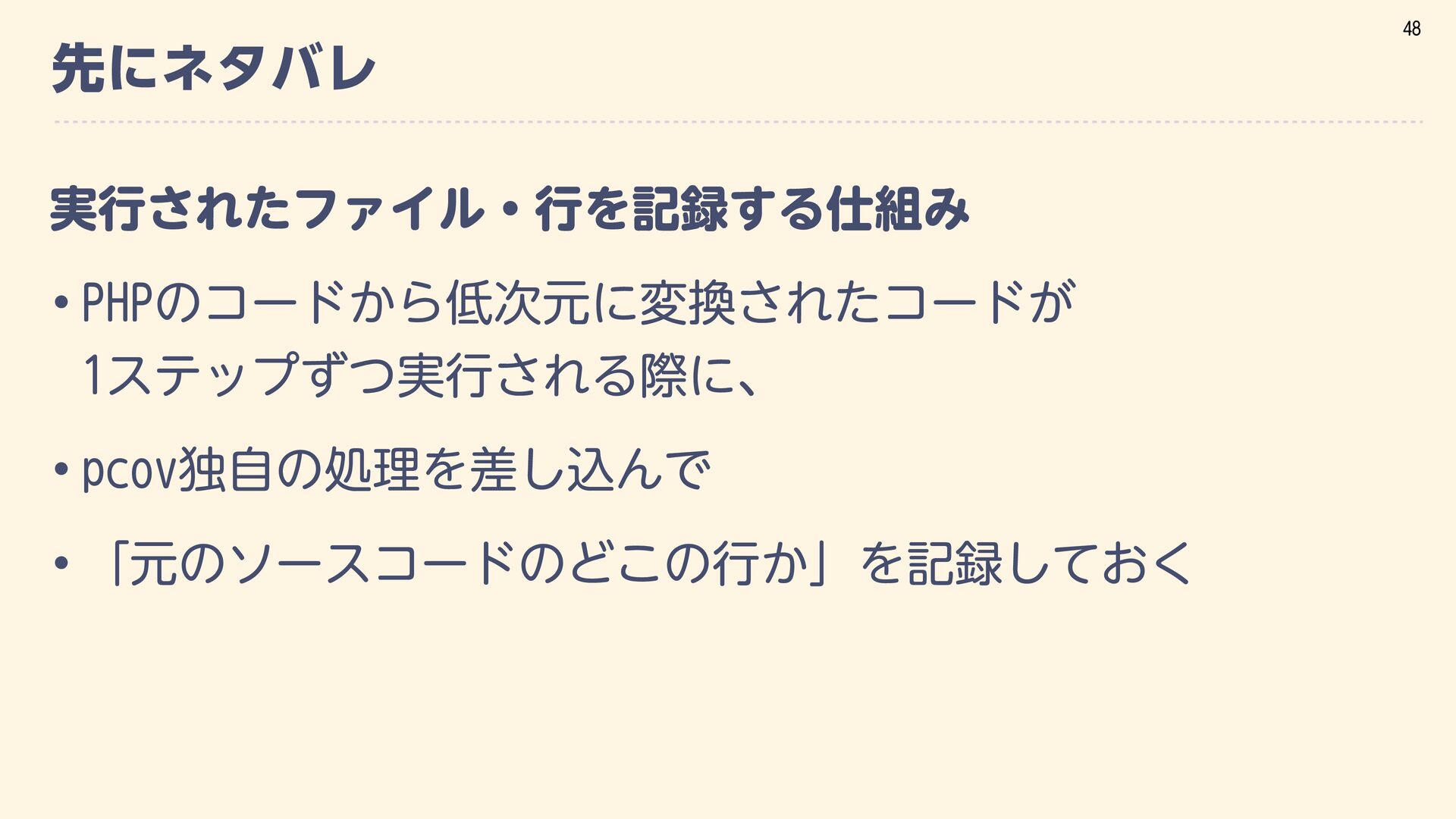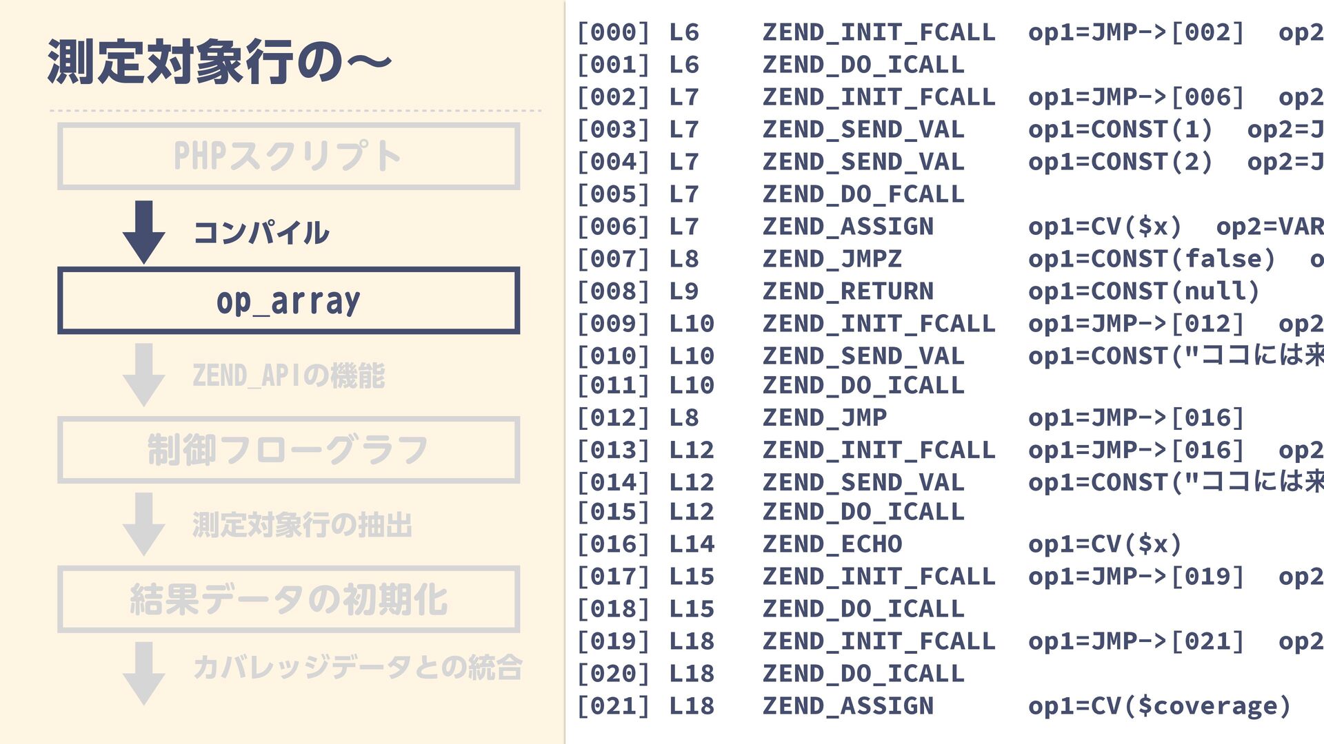 pcovTrace($࣮ߦ͢Δσʔλ); if ($returnCode === CODE_શ෦ऴྃ) { return; } elseif ($returnCode !== CODE_ͦͷ··࣍΁) { $࣮ߦ͢Δσʔλ = ݱࡏͷϑϨʔϜऔಘ(); } } }  pcovTrace($࣮ߦ͢Δσʔλ); opcodeを1ステップずつ実行 対応するPHPスクリプトの行を記録 実行結果状態を返す