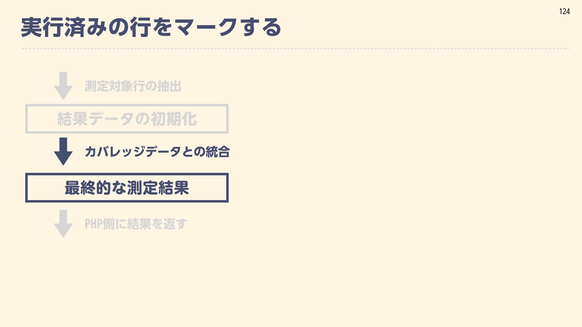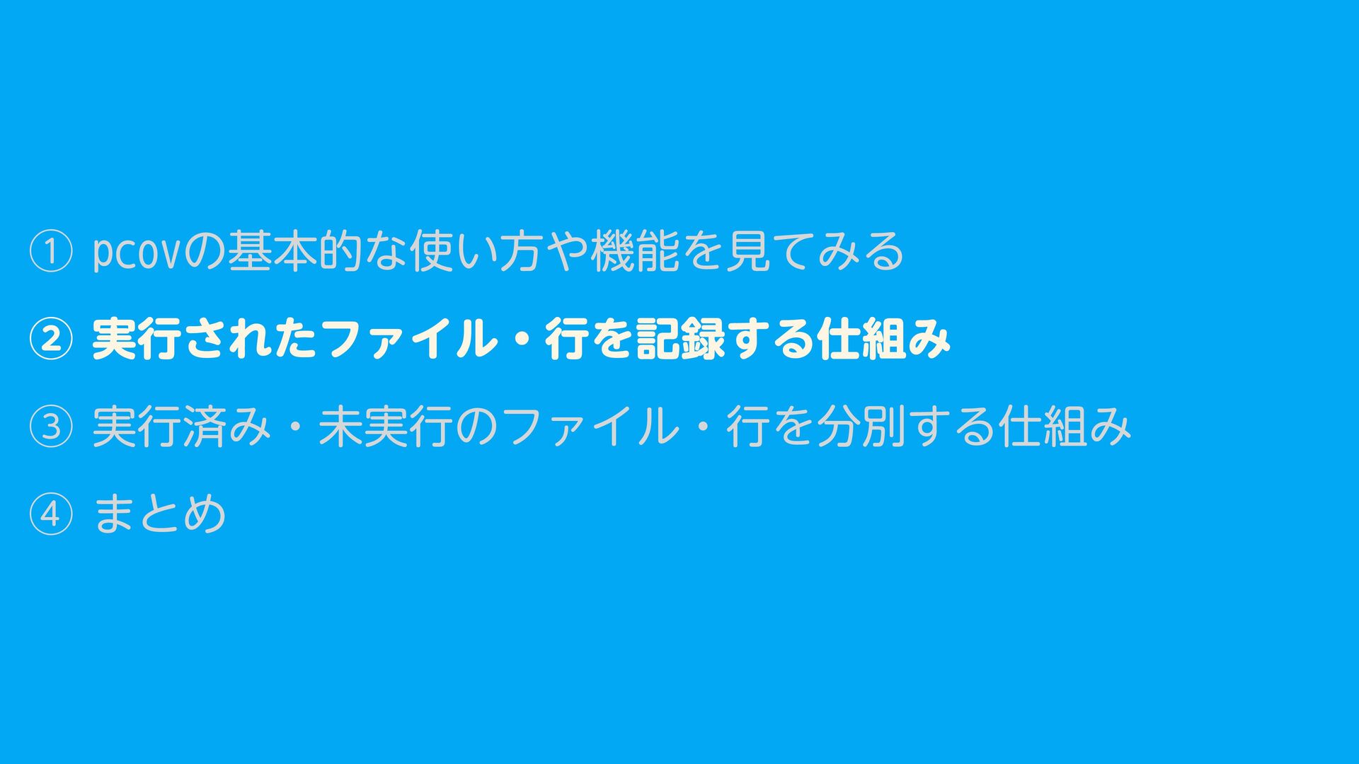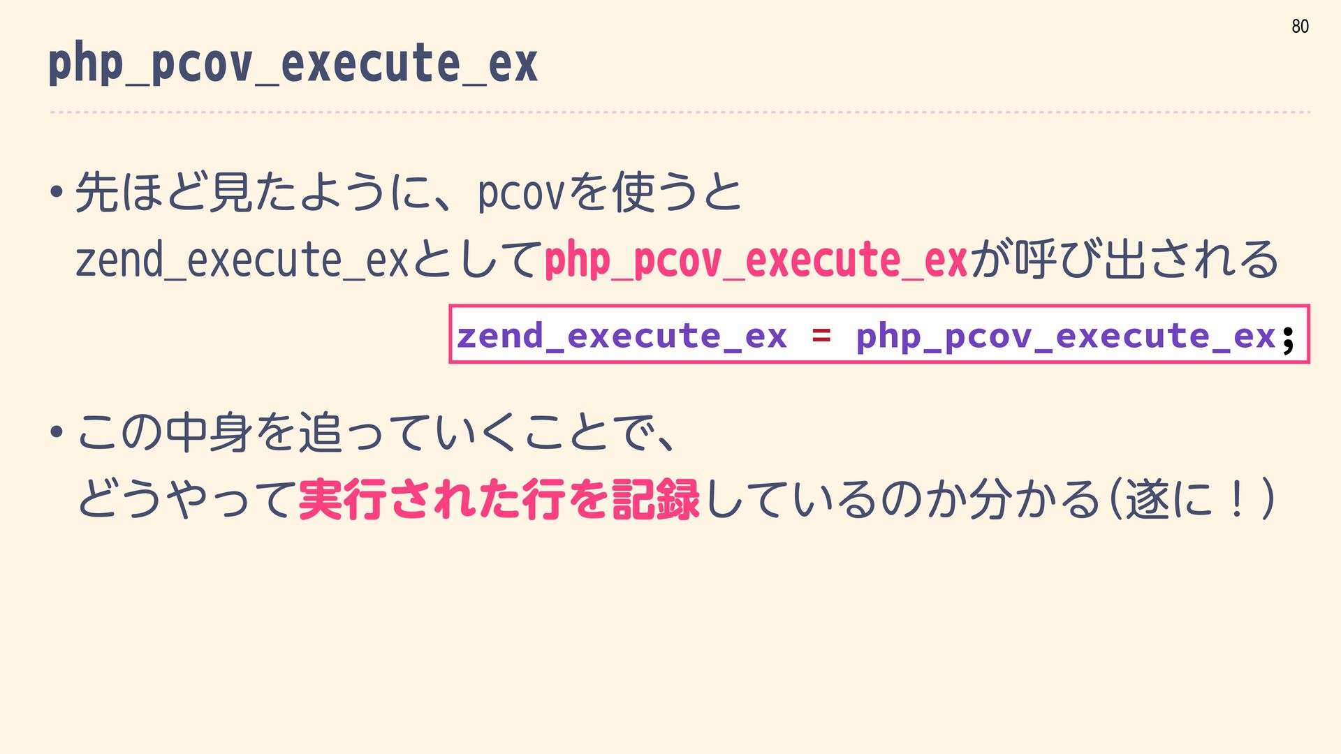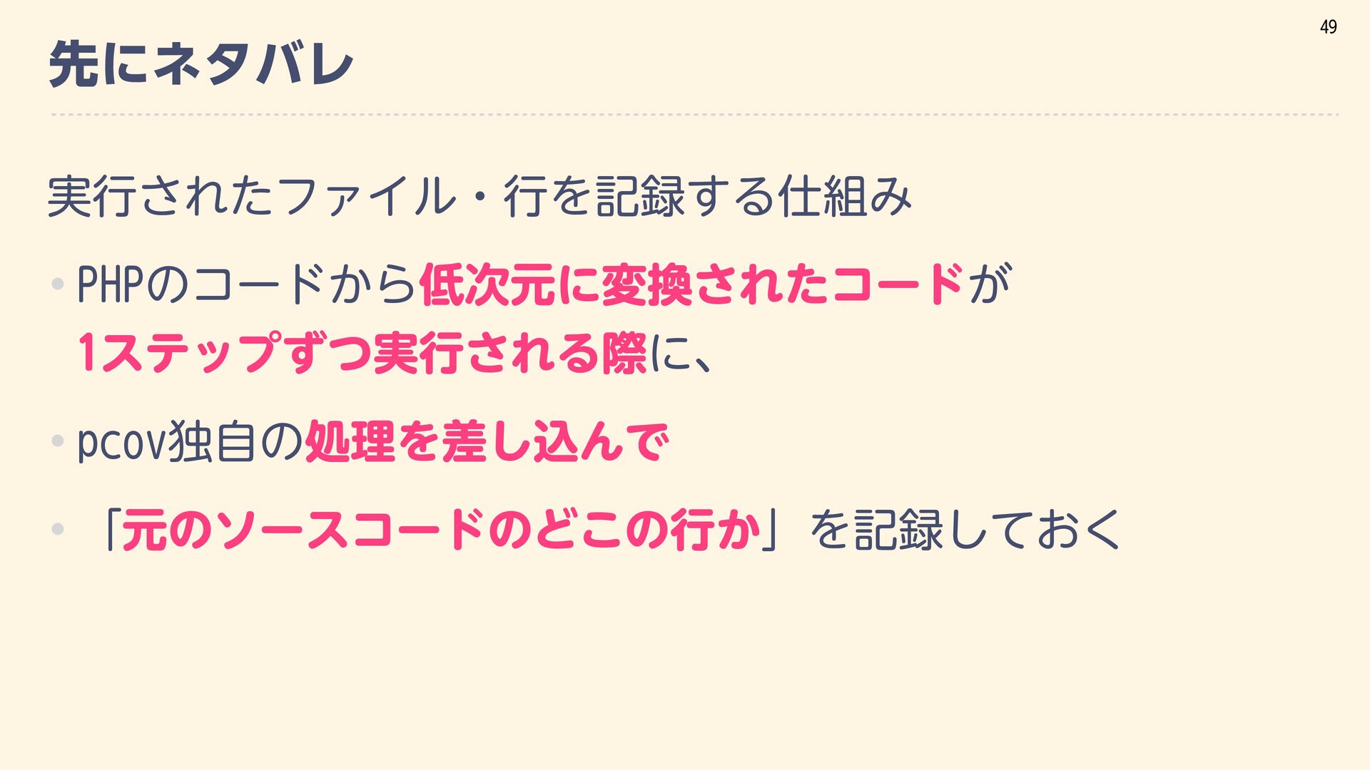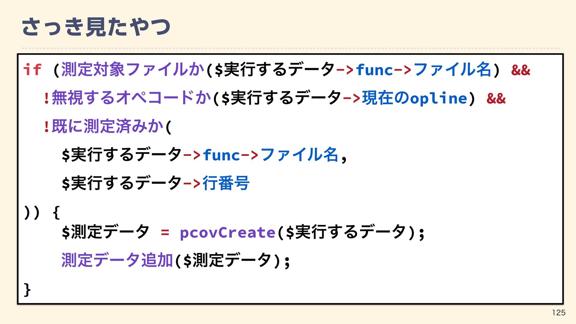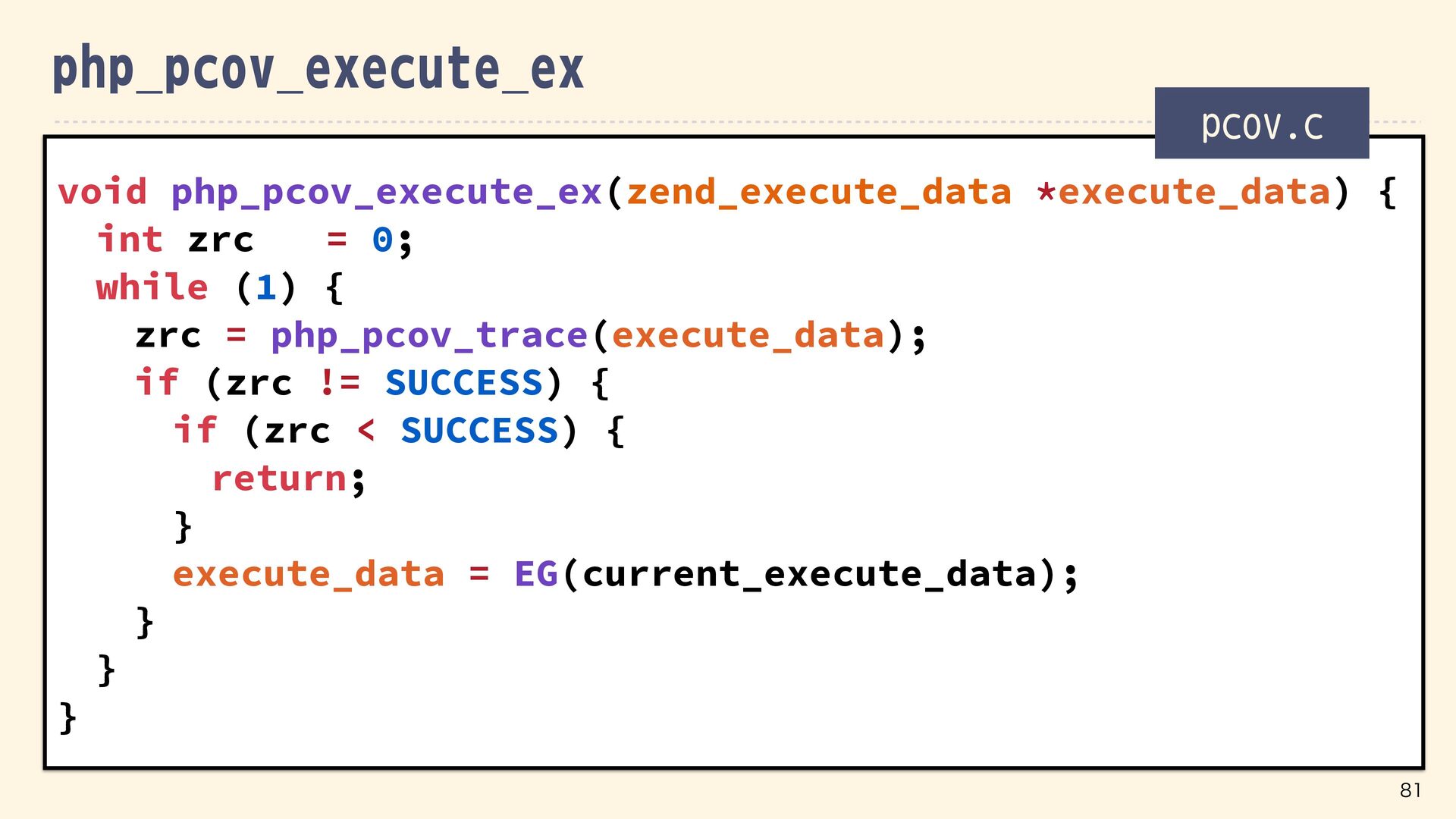 pcovTrace($࣮ߦ͢Δσʔλ); if ($returnCode === CODE_શ෦ऴྃ) { return; } elseif ($returnCode !== CODE_ͦͷ··࣍΁) { $࣮ߦ͢Δσʔλ = ݱࡏͷϑϨʔϜऔಘ(); } } }  pcovTrace($࣮ߦ͢Δσʔλ); opcodeを1ステップずつ実行 対応するPHPスクリプトの行を記録 実行結果状態を返す