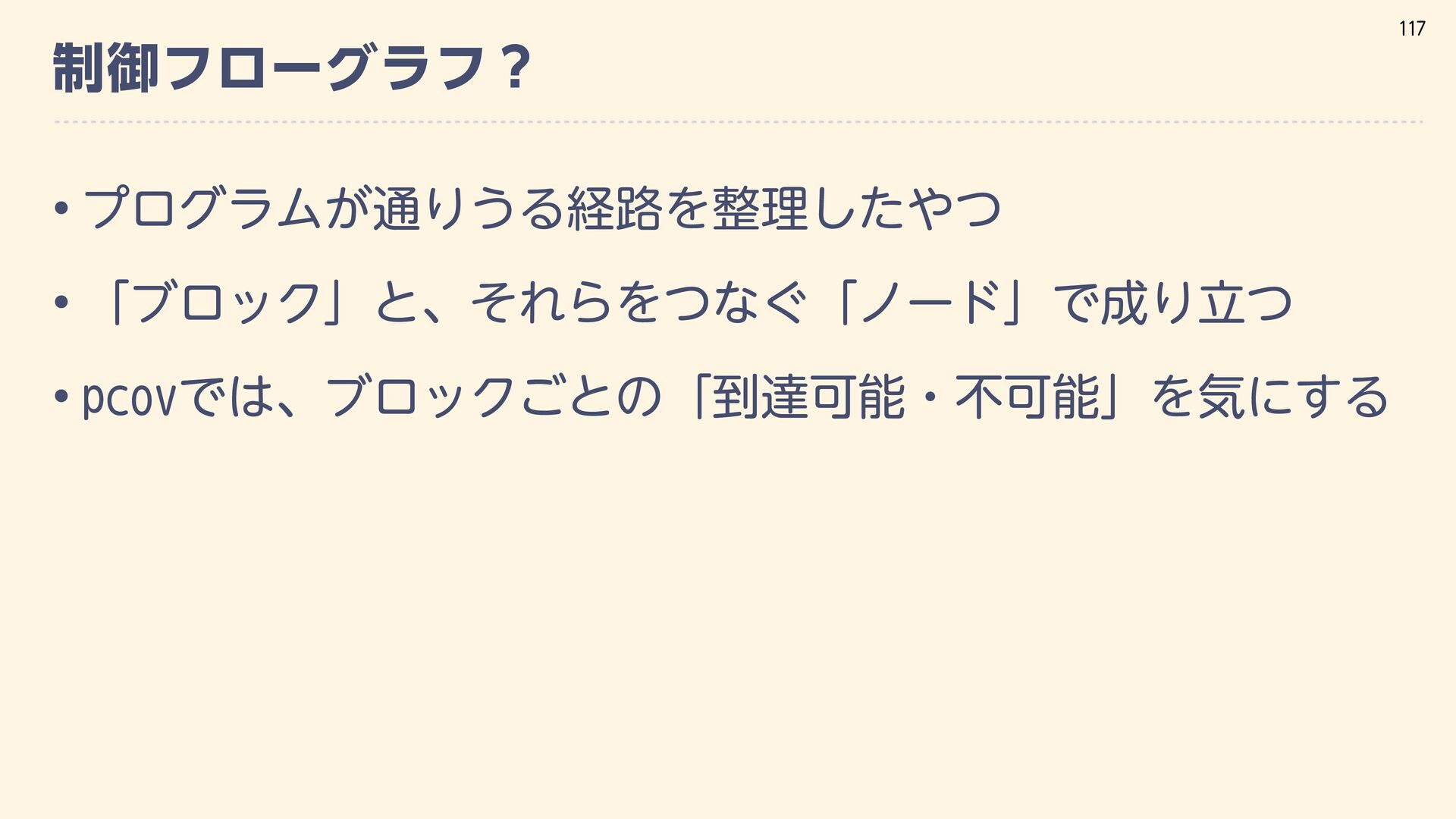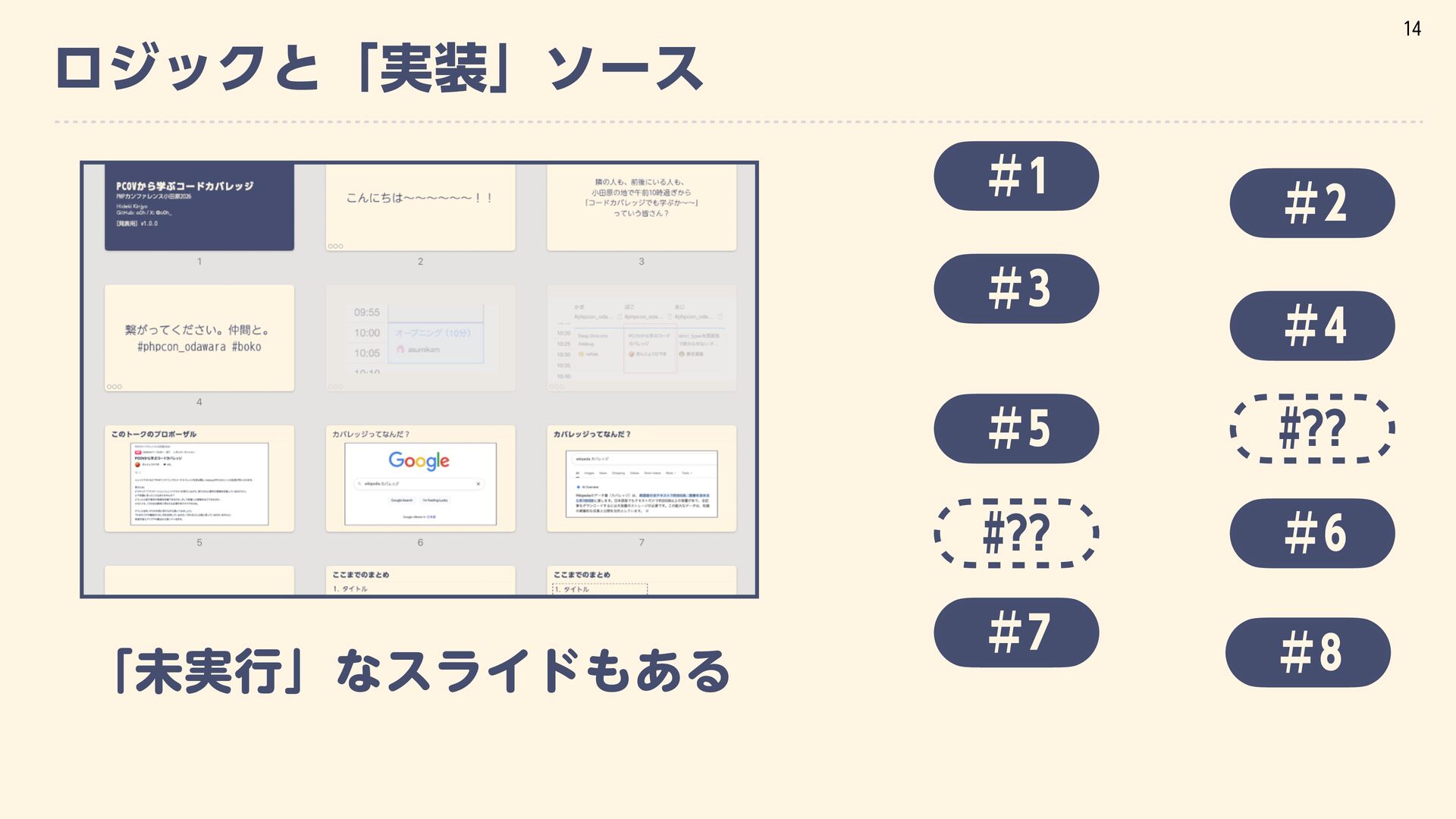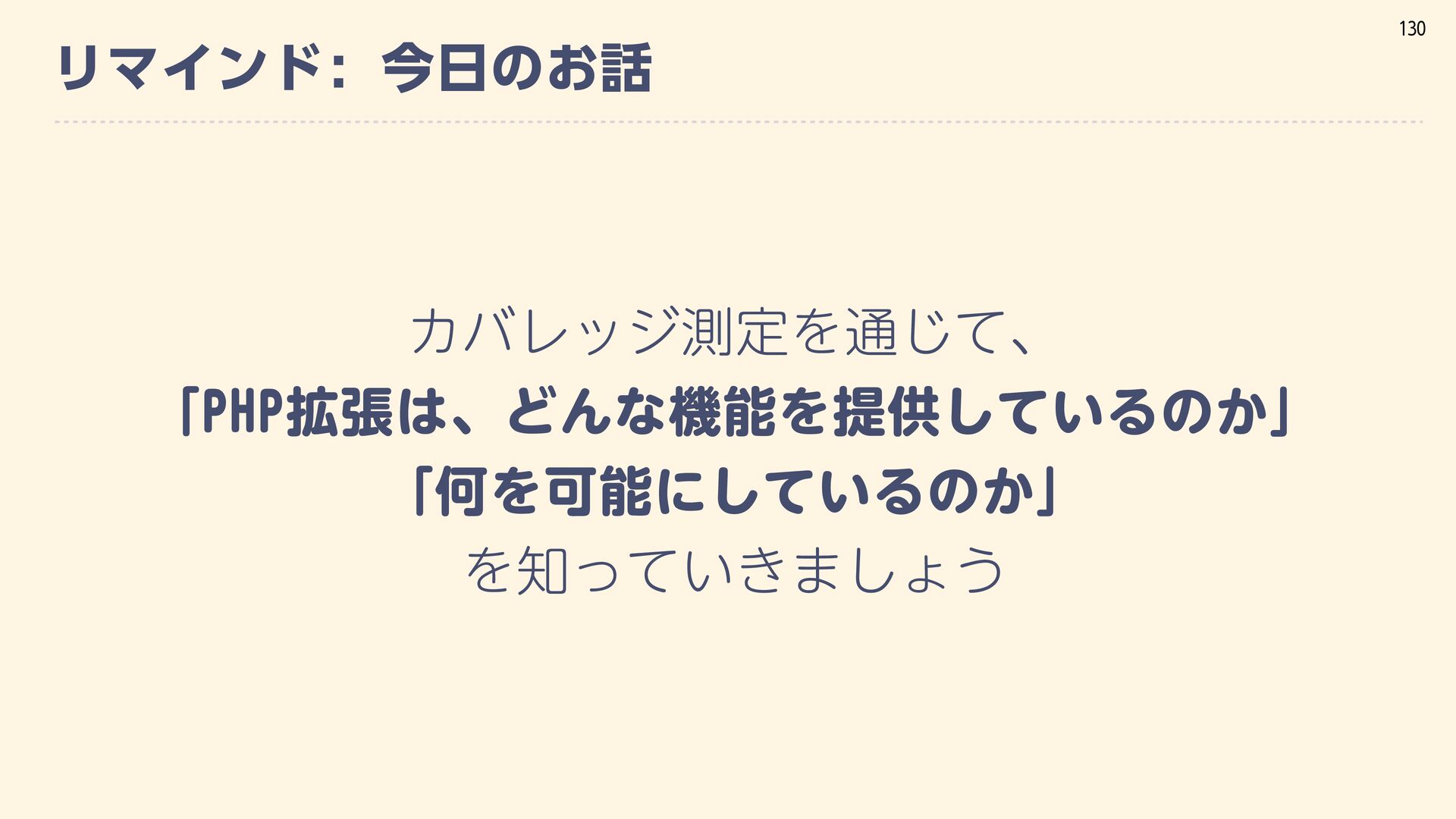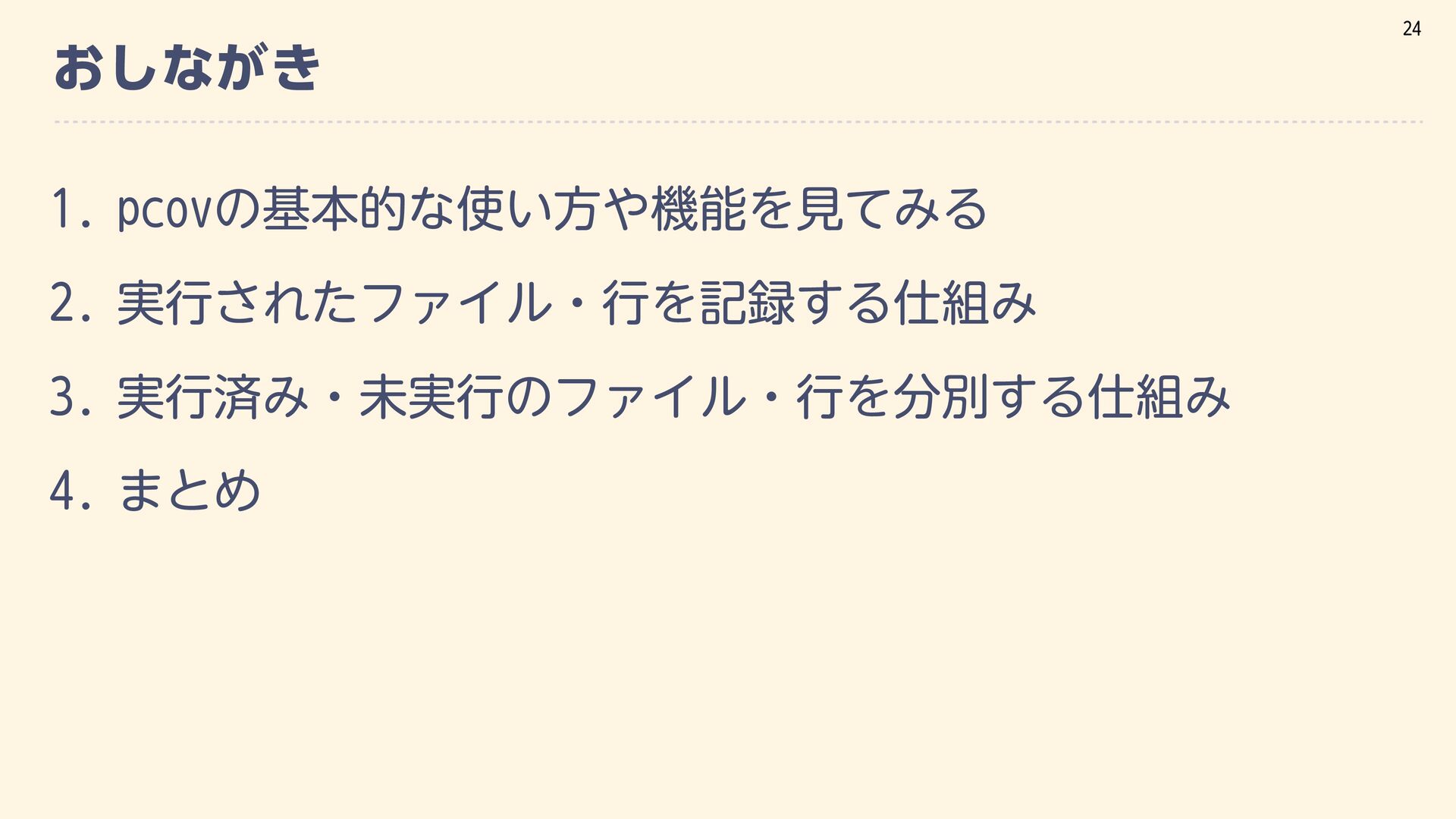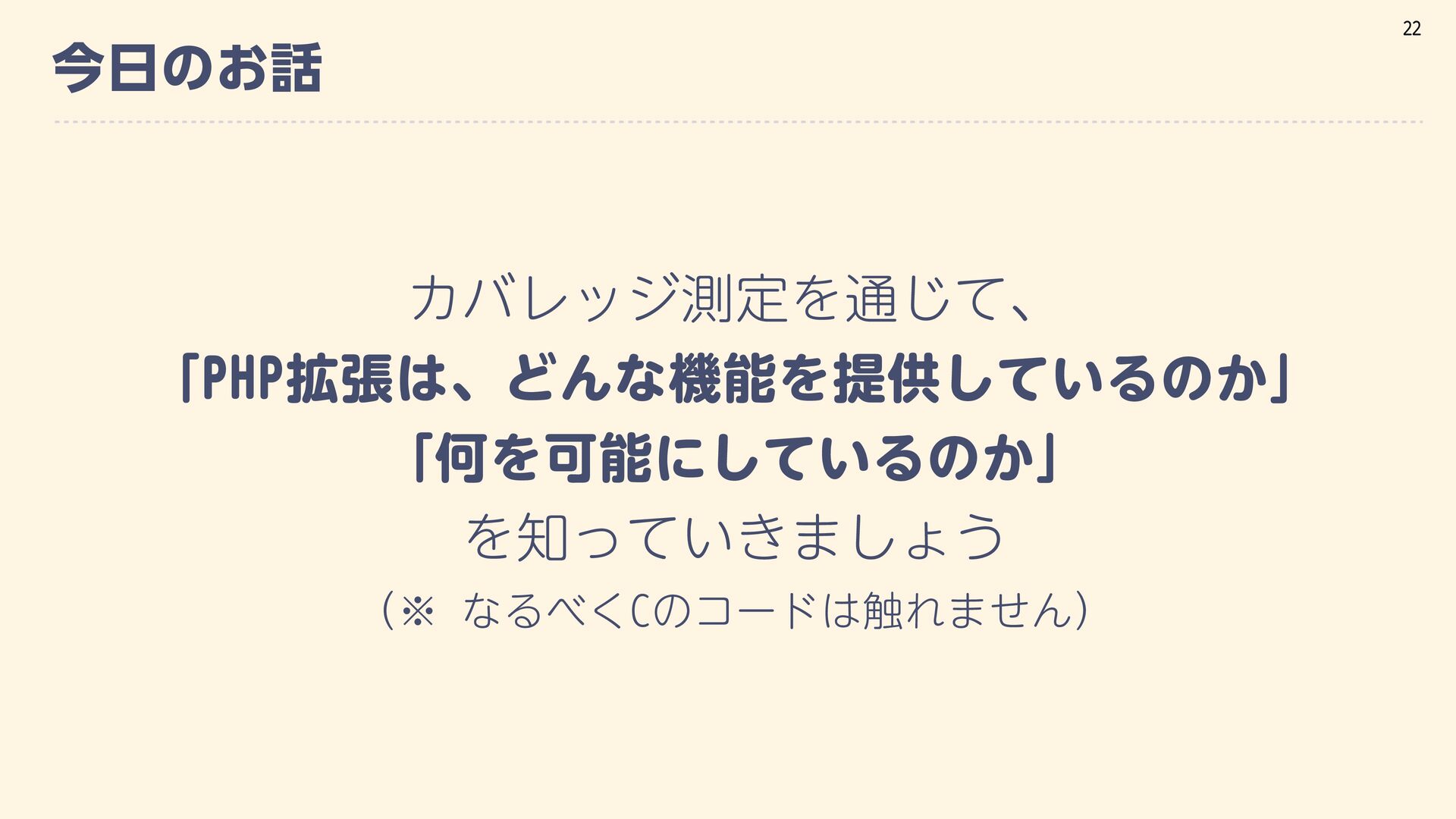 pcovTrace($࣮ߦ͢Δσʔλ); if ($returnCode === CODE_શ෦ऴྃ) { return; } elseif ($returnCode !== CODE_ͦͷ··࣍΁) { $࣮ߦ͢Δσʔλ = ݱࡏͷϑϨʔϜऔಘ(); } } }  pcovTrace($࣮ߦ͢Δσʔλ); opcodeを1ステップずつ実行 対応するPHPスクリプトの行を記録 実行結果状態を返す