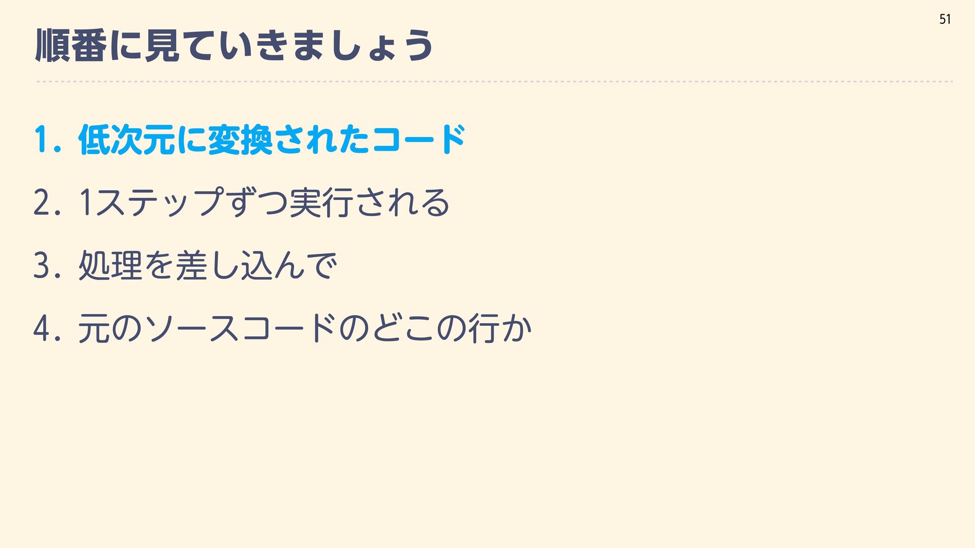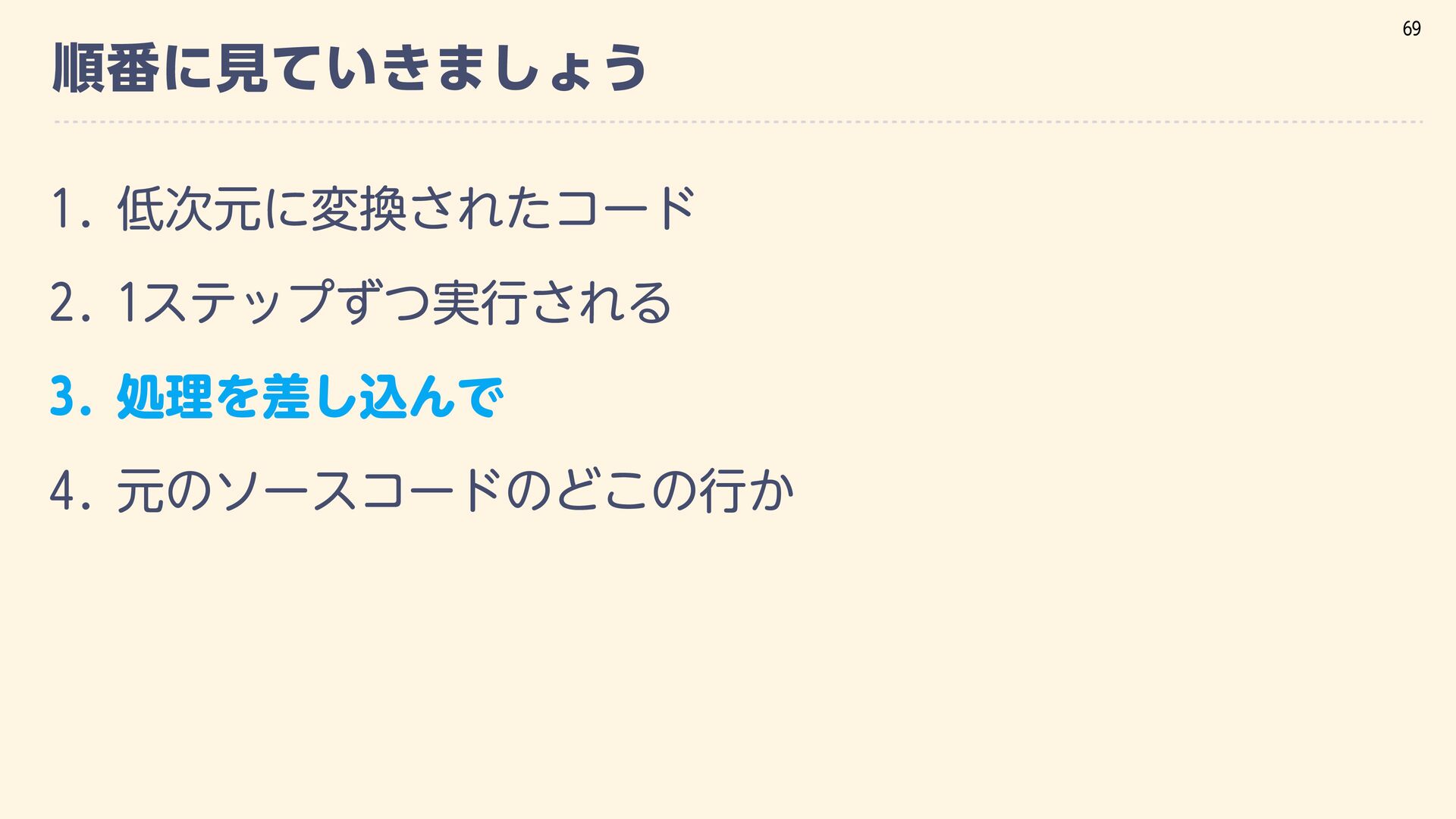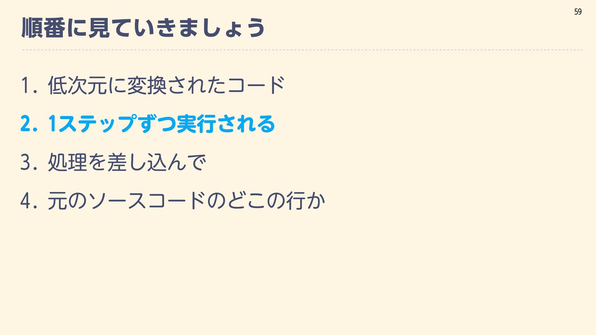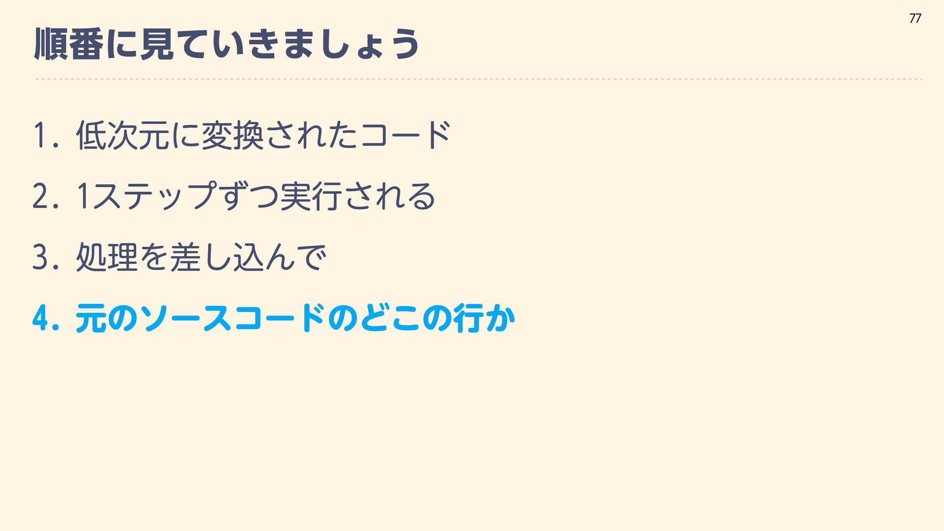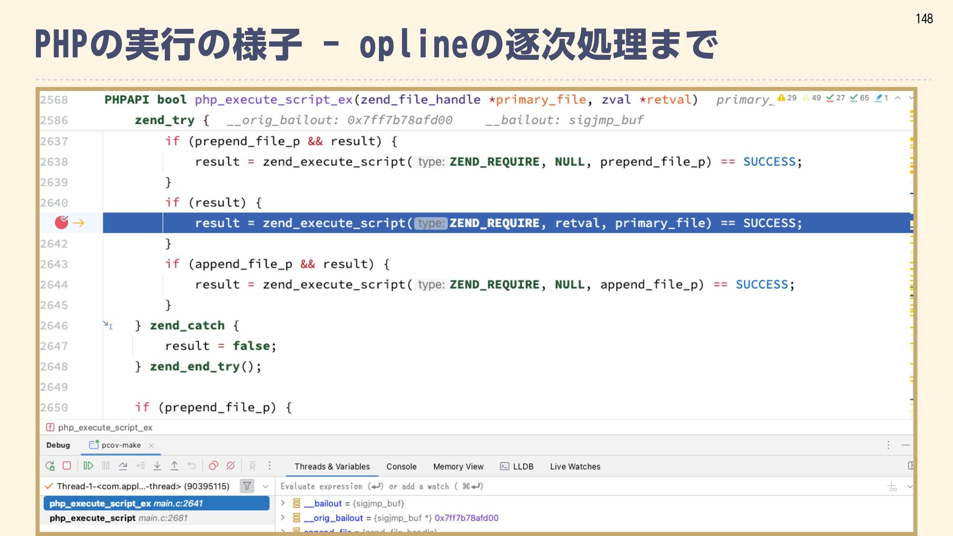 pcovTrace($࣮ߦ͢Δσʔλ); if ($returnCode === CODE_શ෦ऴྃ) { return; } elseif ($returnCode !== CODE_ͦͷ··࣍΁) { $࣮ߦ͢Δσʔλ = ݱࡏͷϑϨʔϜऔಘ(); } } }  pcovTrace($࣮ߦ͢Δσʔλ); opcodeを1ステップずつ実行 対応するPHPスクリプトの行を記録 実行結果状態を返す