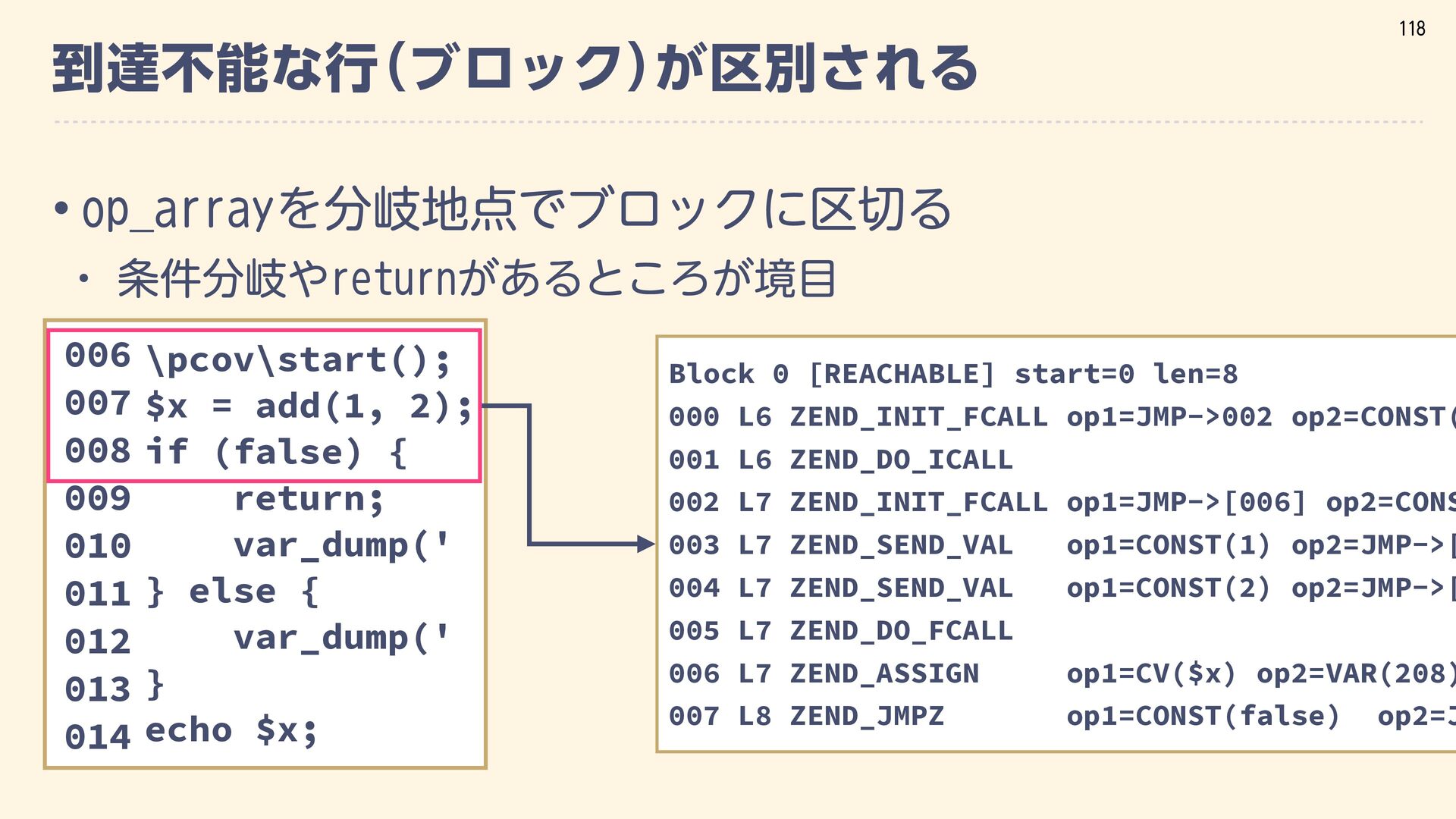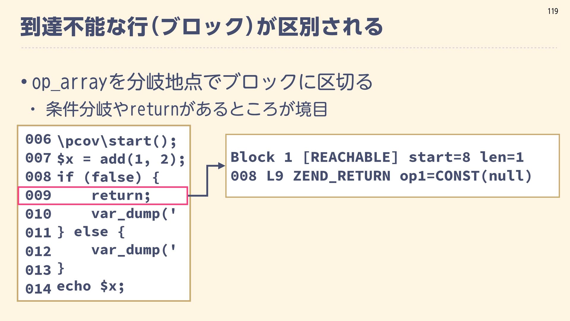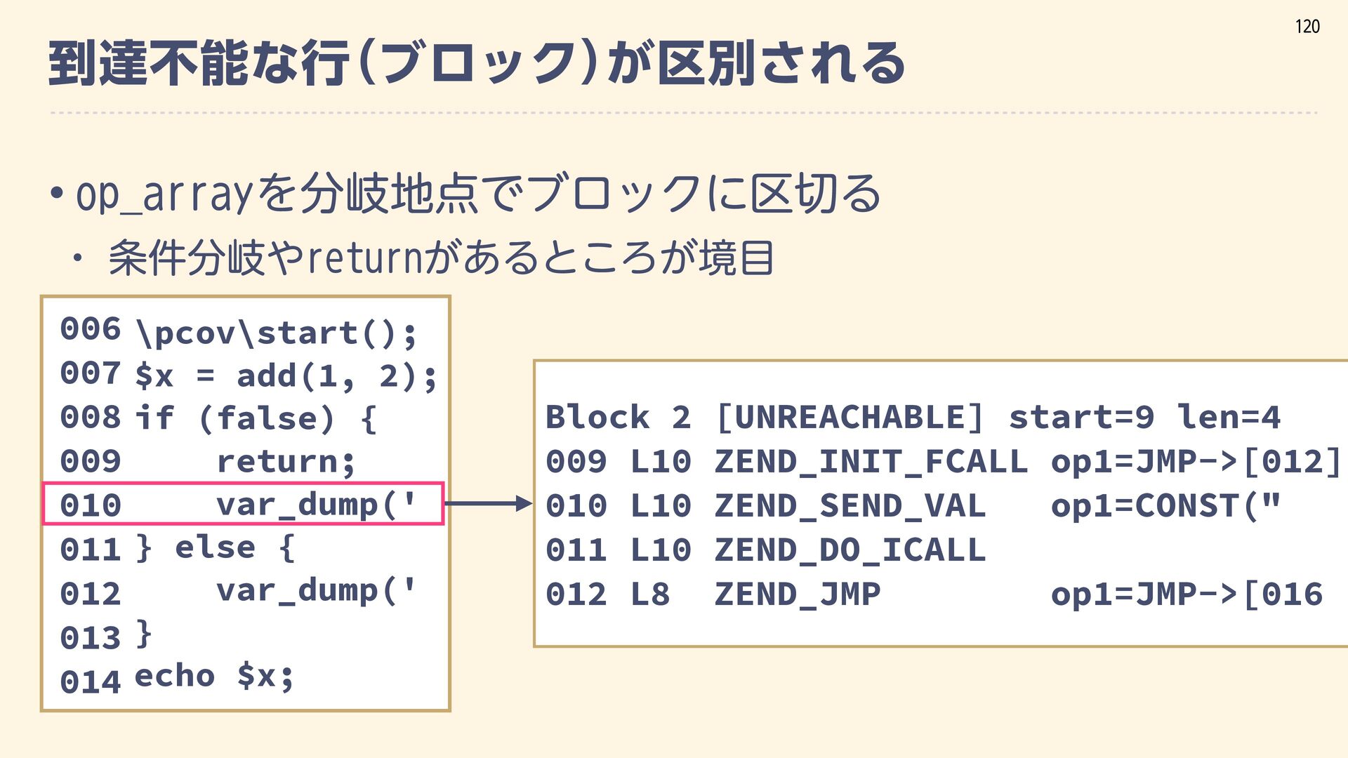 57. 到達不能な行(ブロック)が区別される • op_arrayを分岐地点でブロックに区切る • 条件分岐やreturnがあるところが境目 119 006 007 008 009