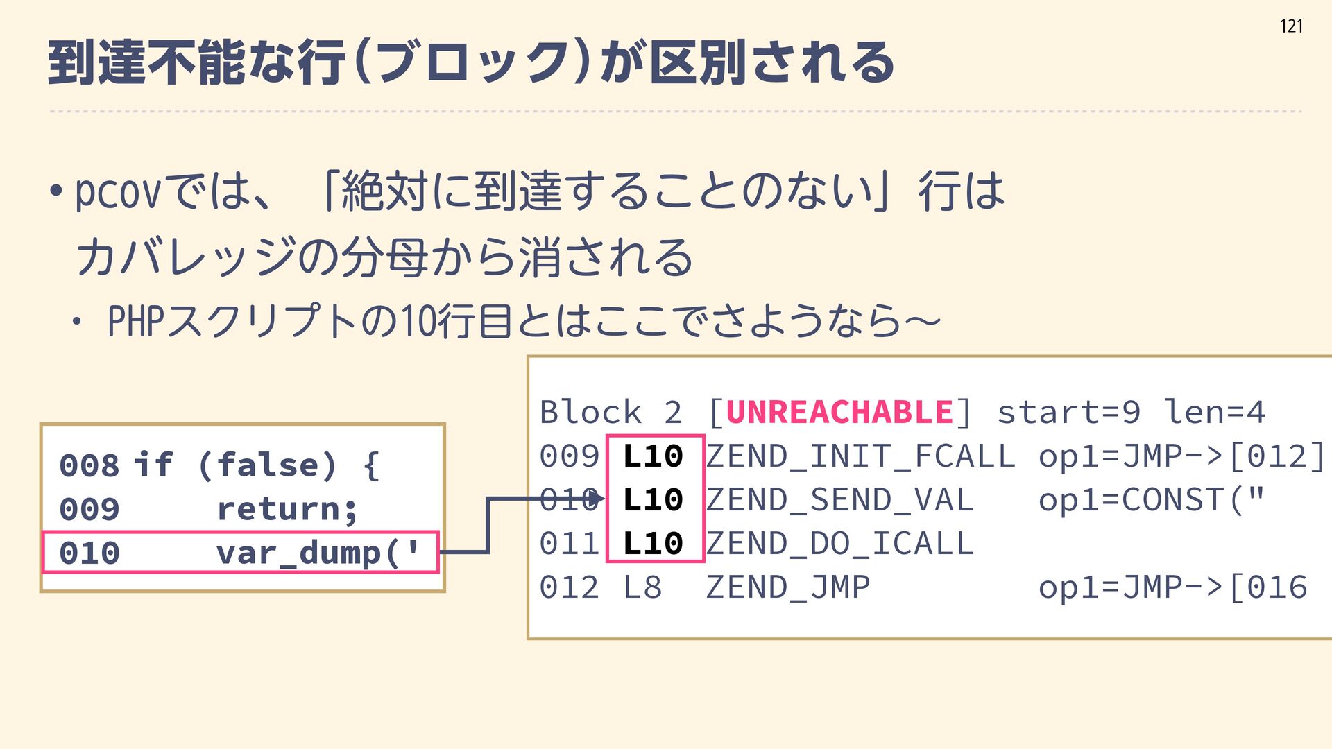 59. 到達不能な行(ブロック)が区別される • pcovでは、「絶対に到達することのない」行は カバレッジの分母から消される • PHPスクリプトの10行目とはここでさようなら〜 121 008 009 010