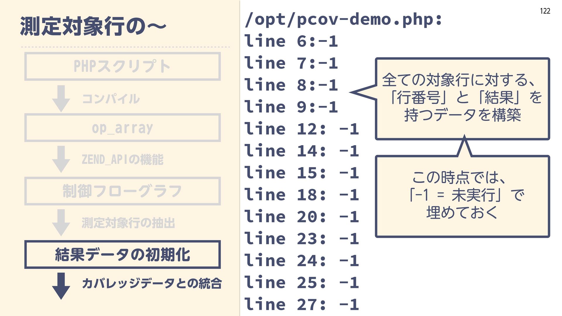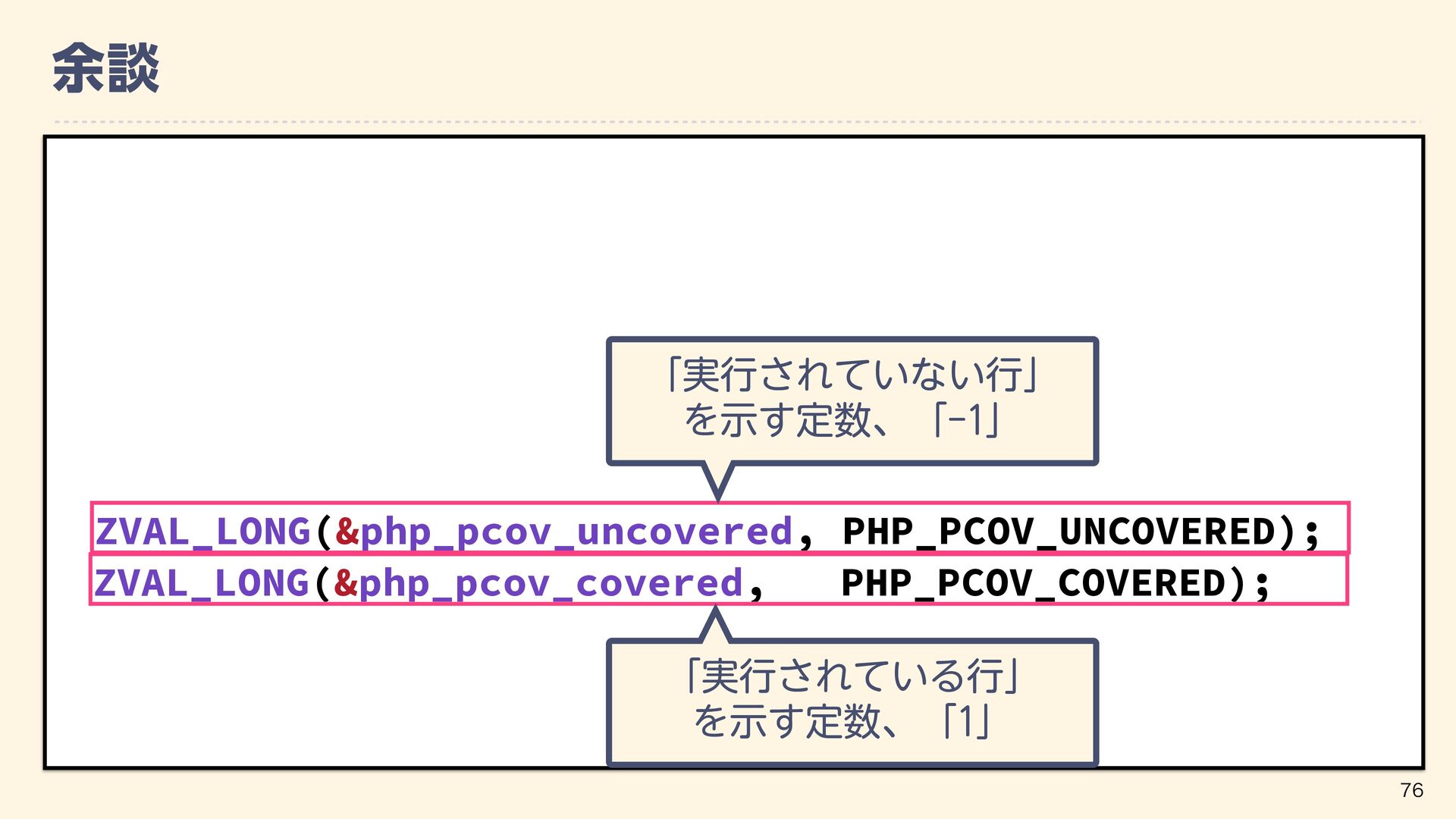 ZVAL_LONG(&php_pcov_uncovered, PHP_PCOV_UNCOVERED); 「実行されていない行」 を示す定数、「-1」 ZVAL_LONG(&php_pcov_covered, PHP_PCOV_COVERED); 「実行されている行」 を示す定数、「1」 pcov.c