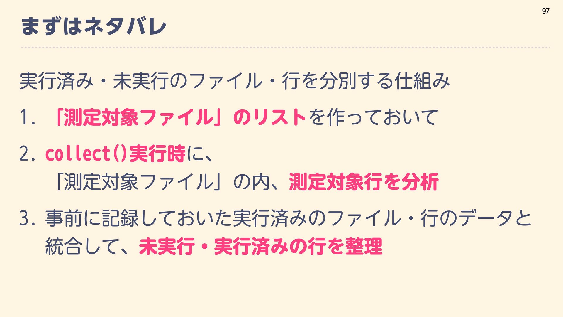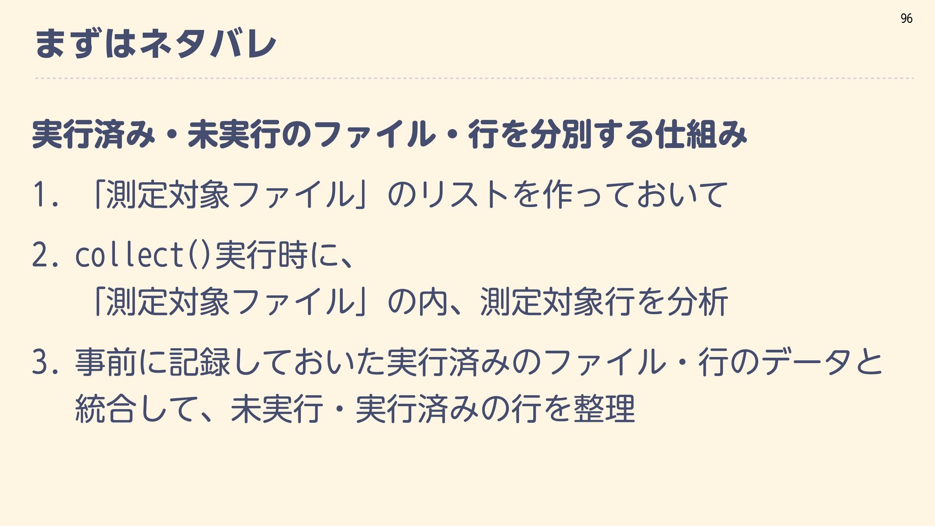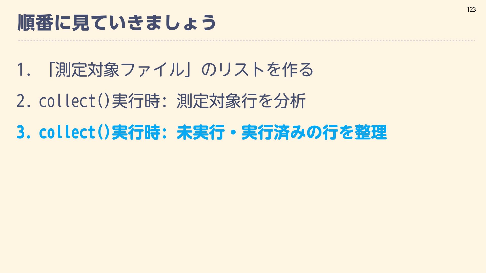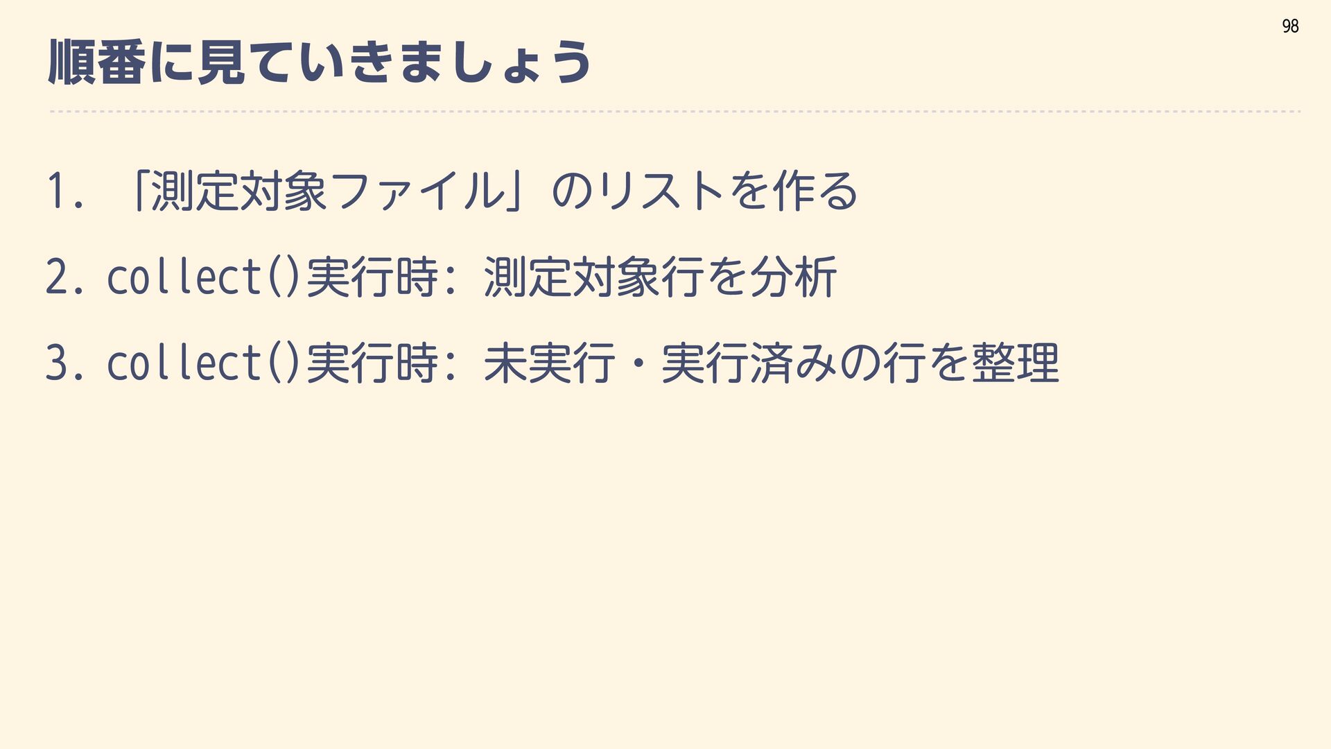 51. \pcov\collect() のおさらい • 「実行された行」「されなかった行」のデータを返す関数 • この関数が呼ばれると、集めたデータの統合と整理を行う • コンパイル時に集めた 「対象ファイル」の一覧 •