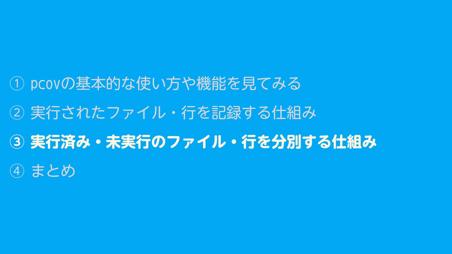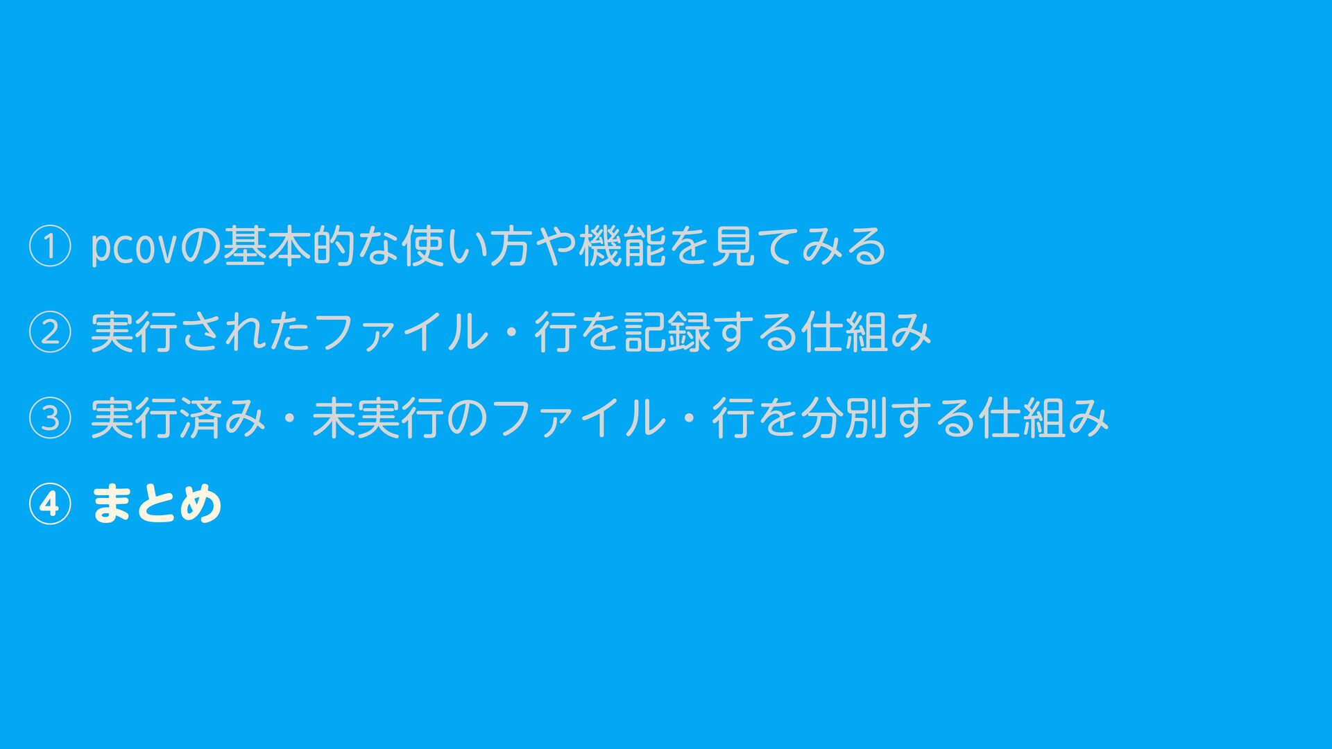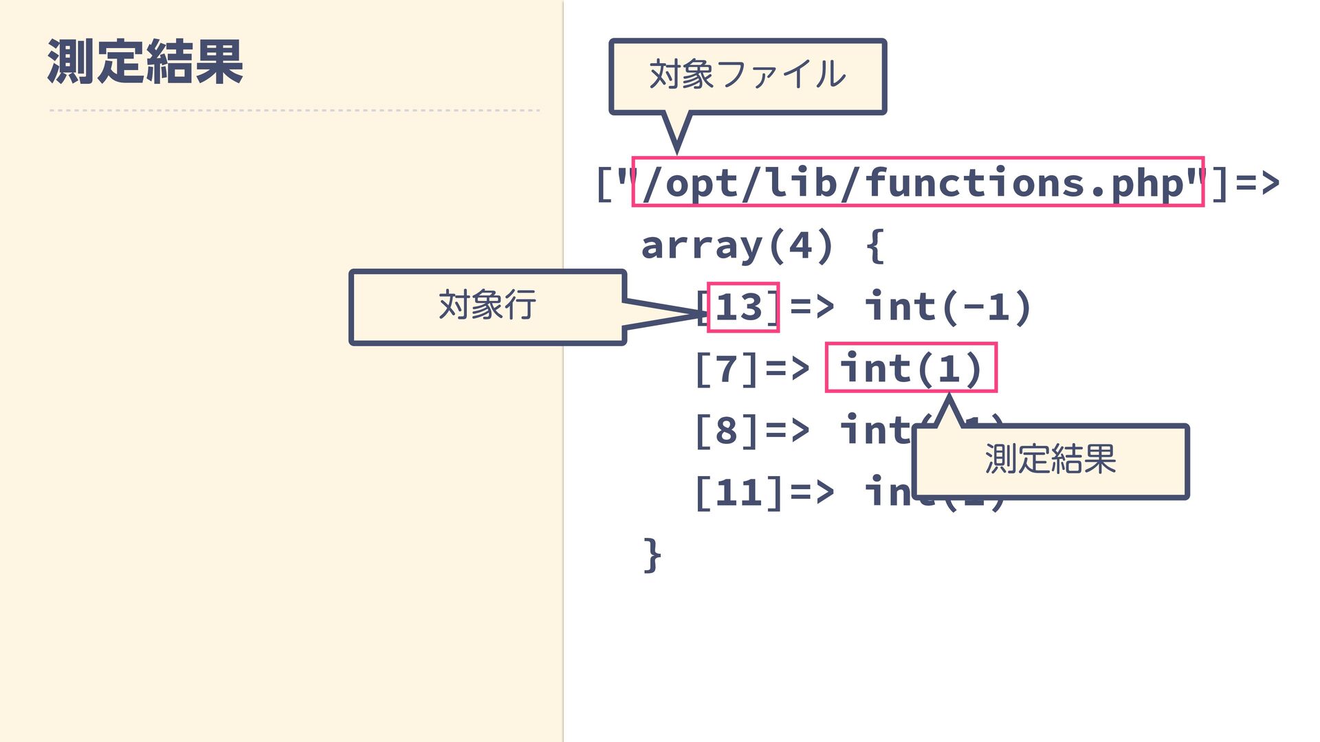 \pcov\stop(); $coverage = \pcov\collect(); var_dump($coverage); 001 002 003 004 005 006 007 008 009 010 011 012 ここで測定終了