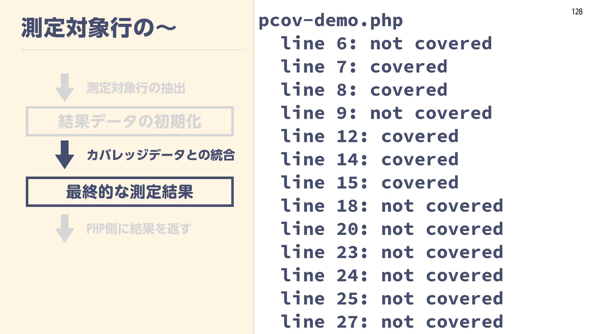 61. 測定対象行の〜 128 pcov-demo.php line 6: not covered line 7: covered