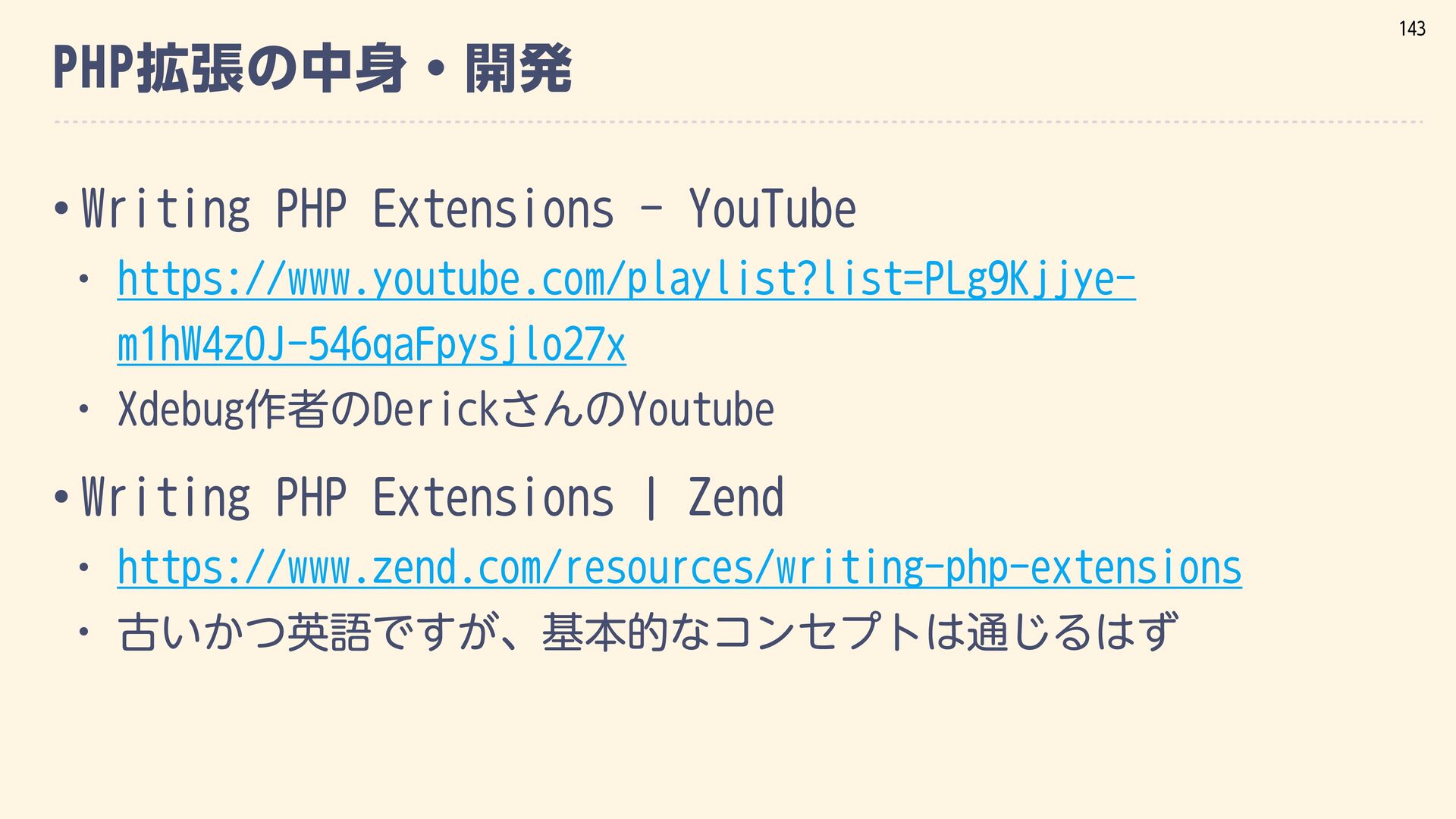 • Xdebug作者のDerickさんのYoutube • Writing PHP Extensions | Zend • https://www.zend.com/resources/writing-php-extensions • 古いかつ英語ですが、基本的なコンセプトは通じるはず 143