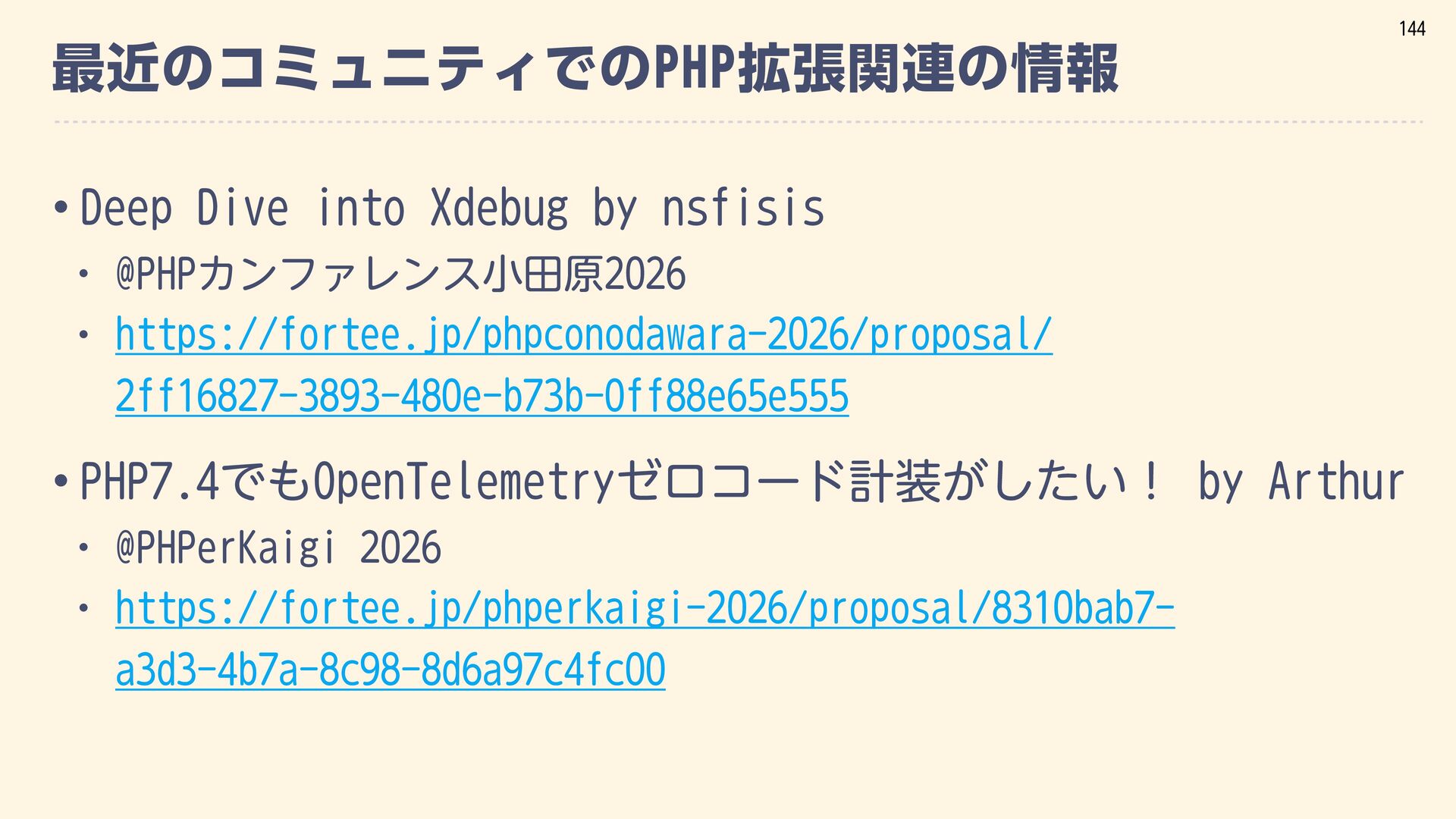 • https://fortee.jp/phpconodawara-2026/proposal/ 2ff16827-3893-480e-b73b-0ff88e65e555 • PHP7.4でもOpenTelemetryゼロコード計装がしたい! by Arthur • @PHPerKaigi 2026 • https://fortee.jp/phperkaigi-2026/proposal/8310bab7- a3d3-4b7a-8c98-8d6a97c4fc00 144