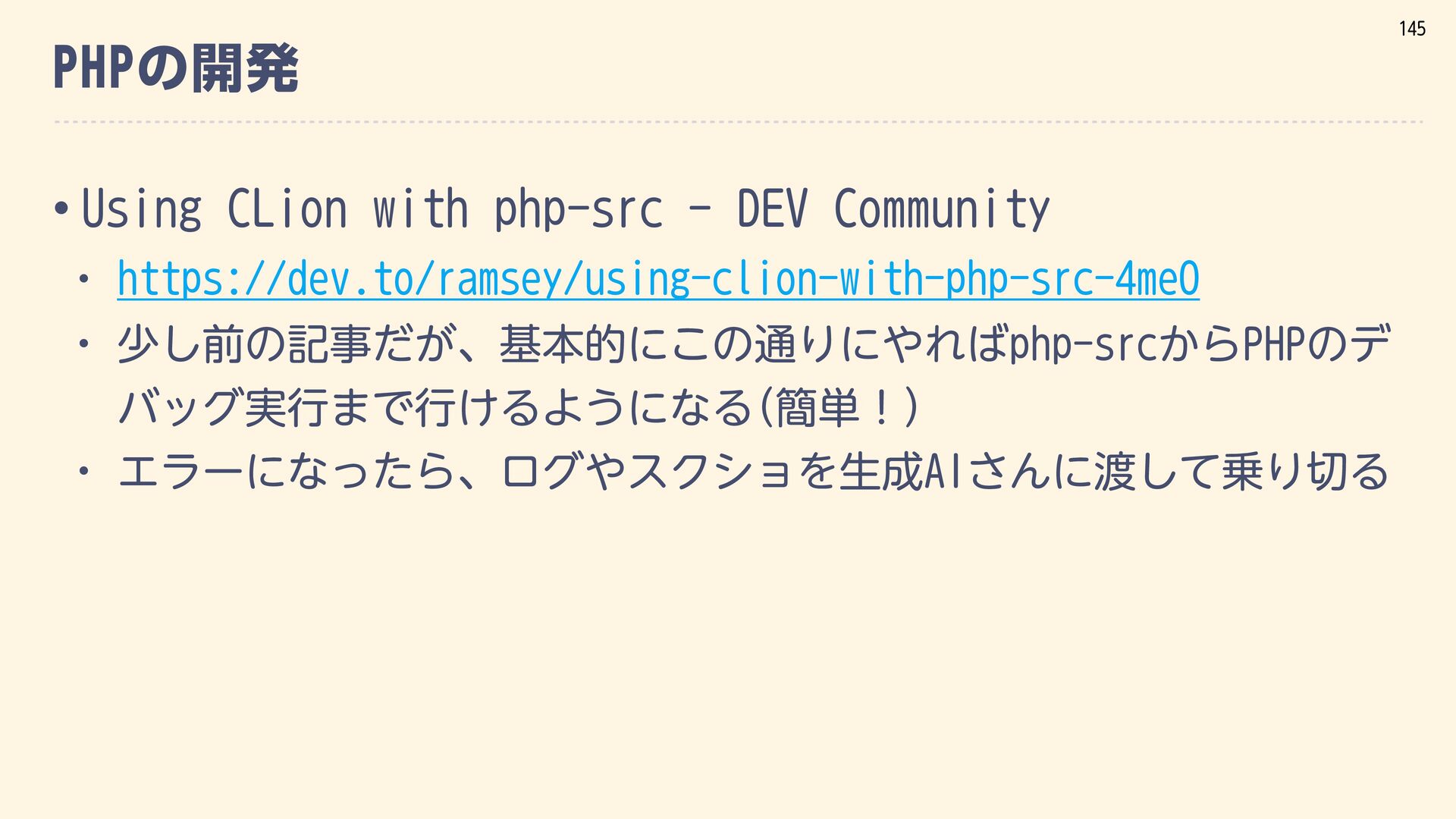 https://dev.to/ramsey/using-clion-with-php-src-4me0 • 少し前の記事だが、基本的にこの通りにやればphp-srcからPHPのデ バッグ実行まで行けるようになる(簡単!) • エラーになったら、ログやスクショを生成AIさんに渡して乗り切る 145