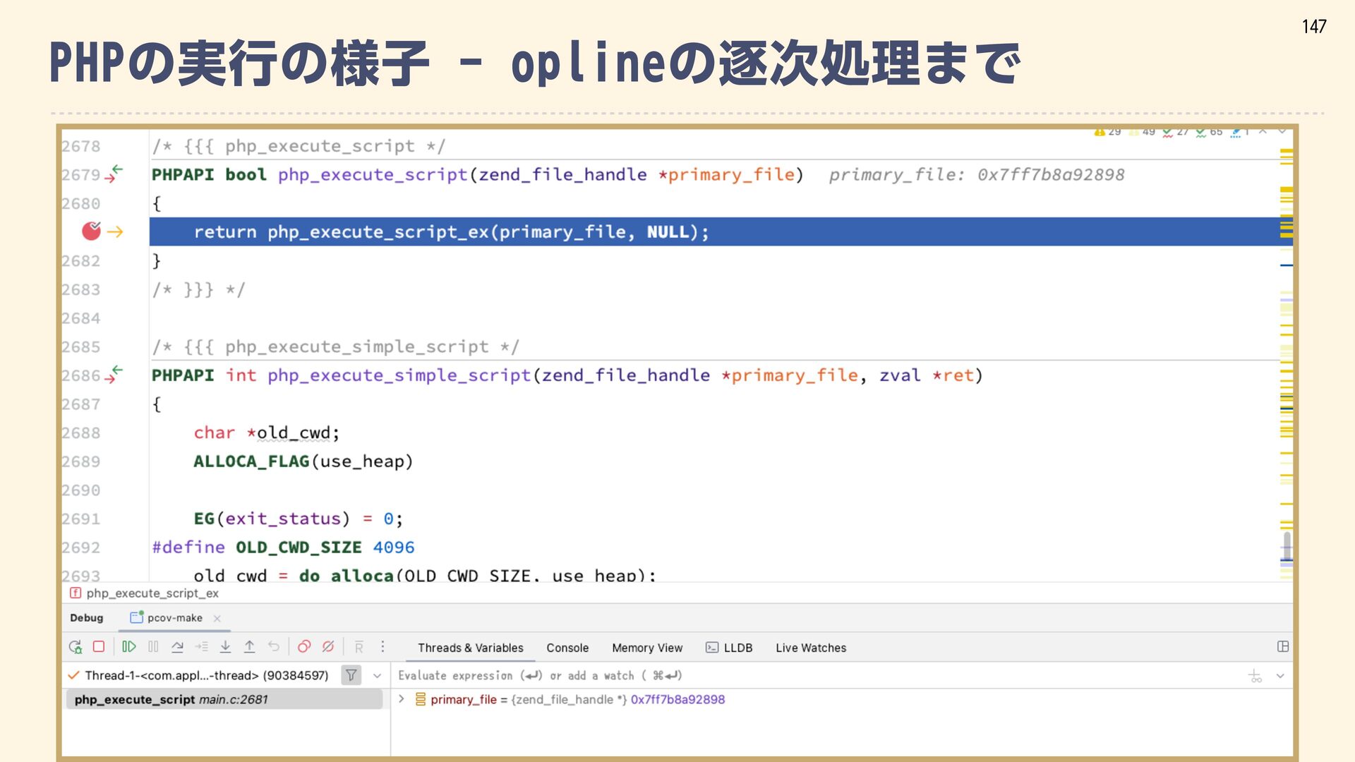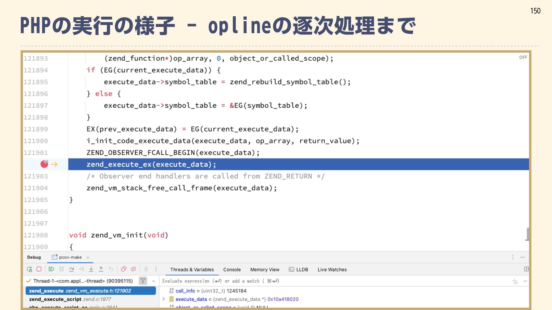 1ステップずつ実行 L10 01 SEND_VAL int(2) 1 L10 02 SEND_VAL int(3) 2 L10 03 V2 = DO_FCALL ɾ ɾ ɾ opline