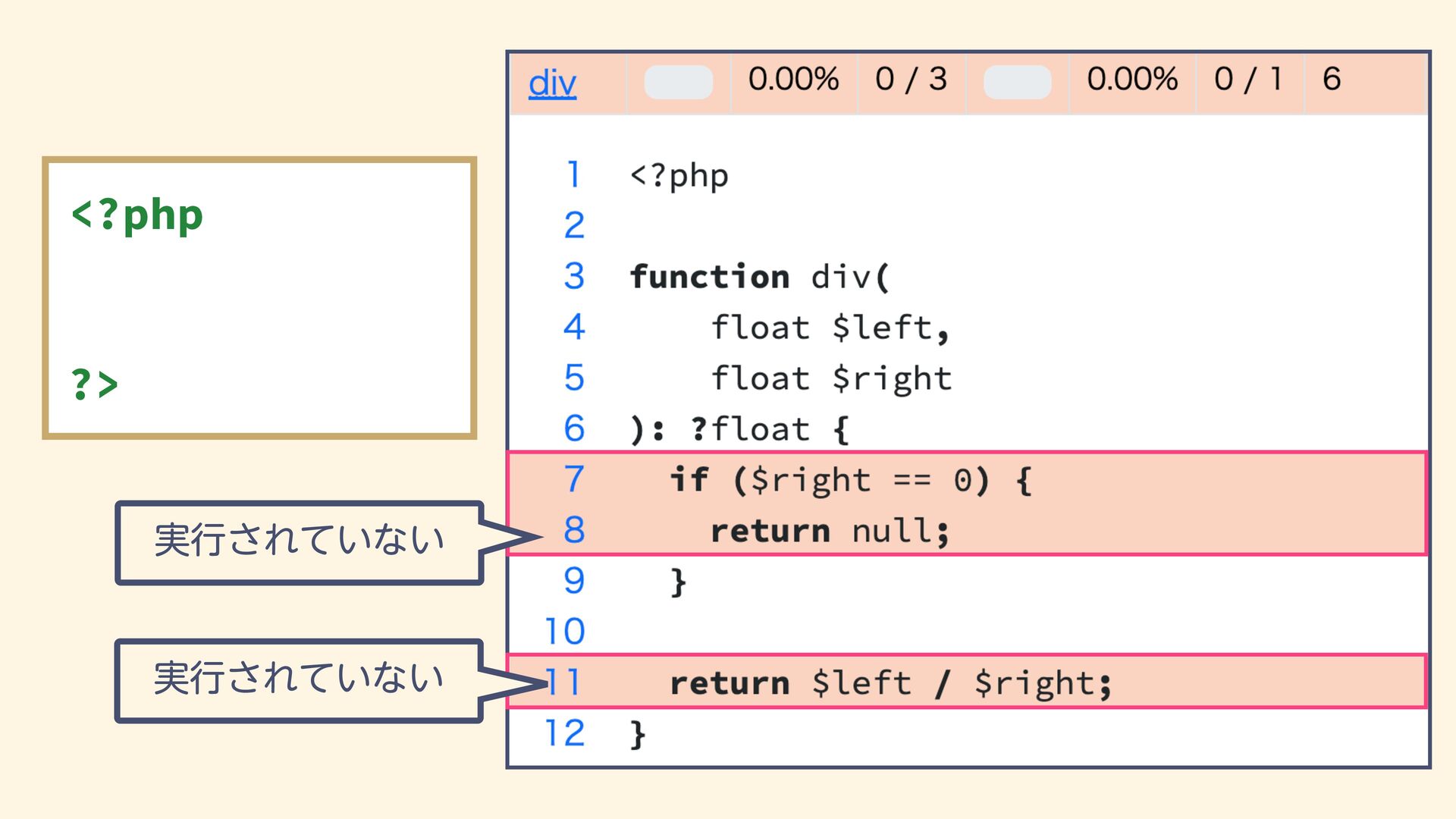 <?php function add(int $a, int $b): int { return $a + $b; } \pcov\start(); $x = add(1, 2); if (false) { return; var_dump('ίίʹ͸དྷͳ͍Α'); } else { var_dump('ίίʹ͸དྷΔͬͯ͞'); } echo $x; \pcov\stop(); // ݁ՌΛऔಘ $coverage = \pcov\collect(); 001 002 003 004 005 006 007 008 009 010 011 012 013 014 015 016 017 018