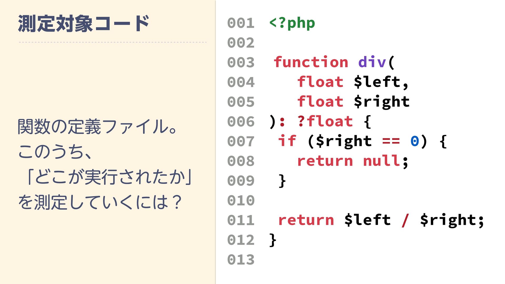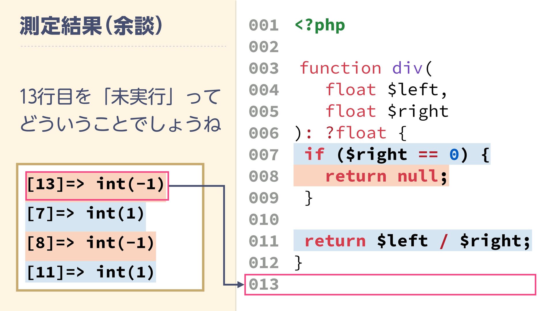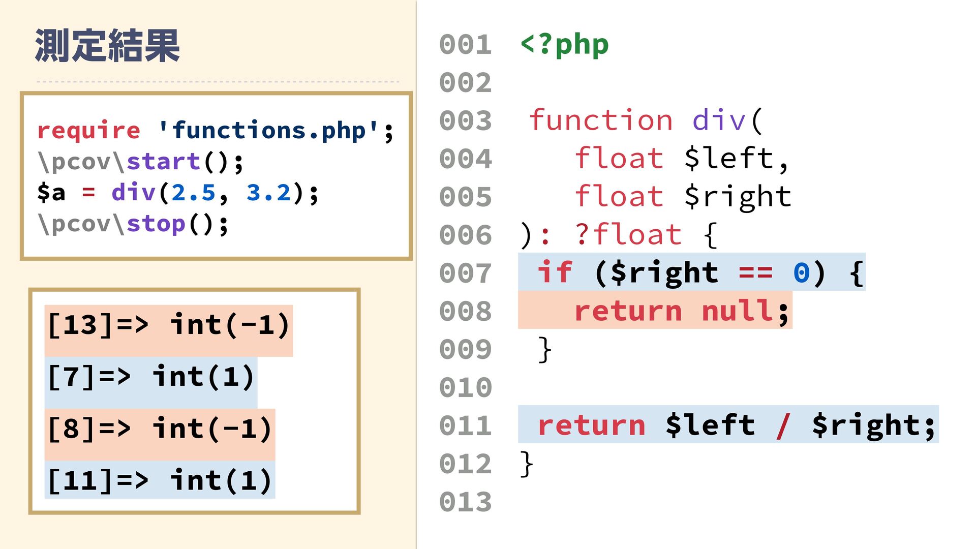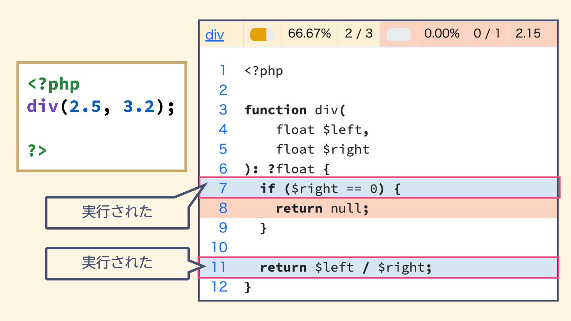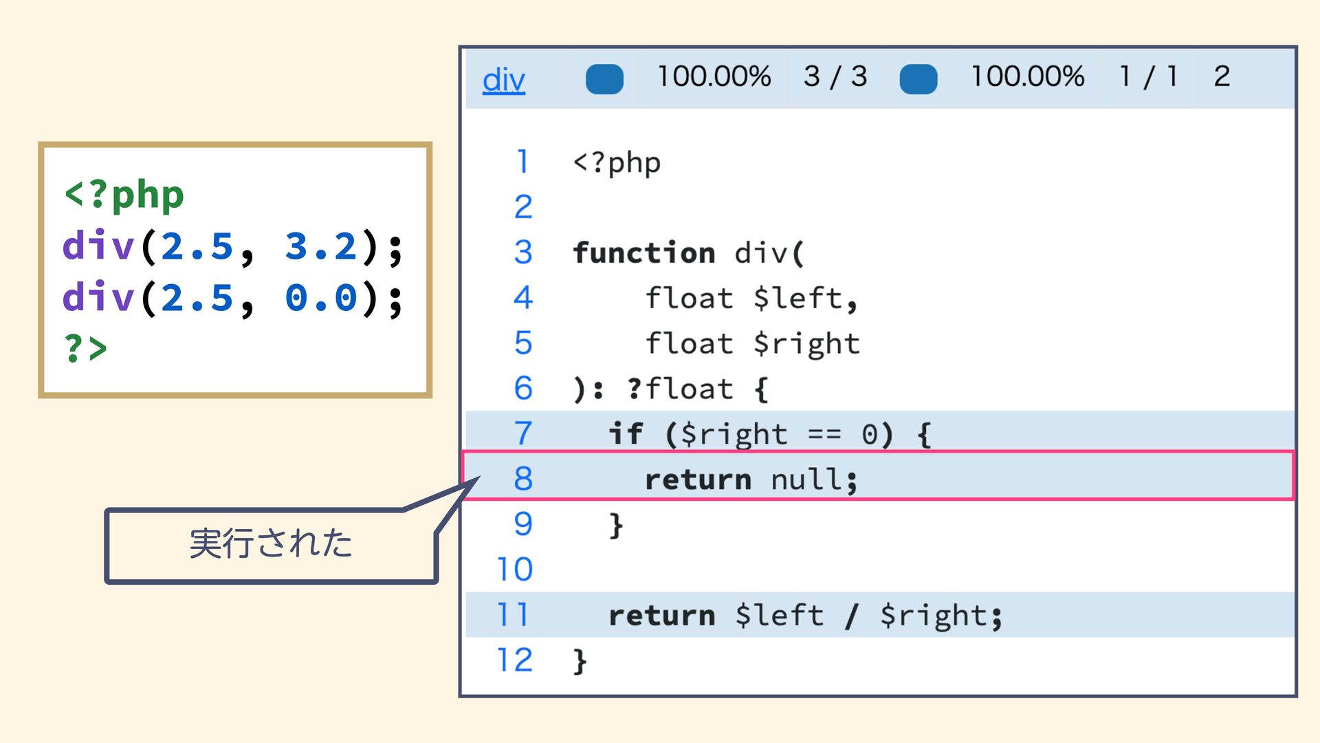 <?php function div( float $left, float $right ): ?float { if ($right == 0) { return null; } return $left / $right; } 001 002 003 004 005 006 007 008 009 010 011 012 013 require 'functions.php'; \pcov\start(); $a = div(2.5, 3.2); \pcov\stop();