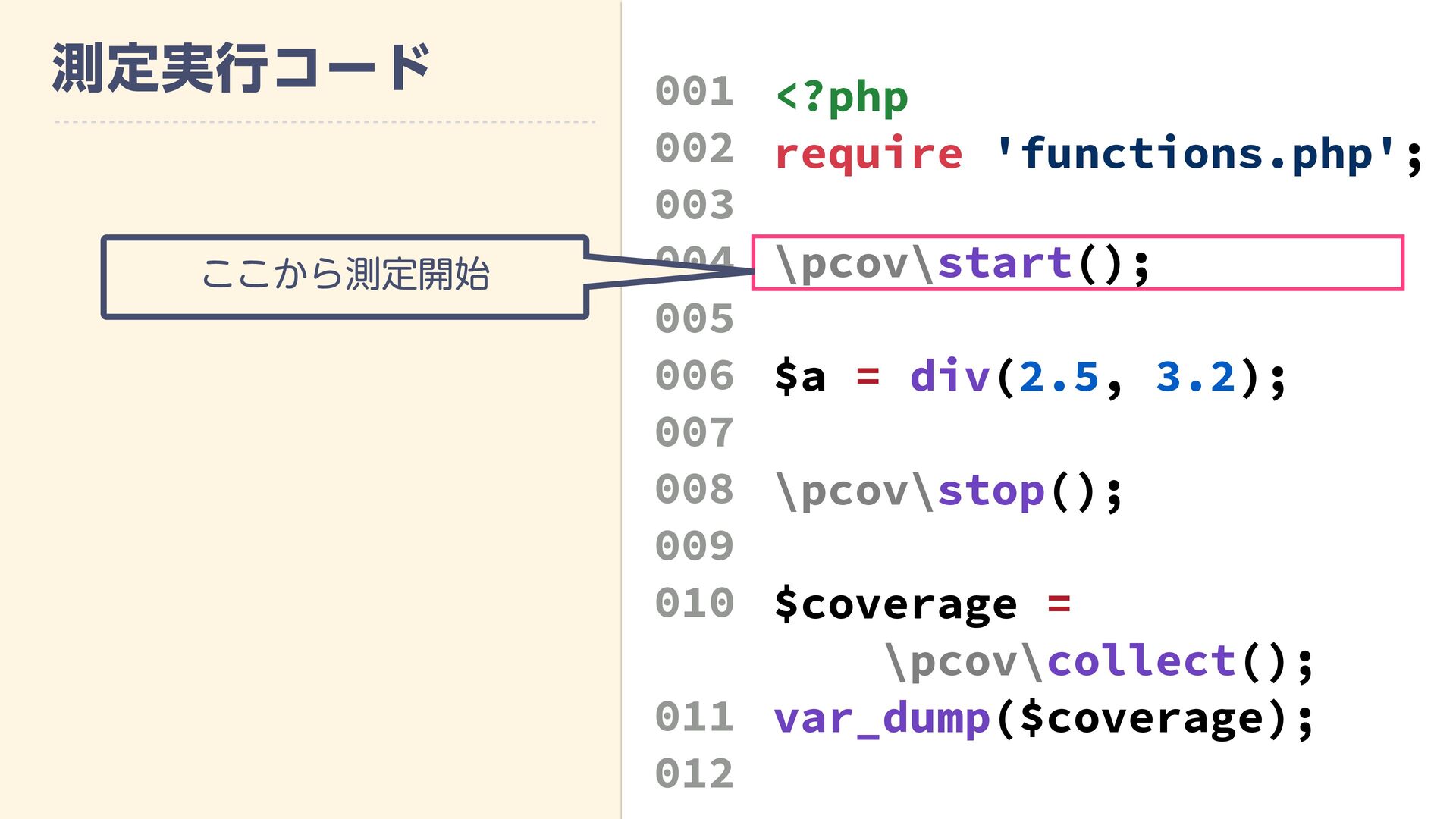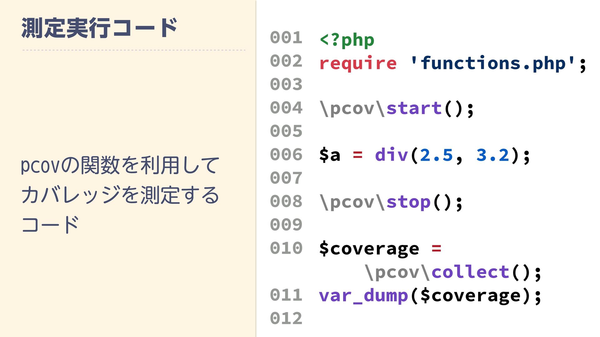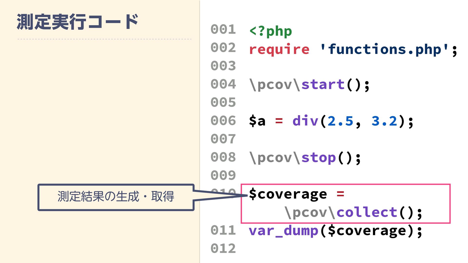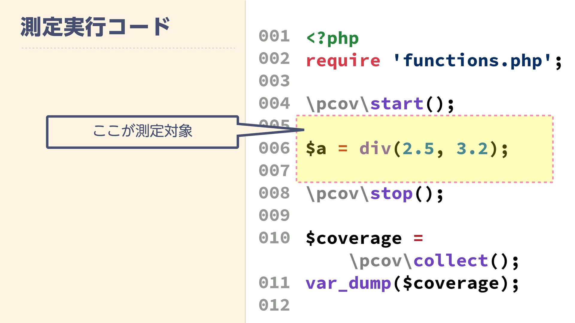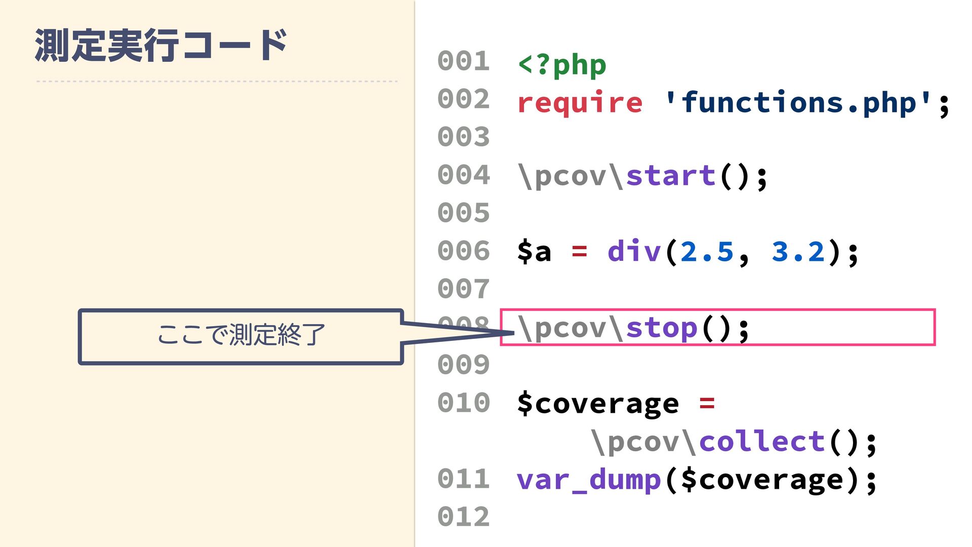 \pcov\stop(); $coverage = \pcov\collect(); var_dump($coverage); 001 002 003 004 005 006 007 008 009 010 011 012 ここから測定開始