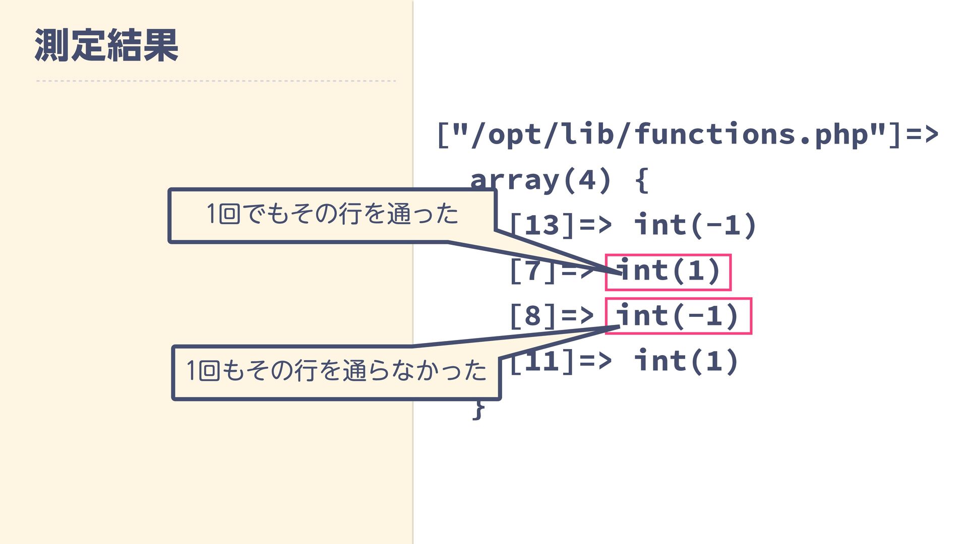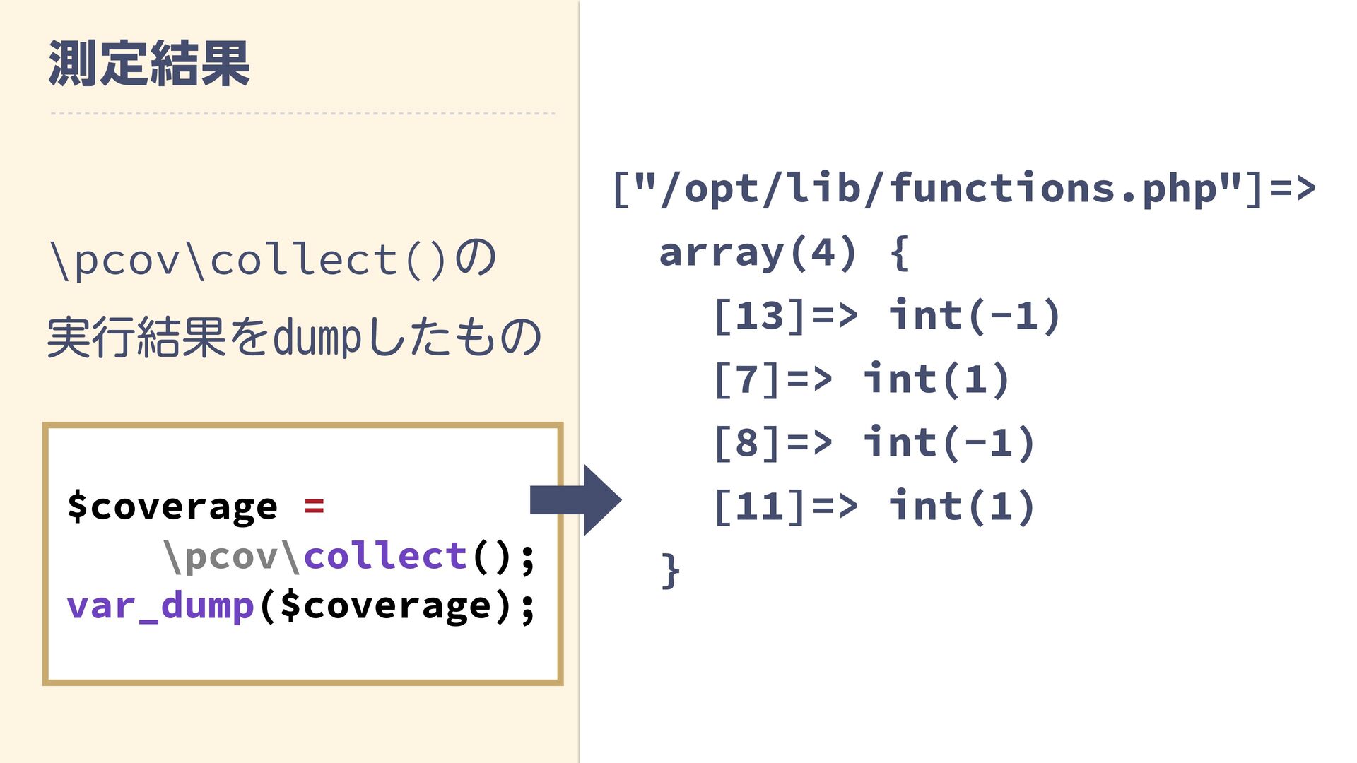 int(-1) [11]=> int(1) } $coverage = \pcov\collect(); var_dump($coverage); \pcov\collect()の 実行結果をdumpしたもの