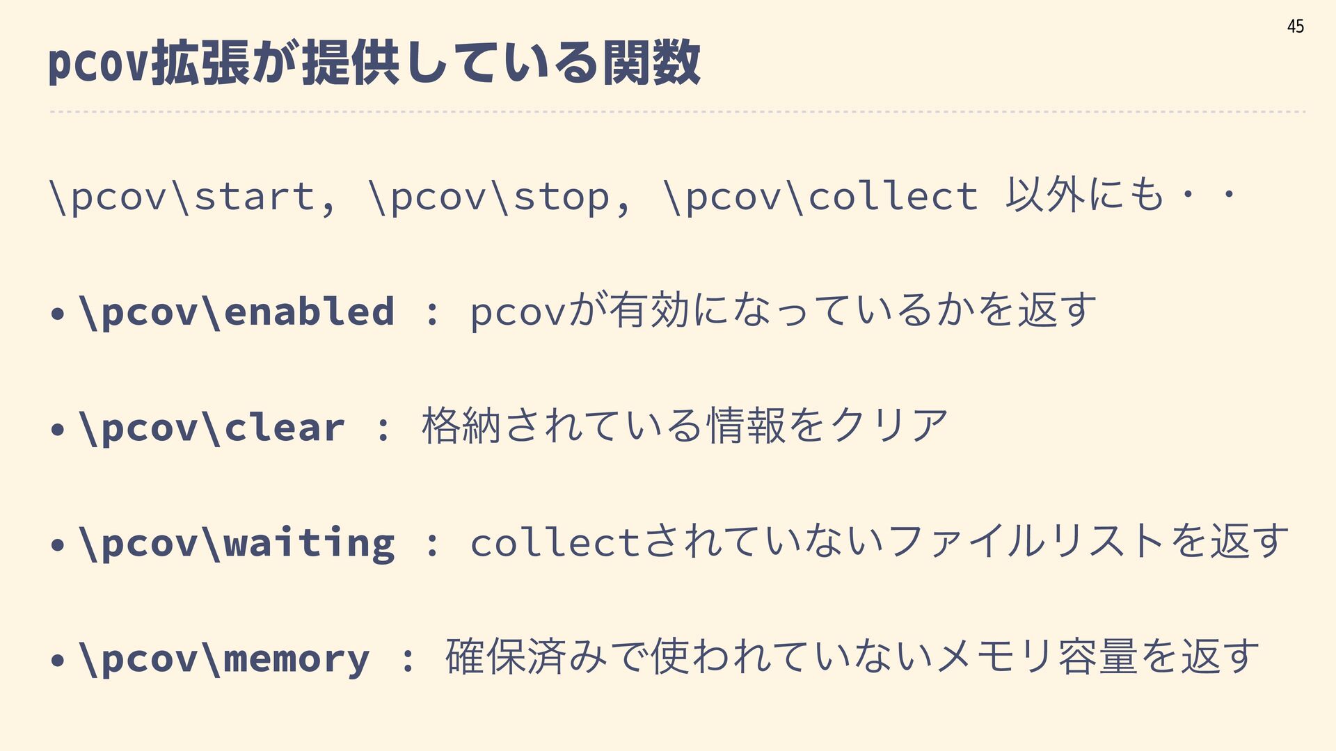 \pcov\clear : ֨ೲ͞Ε͍ͯΔ৘ใΛΫϦΞ • \pcov\waiting : collect͞Ε͍ͯͳ͍ϑΝΠϧϦετΛฦ͢ • \pcov\memory : ֬อࡁΈͰ࢖ΘΕ͍ͯͳ͍ϝϞϦ༰ྔΛฦ͢ 45