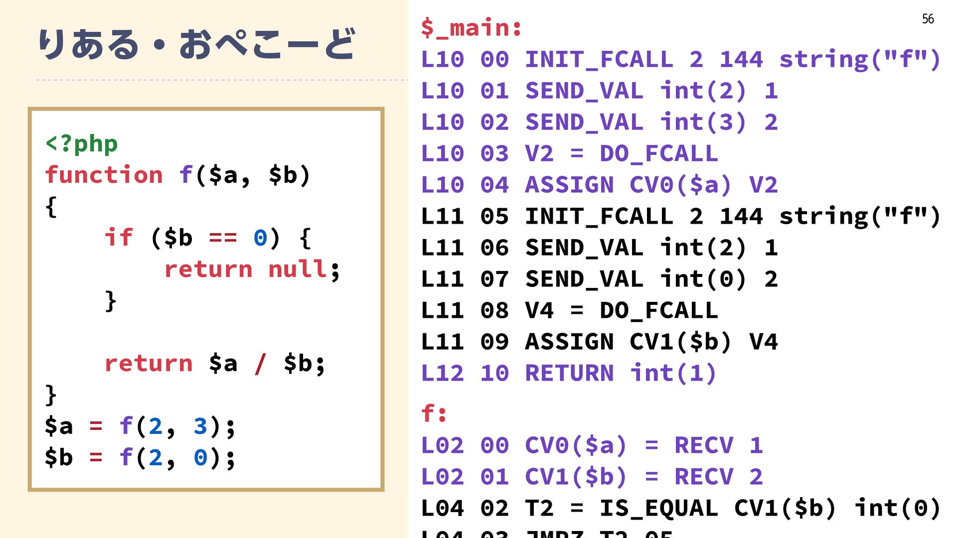 { return null; } return $a / $b; } $a = f(2, 3); $b = f(2, 0); $_main: L10 00 INIT_FCALL 2 144 string("f") L10 01 SEND_VAL int(2) 1 L10 02 SEND_VAL int(3) 2 L10 03 V2 = DO_FCALL L10 04 ASSIGN CV0($a) V2 L11 05 INIT_FCALL 2 144 string("f") L11 06 SEND_VAL int(2) 1 L11 07 SEND_VAL int(0) 2 L11 08 V4 = DO_FCALL L11 09 ASSIGN CV1($b) V4 L12 10 RETURN int(1) f: L02 00 CV0($a) = RECV 1 L02 01 CV1($b) = RECV 2 L04 02 T2 = IS_EQUAL CV1($b) int(0) 56