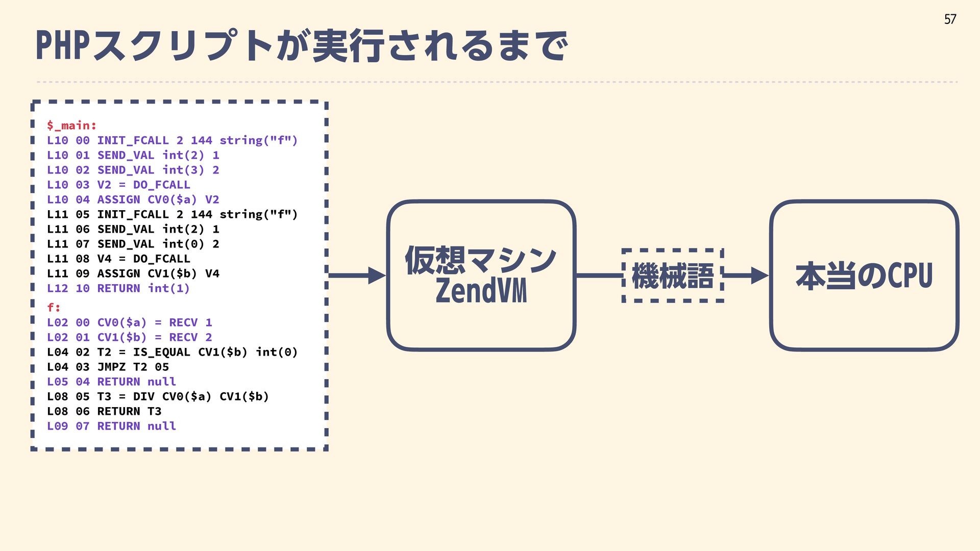 18. PHPスクリプトが実行されるまで 57 本当のCPU 仮想マシン ZendVM 機械語 $_main: L10 00 INIT_FCALL