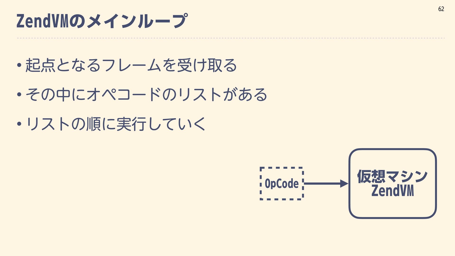 20. ZendVMのメインループ 64 L10 00 INIT_FCALL 2 144 string("f") 仮想マシン ZendVM
