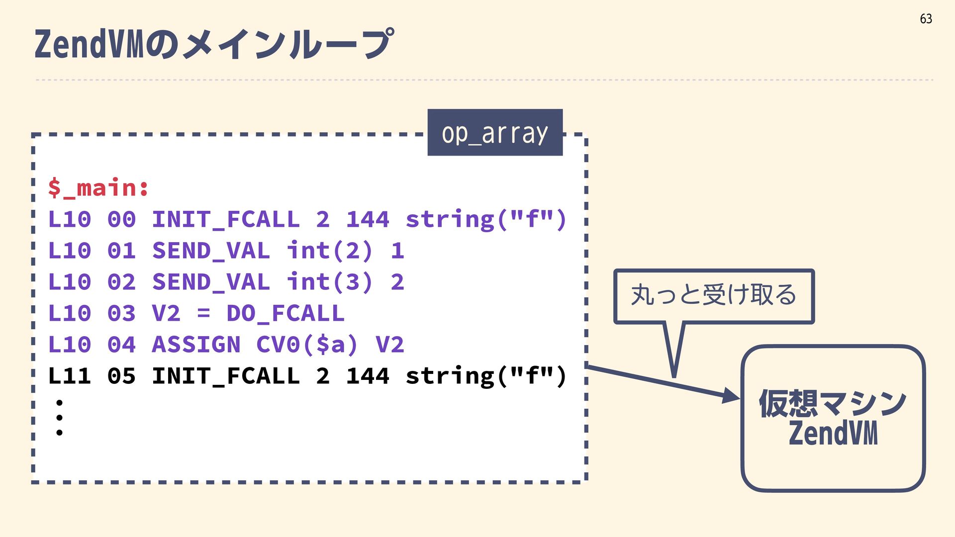 19. ZendVMのメインループ 63 $_main: L10 00 INIT_FCALL 2 144 string("f") L10