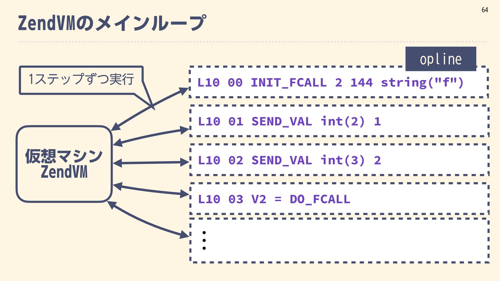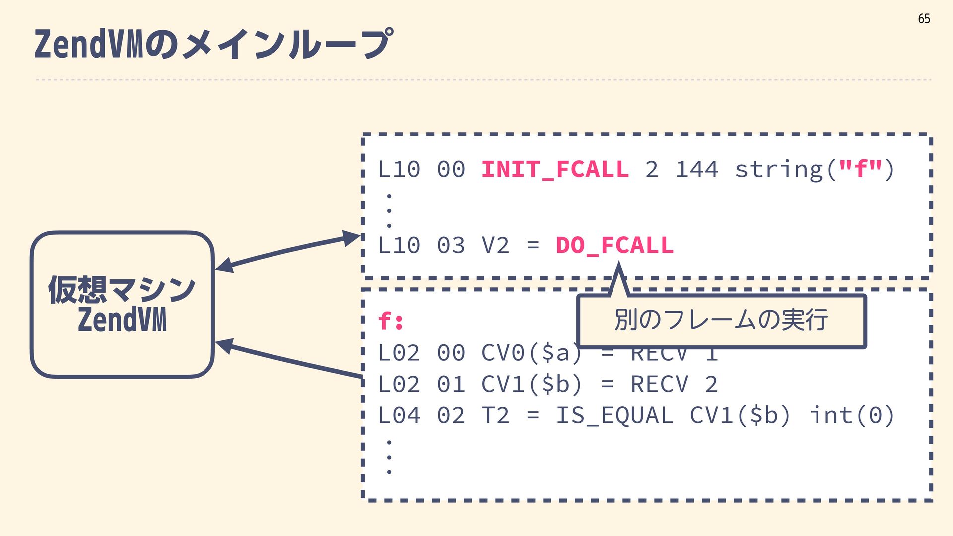 21. ZendVMのメインループ 65 L10 00 INIT_FCALL 2 144 string("f") ɾ ɾ