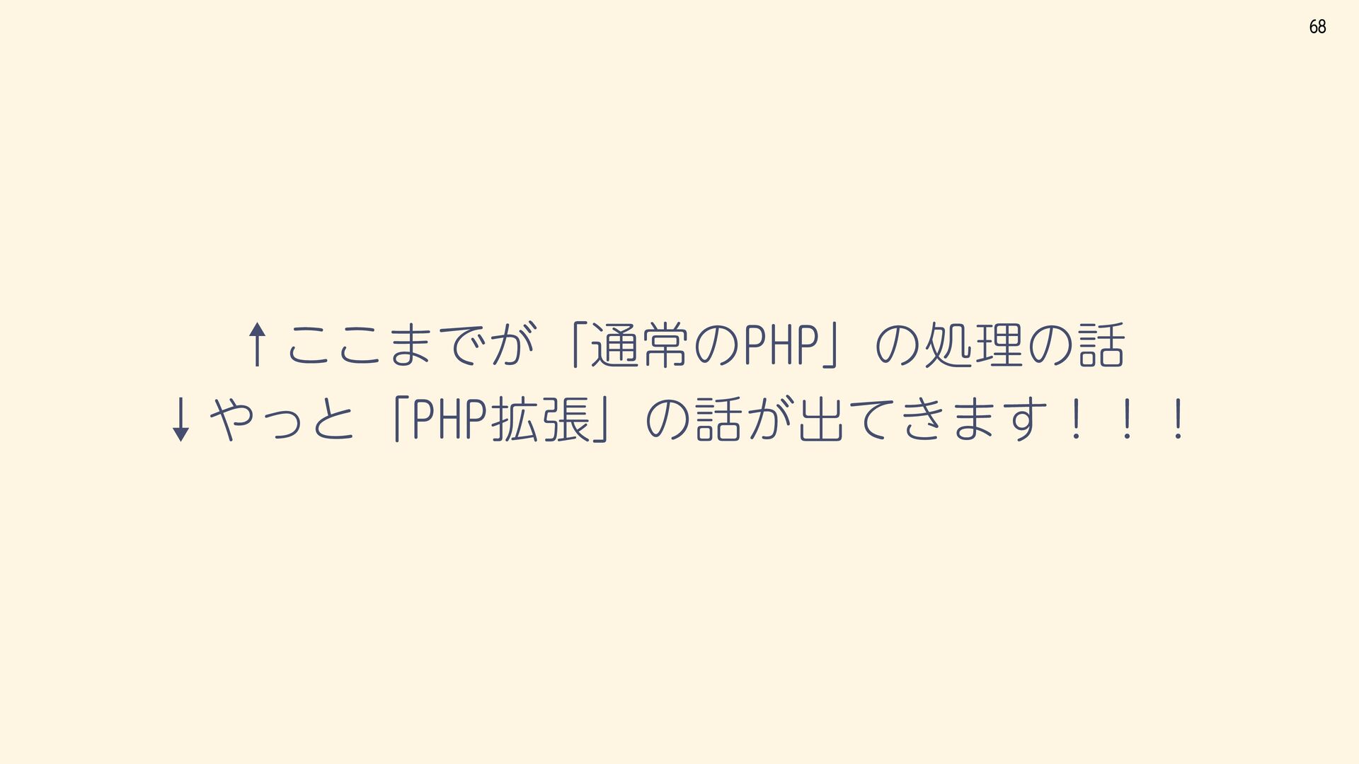 22. zend_execute_ex (っぽいもの) zend_execute_exは、1つのフレームに相当する単位で 実行するデータを受け取り、1ステップずつ処理していく 67 function zend_execute_ex($࣮ߦ͢Δσʔλ) { $op_array =
