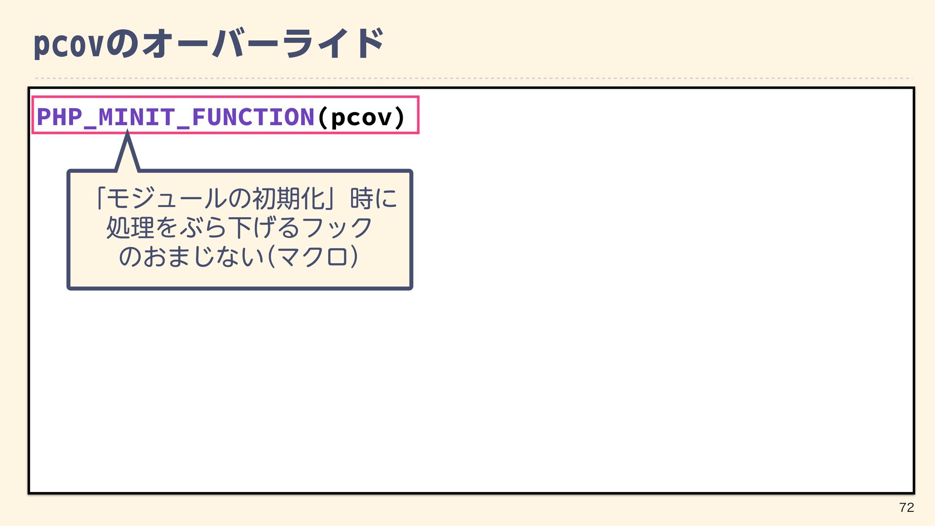 PHP_MINIT_FUNCTION(pcov) 「モジュールの初期化」時に 処理をぶら下げるフック のおまじない(マクロ) pcov.c