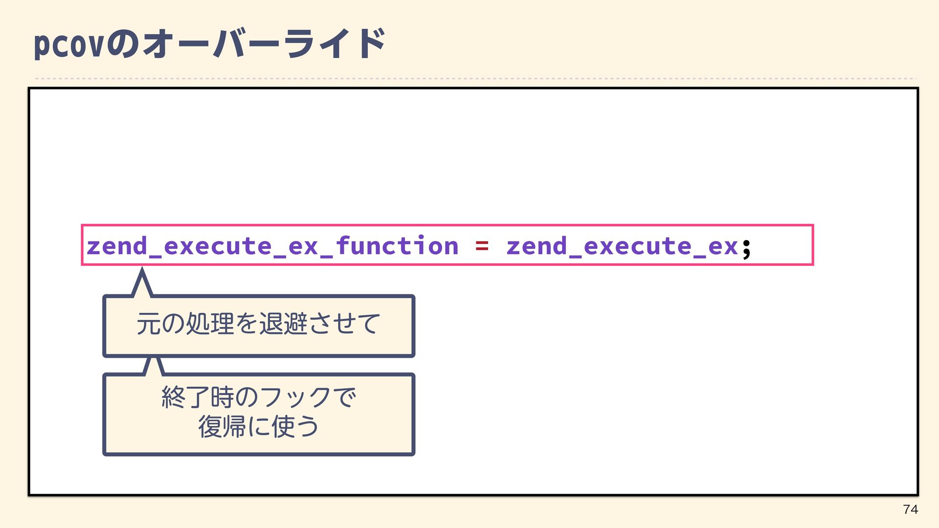 zend_execute_ex_function = zend_execute_ex; 終了時のフックで 復帰に使う 元の処理を退避させて pcov.c