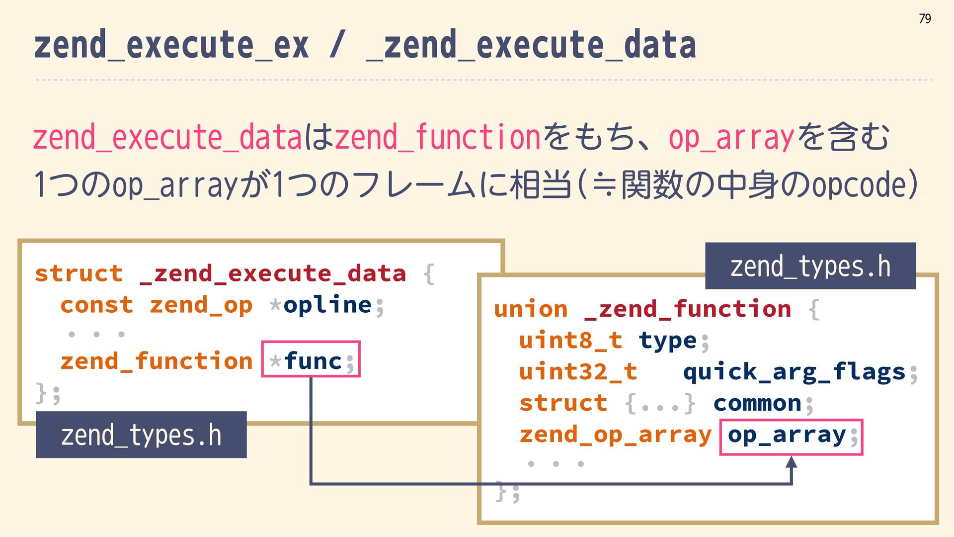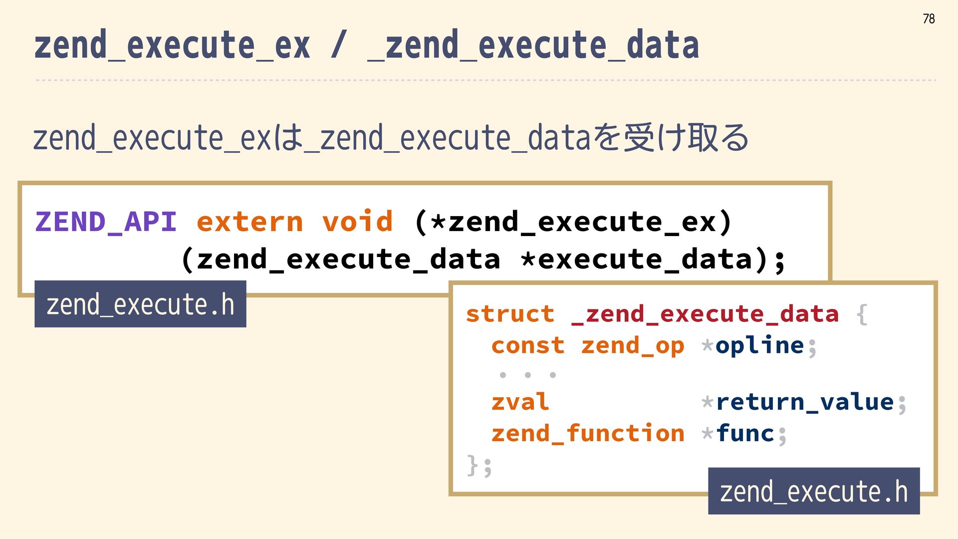 29. zend_execute_ex / _zend_execute_data zend_execute_exは_zend_execute_dataを受け取る 78 ZEND_API extern void (*zend_execute_ex) (zend_execute_data
