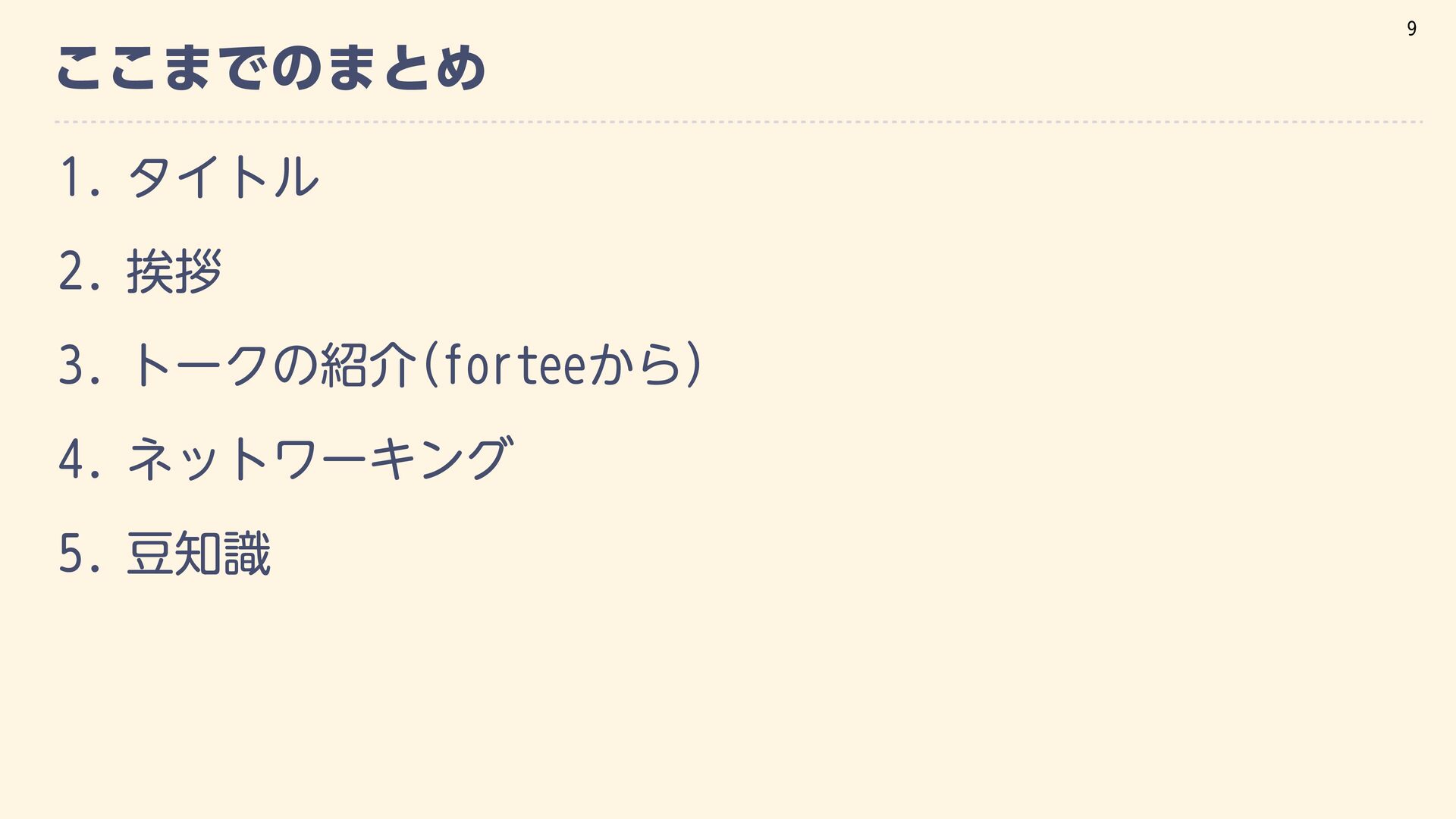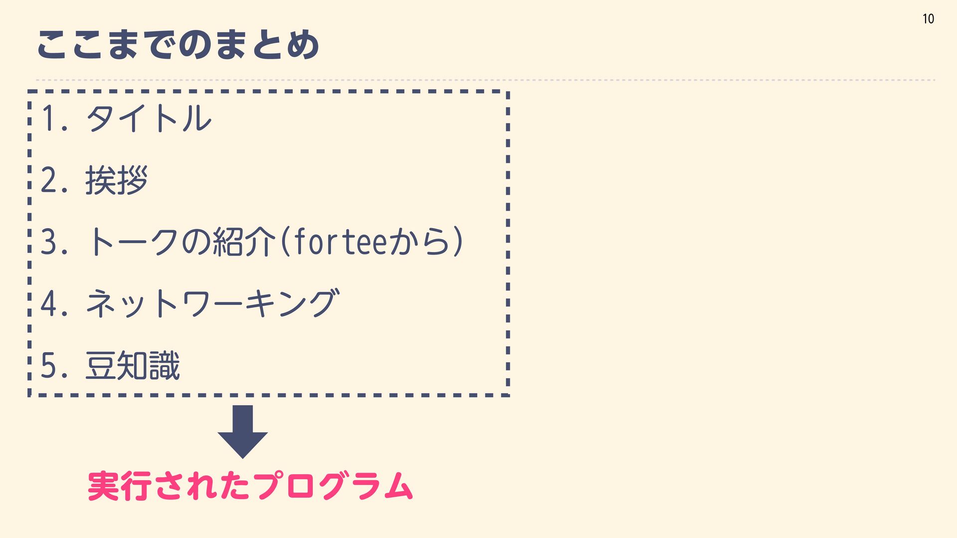 1. ここまでのまとめ 11 実行されたプログラム 1. タイトル 2. 挨拶 3. トークの紹介(forteeから) 4.