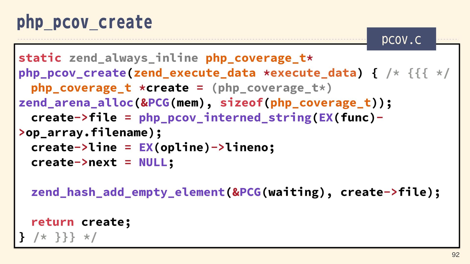 php_coverage_t *create = (php_coverage_t*) zend_arena_alloc(&PCG(mem), sizeof(php_coverage_t)); create->file = php_pcov_interned_string(EX(func)- >op_array.filename); create->line = EX(opline)->lineno; create->next = NULL; zend_hash_add_empty_element(&PCG(waiting), create->file); return create; } /* }}} */  pcov.c