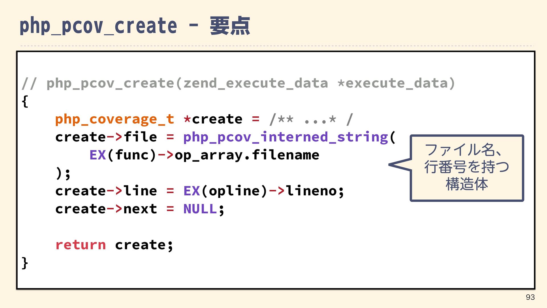 /** ...* / create->file = php_pcov_interned_string( EX(func)->op_array.filename ); create->line = EX(opline)->lineno; create->next = NULL; return create; }  ファイル名、 行番号を持つ 構造体