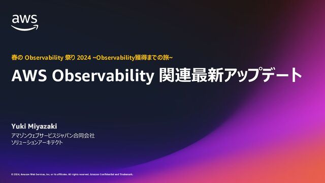 rights reserved. Amazon Confidential and Trademark. Amazon CloudWatch Application Signals • 計測のための実装やダッシュボードの作成といった作業を必要とせず、 アプリケーションから主要なメトリクスとトレースを収集しダッシュボードを⾃動⽣成 • サービスレベル⽬標 ( SLO ) を定義し、モニタリング可能 • サービスのサービスレベルインジケーター ( SLI ) のステータスを追跡可能 • Service Map により、アプリケーションのトポロジーと依存関係を可視化 • 対応アプリケーションの⾔語︓Java, Python (β版) • 対応サービス︓Amazon EKS、Amazon ECS、および Amazon EC2 AWS上で実⾏されているアプリケーションを⾃動でモニタリングし、健全性とパフォーマンスを可視化 プ レ ビ ュ ー 差別化につながらない作業を削減 最も重要なビジネス⽬標に照らしてパフォーマンスを追跡 分散システムにおける複雑な監視と保守を容易にし、問題の切り分け時間の短縮