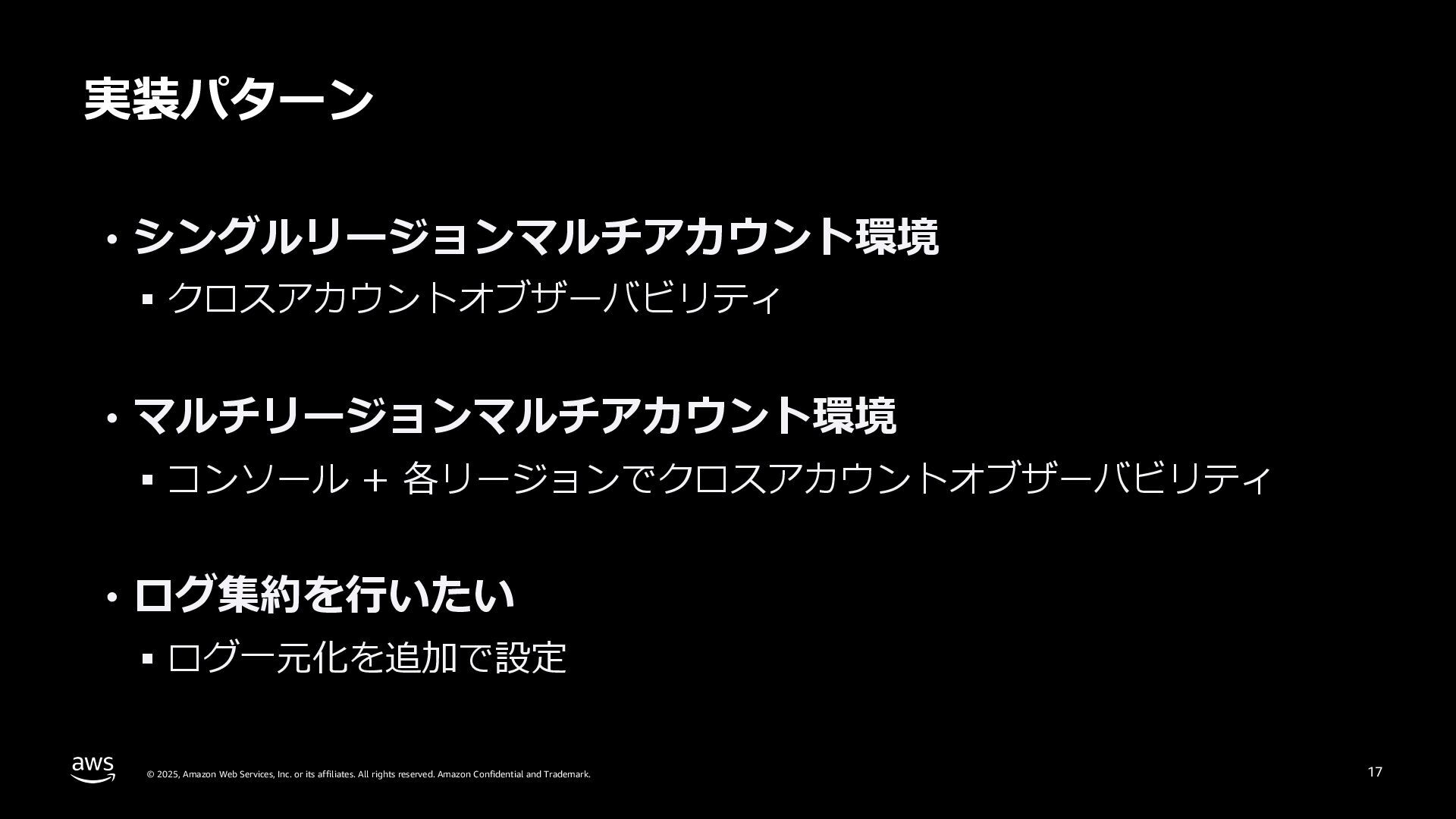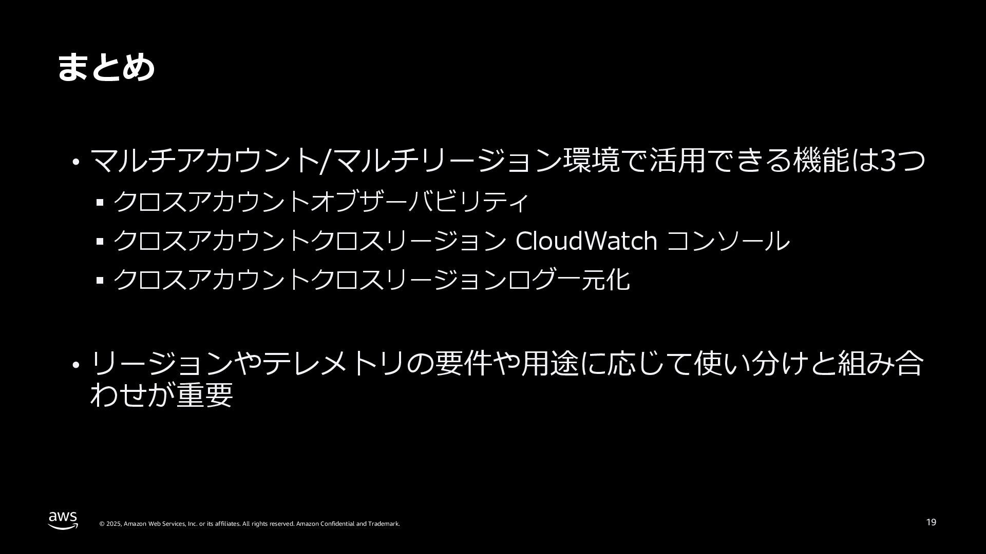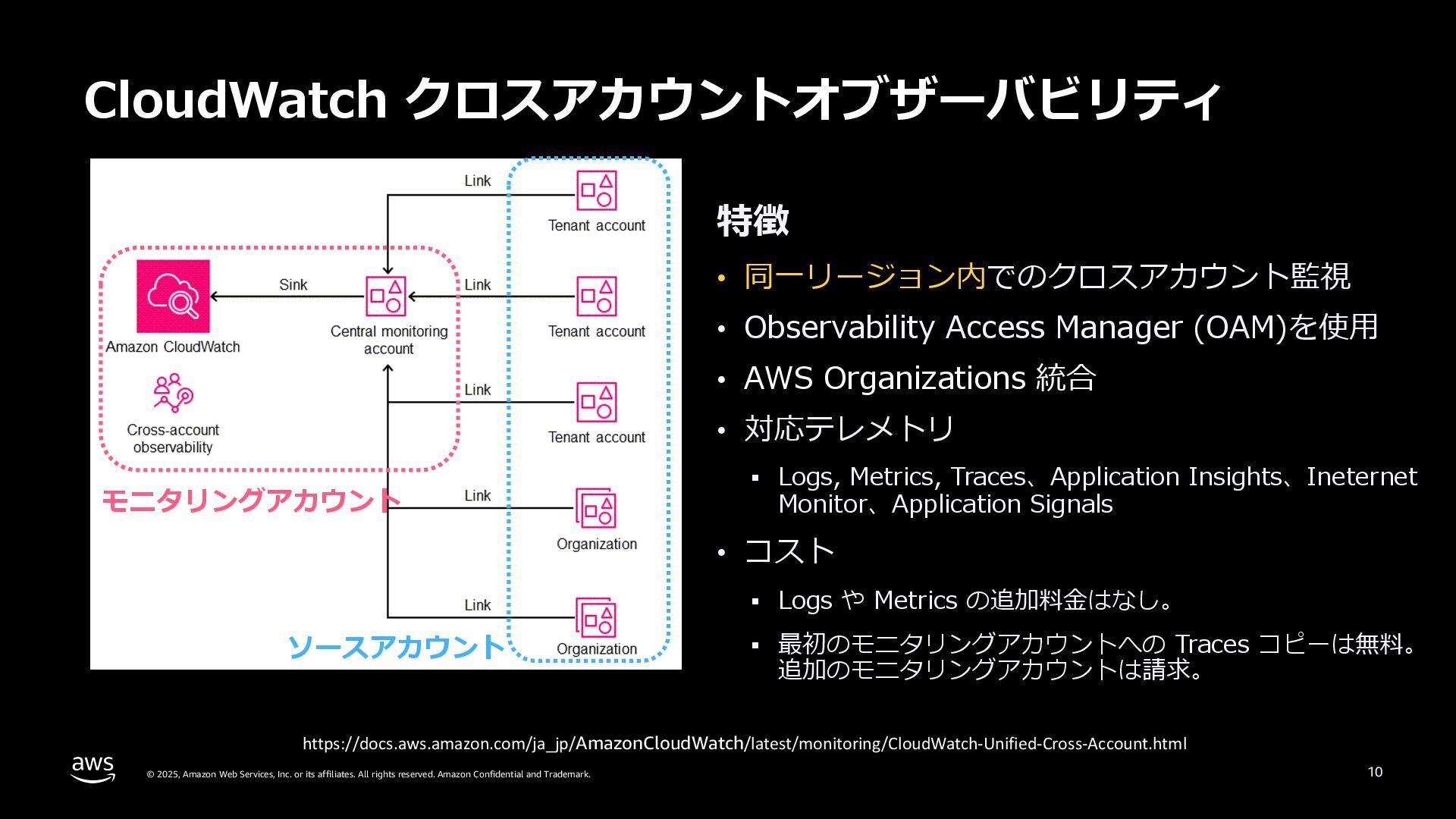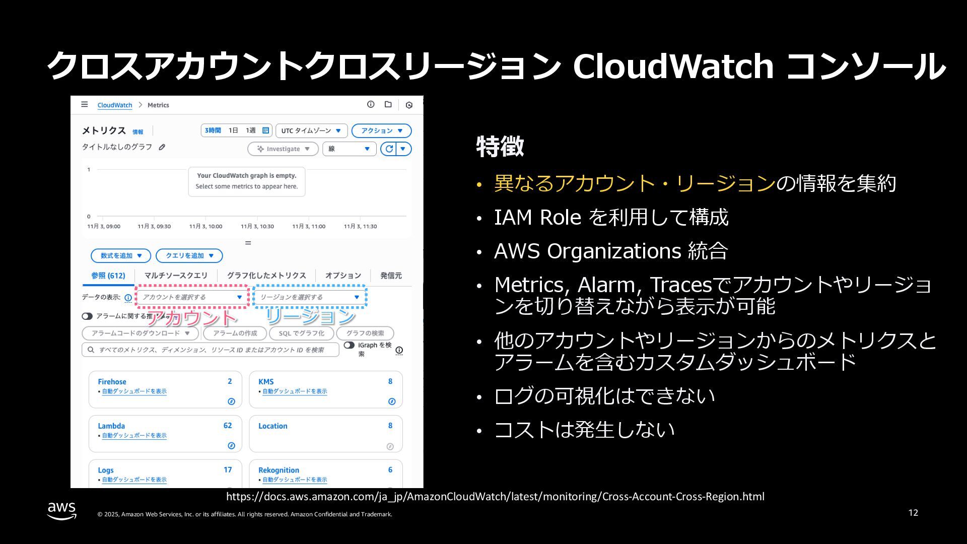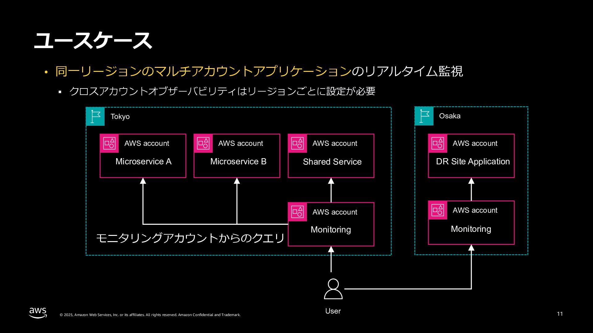rights reserved. Amazon Confidential and Trademark. 10 特徴 • 同⼀リージョン内でのクロスアカウント監視 • Observability Access Manager (OAM)を使⽤ • AWS Organizations 統合 • 対応テレメトリ § Logs, Metrics, Traces、Application Insights、Ineternet Monitor、Application Signals • コスト § Logs や Metrics の追加料⾦はなし。 § 最初のモニタリングアカウントへの Traces コピーは無料。 追加のモニタリングアカウントは請求。 CloudWatch クロスアカウントオブザーバビリティ https://docs.aws.amazon.com/ja_jp/AmazonCloudWatch/latest/monitoring/CloudWatch-Unified-Cross-Account.html ソースアカウント モニタリングアカウント