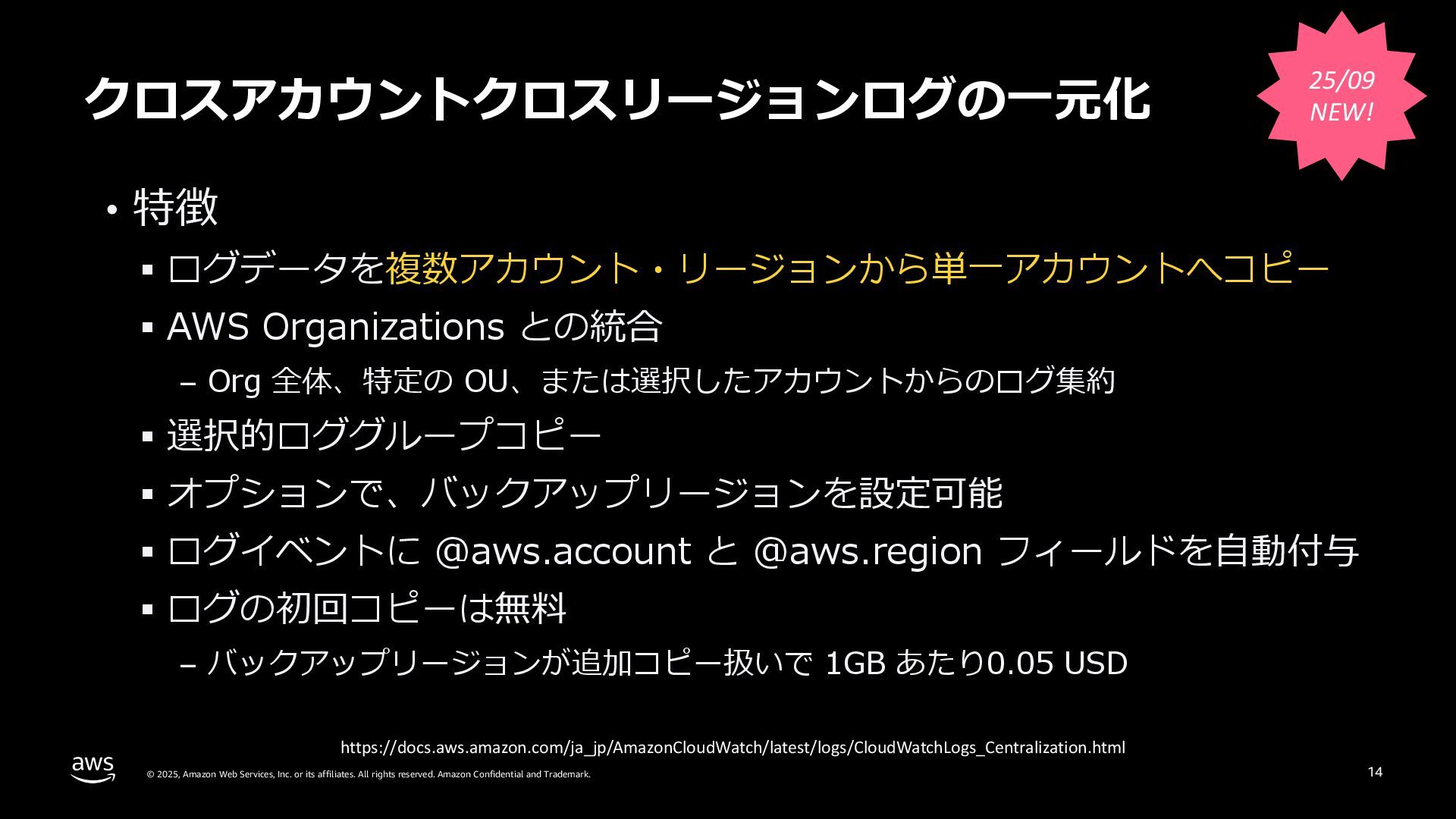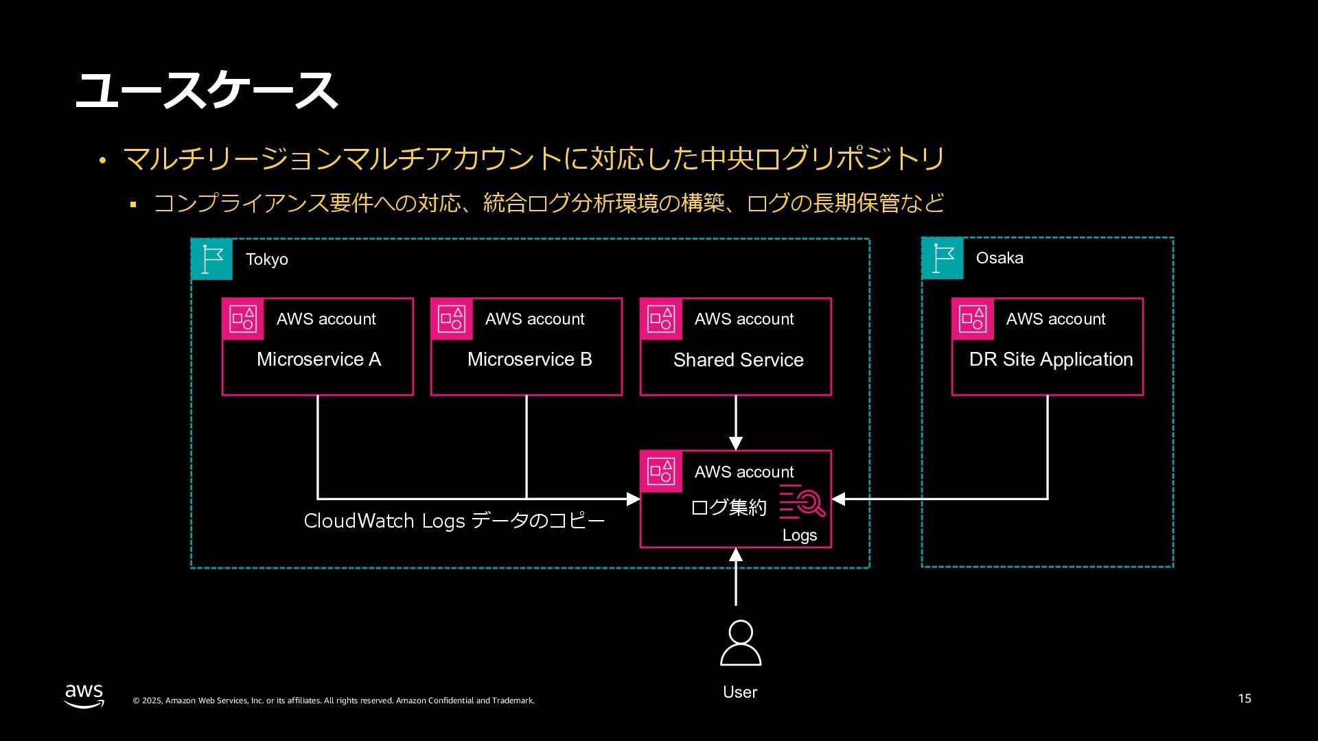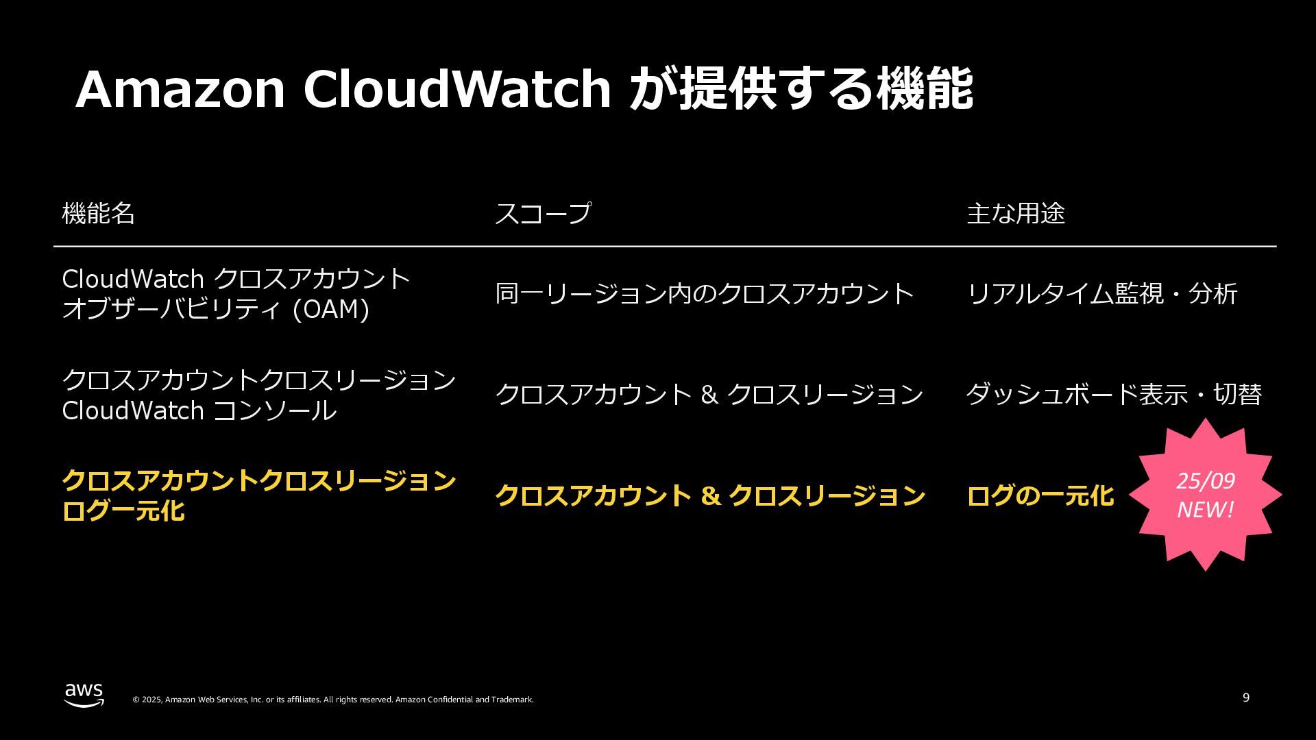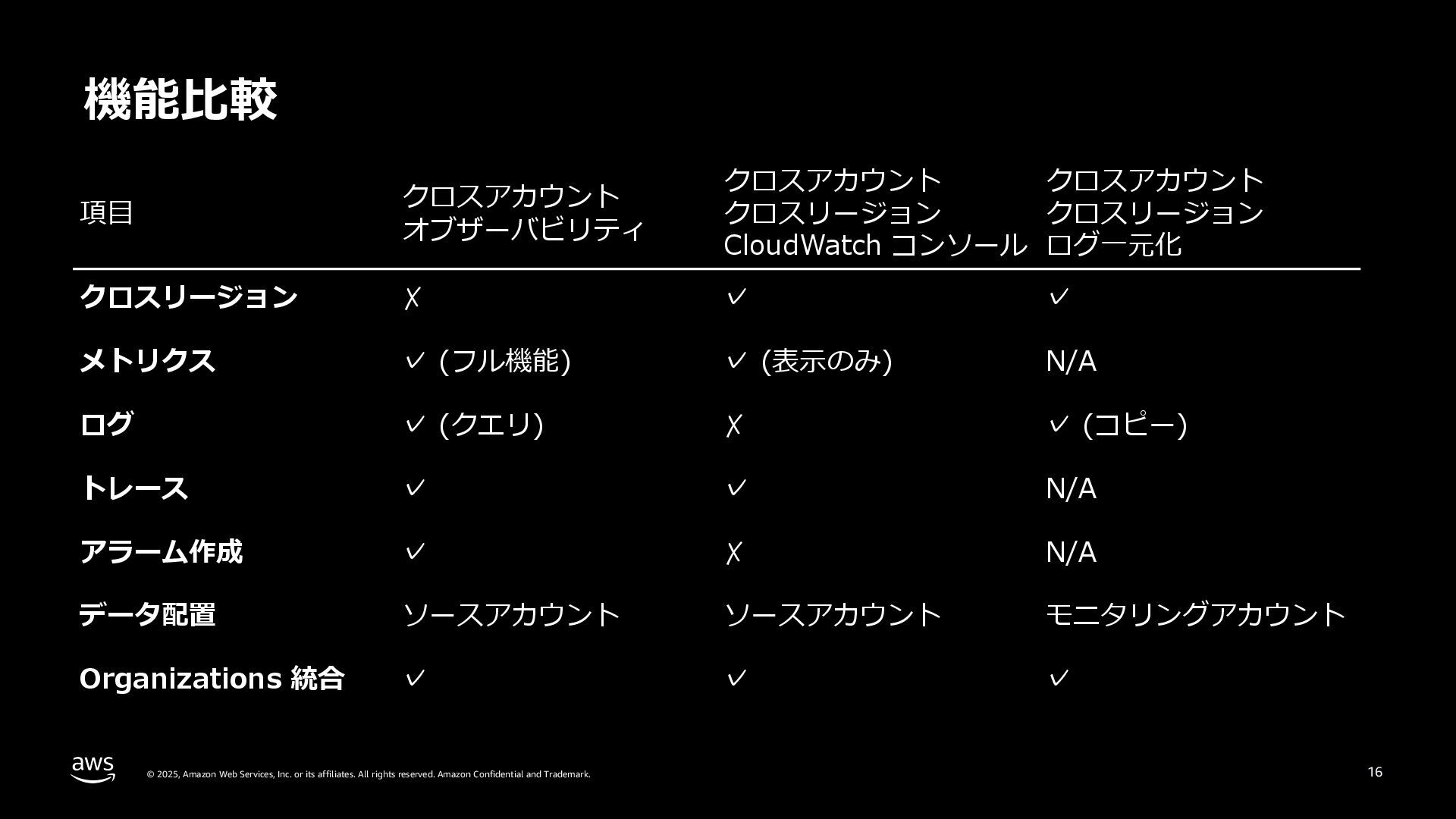 rights reserved. Amazon Confidential and Trademark. 10 特徴 • 同⼀リージョン内でのクロスアカウント監視 • Observability Access Manager (OAM)を使⽤ • AWS Organizations 統合 • 対応テレメトリ § Logs, Metrics, Traces、Application Insights、Ineternet Monitor、Application Signals • コスト § Logs や Metrics の追加料⾦はなし。 § 最初のモニタリングアカウントへの Traces コピーは無料。 追加のモニタリングアカウントは請求。 CloudWatch クロスアカウントオブザーバビリティ https://docs.aws.amazon.com/ja_jp/AmazonCloudWatch/latest/monitoring/CloudWatch-Unified-Cross-Account.html ソースアカウント モニタリングアカウント