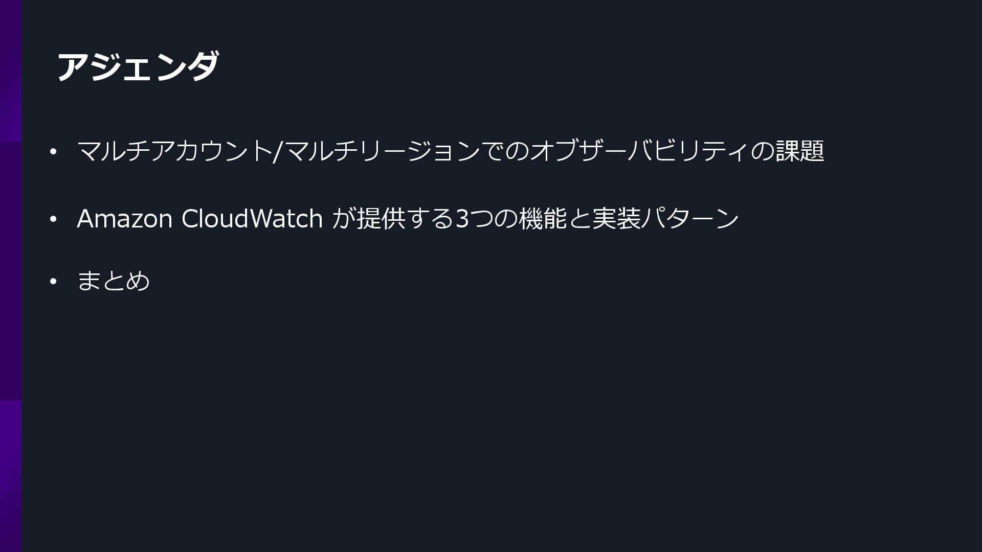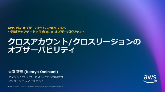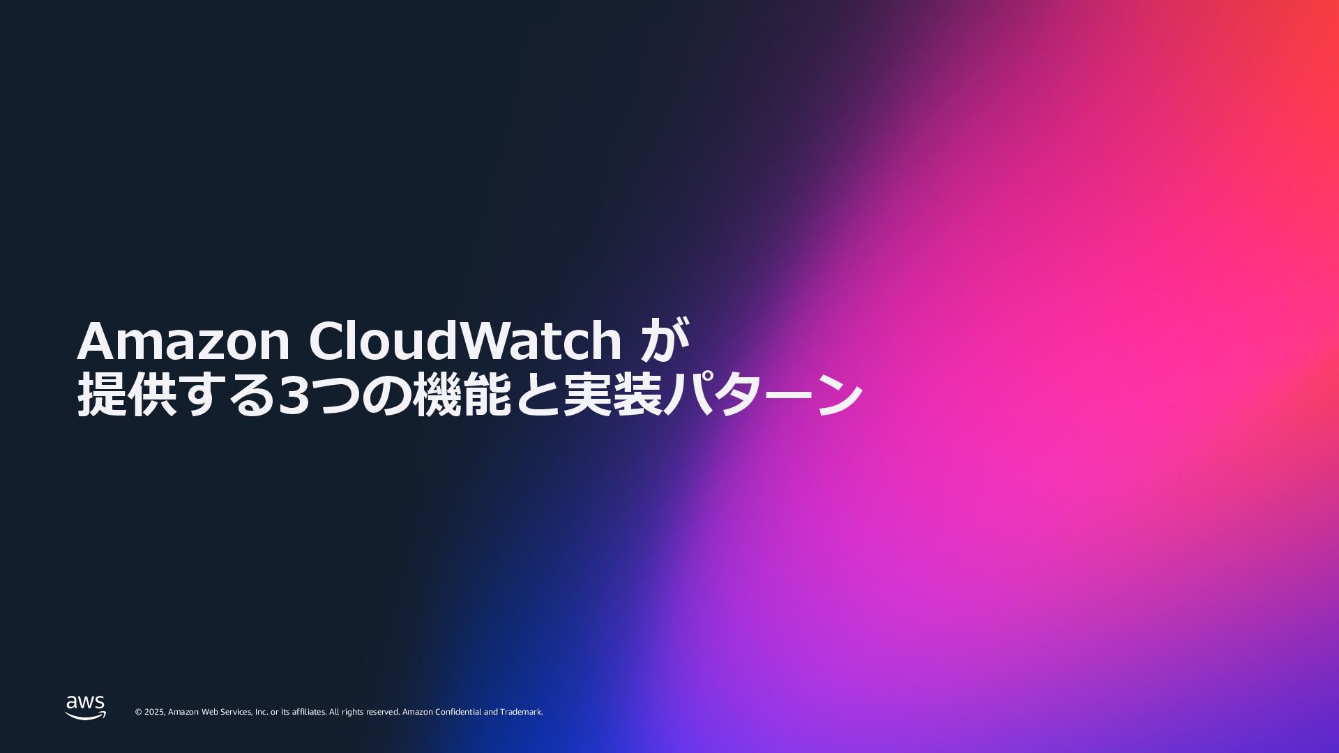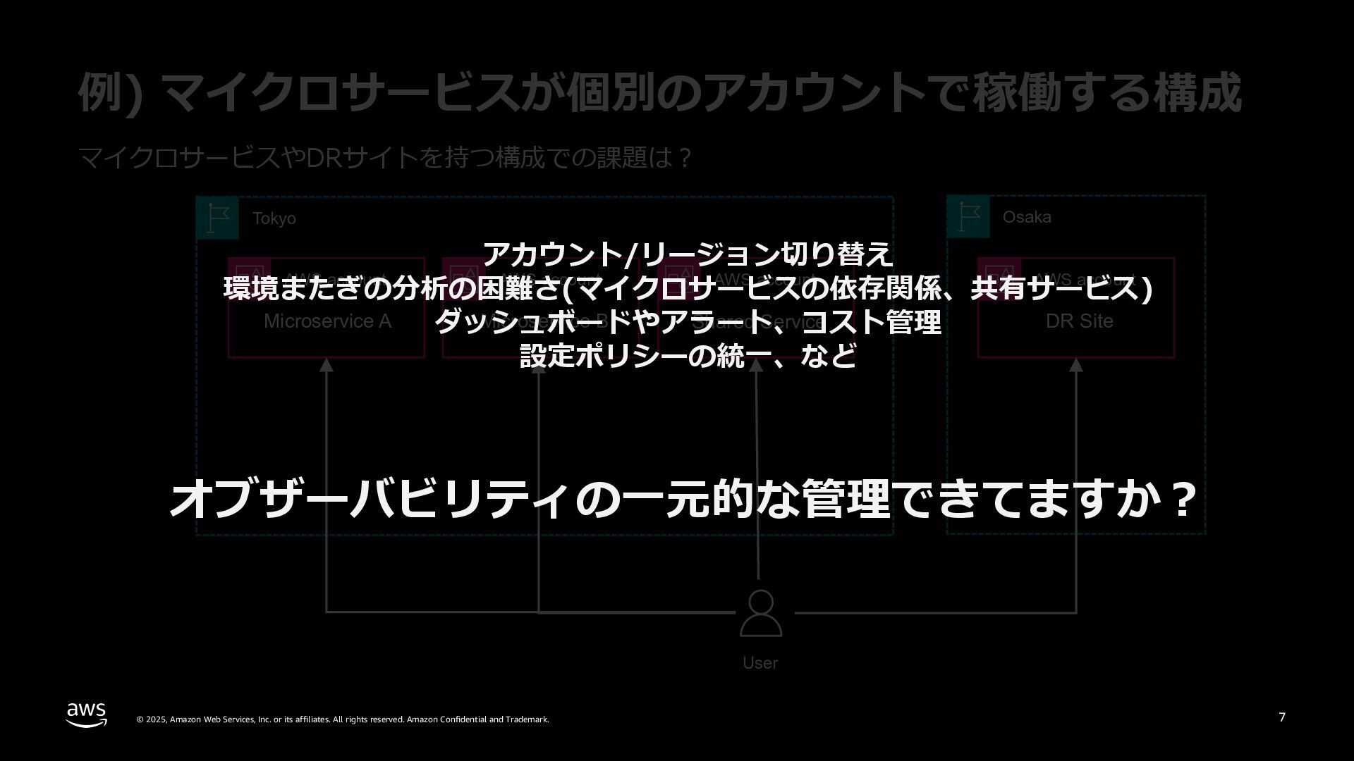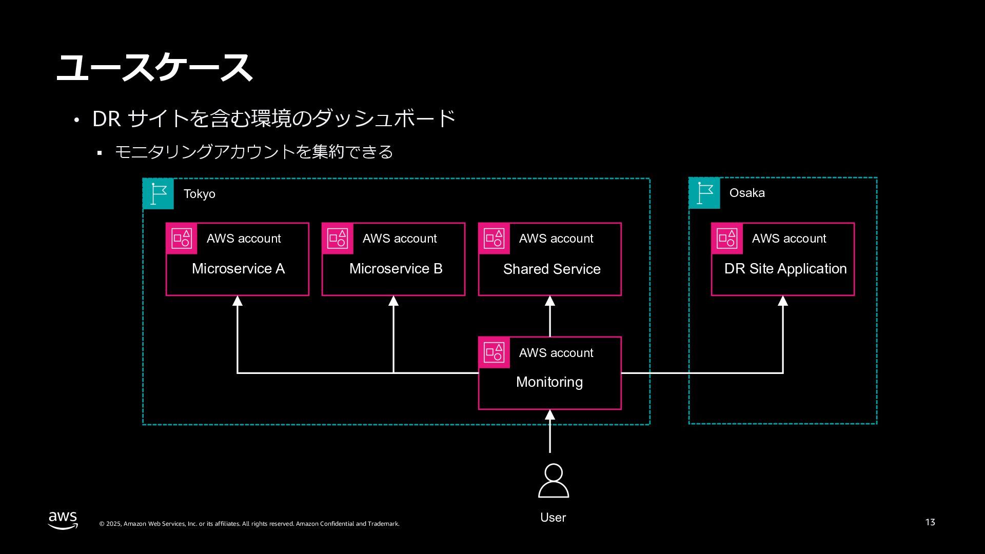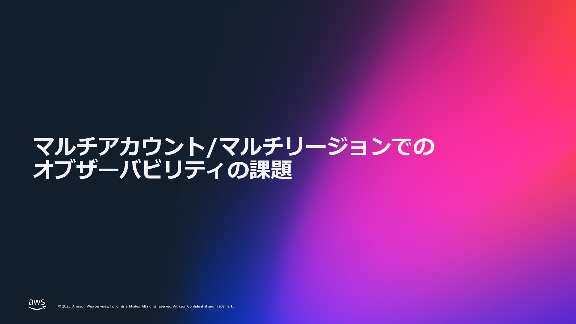 rights reserved. Amazon Confidential and Trademark. 10 特徴 • 同⼀リージョン内でのクロスアカウント監視 • Observability Access Manager (OAM)を使⽤ • AWS Organizations 統合 • 対応テレメトリ § Logs, Metrics, Traces、Application Insights、Ineternet Monitor、Application Signals • コスト § Logs や Metrics の追加料⾦はなし。 § 最初のモニタリングアカウントへの Traces コピーは無料。 追加のモニタリングアカウントは請求。 CloudWatch クロスアカウントオブザーバビリティ https://docs.aws.amazon.com/ja_jp/AmazonCloudWatch/latest/monitoring/CloudWatch-Unified-Cross-Account.html ソースアカウント モニタリングアカウント