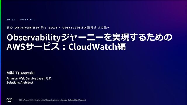 rights reserved. Amazon Confidential and Trademark. 現在の機能(22項⽬)で他のユースケースにも AWSサービス名 概要 ⼤阪リージョン 有・無 CW Dashboard ダッシュボード 有 CW Alarm アラーム 有 CW Logs ログ 有 CW Log Anomalies ログ異常検知(機械学習機能) 有 CW Log Live Tail ライブテール 有 CW Logs Insights ログ分析 有 CW Metrics メトリクス(メトリクス分析もこちら) 有 CW Metrics Explorer メトリックス検索 有 CW Metrics Stream メトリックスのリアルタイム連携 有 X-Ray traces トレース 有 CW Events ※Event Bridgeに統合 イベント 有 CW Application Signals (Preview) SLO/SLIベースとしたアプリケーションモニタ リング機能 無 CW Synthetics 外形監視 有 CW RUM リアルユーザーモニタリング 有 CW Evidently フィーチャーフラグA/Bテスト 無 AWSサービス名 概要 ⼤阪リージョン 有・無 CW Internet Monitor インターネット監視 有 CW Network Monitor ネットワーク監視 無 CW Container Insights コンテナ分析 有 CW Lambda Insights Lambda分析 有 CW Contributor Insights ログの時系列分析 有 CW Application Insights アプリケーション分析 有 CW EC2 Resource Health EC2の健全性・パフォーマンス可 視化 有 さまざまな機能を組み合わせて サービスに⼤切なものを監視する ※CWはCloudWatchの略