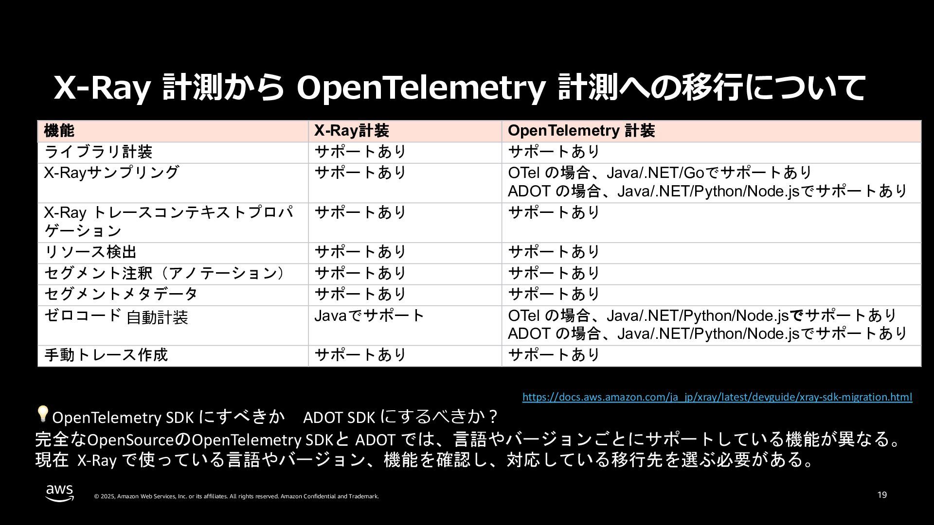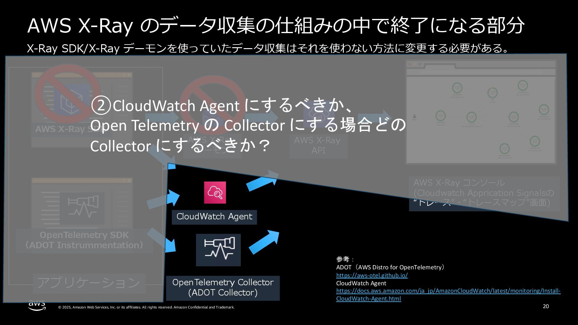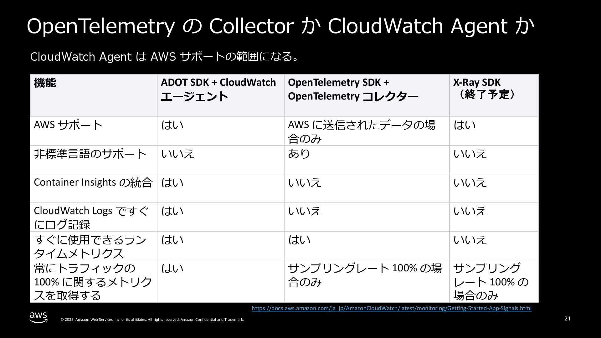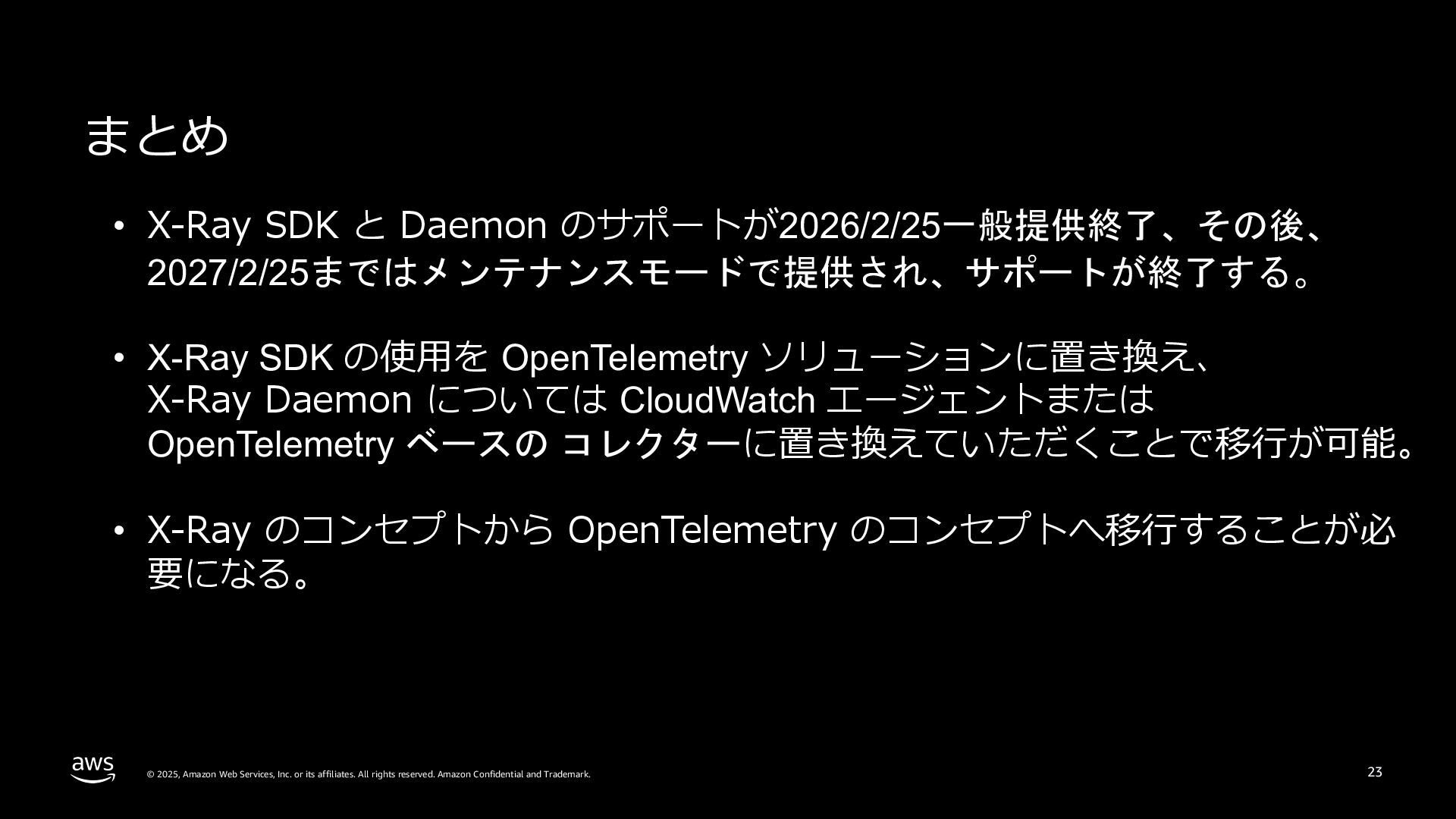 rights reserved. Amazon Confidential and Trademark. 22 OpenTelemetry の Collector にする場合どの Collector にするべきか︖ 機能 OpenTelemetry Collector Contrib Custom OpenTelemetry Collector AWS Distro for OpenTelemetry CloudWatch application signals (Application performance metrics, service discovery, application map) Yes Yes Yes スパンとトレースサマリーを検索して分析 Yes Yes Yes ログの概要を検索して分析 Yes Yes Yes アプリケーションがホストされているAWSイ ンフラストラクチャ属性によるAPMテレメト リの強化 No Yes Yes ランタイムメトリクスのアプリケーションと の相関 例︓JVM metrics No Yes No AWS サポート Data received by AWS Data received by AWS Data received by AWS サポートするテレメトリ Telemetry Logs, Traces Logs, Traces, Metrics Traces https://docs.aws.amazon.com/AmazonCloudWatch/latest/monitoring/CloudWatch-OTLPGettingStarted.html 基本的には OpenTelemetry 自体は OpenSourceである点は留意いただく。 ADOT(AWS Distro for OpenTelemetry)は OpenTelemetry コンポーネントのディストリビューションであり、AWSによ ってテスト・最適化・保護されている。