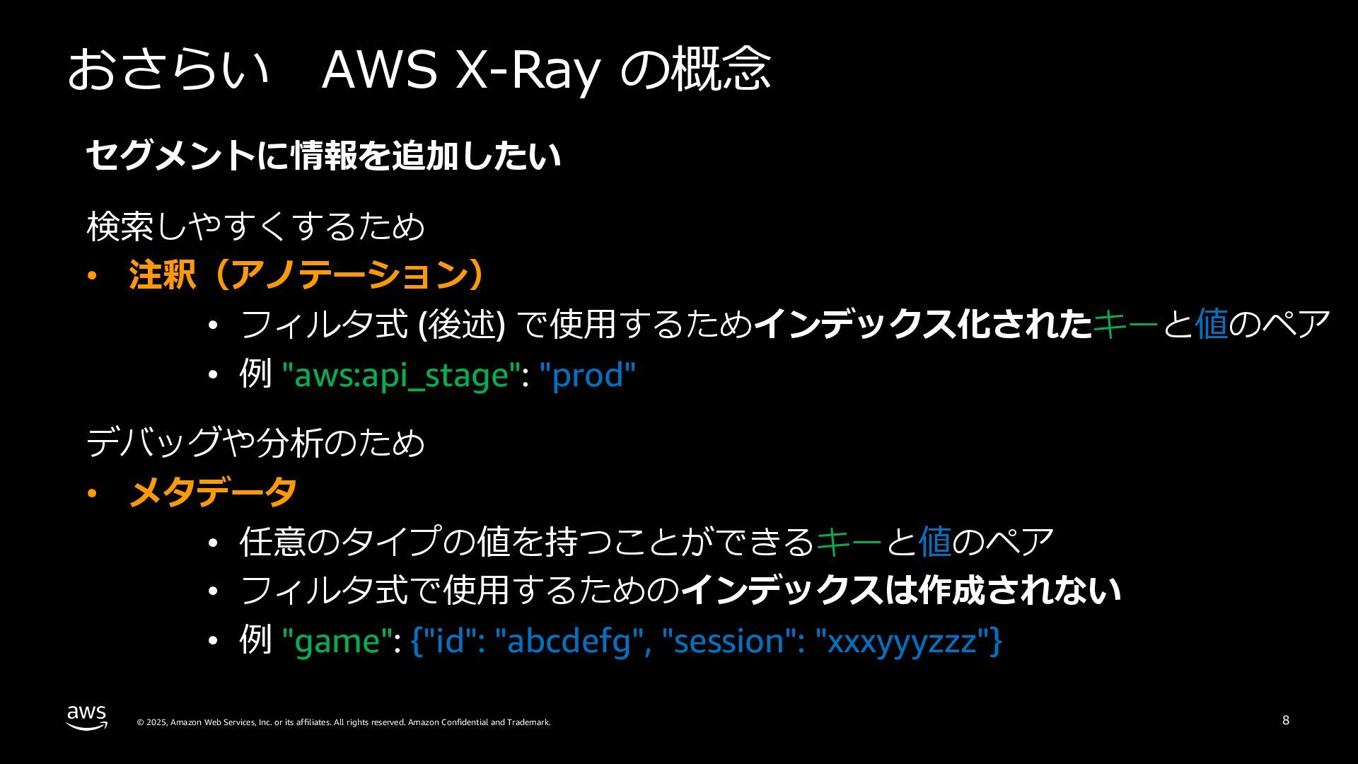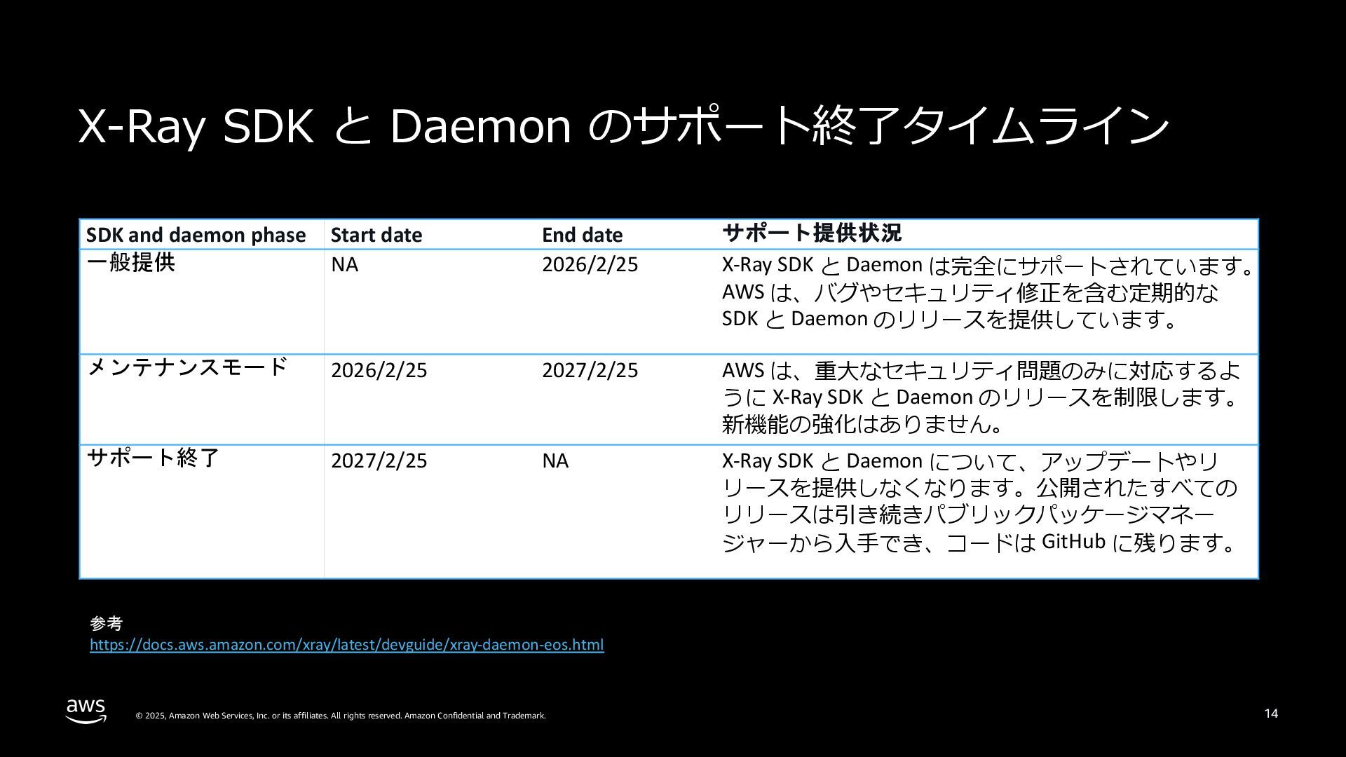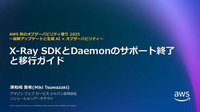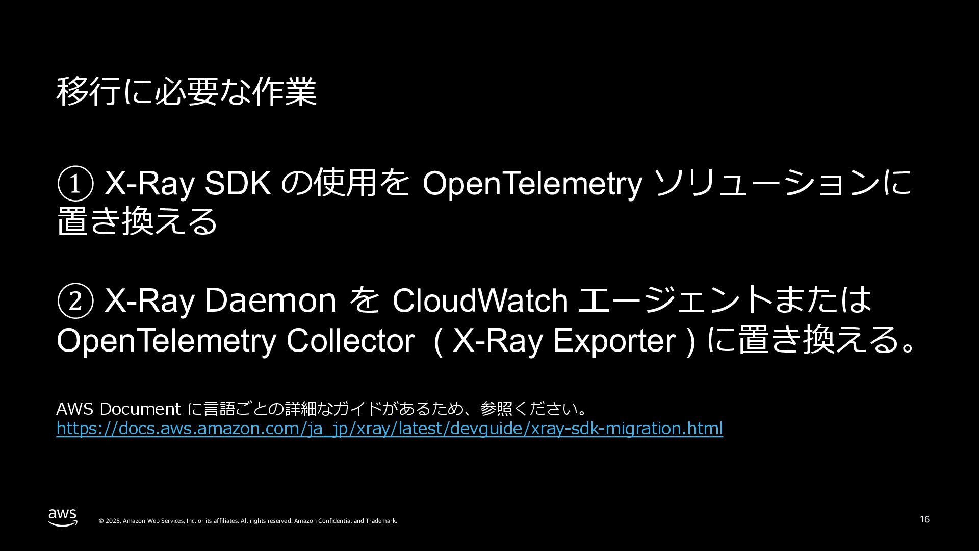 rights reserved. Amazon Confidential and Trademark. 22 OpenTelemetry の Collector にする場合どの Collector にするべきか︖ 機能 OpenTelemetry Collector Contrib Custom OpenTelemetry Collector AWS Distro for OpenTelemetry CloudWatch application signals (Application performance metrics, service discovery, application map) Yes Yes Yes スパンとトレースサマリーを検索して分析 Yes Yes Yes ログの概要を検索して分析 Yes Yes Yes アプリケーションがホストされているAWSイ ンフラストラクチャ属性によるAPMテレメト リの強化 No Yes Yes ランタイムメトリクスのアプリケーションと の相関 例︓JVM metrics No Yes No AWS サポート Data received by AWS Data received by AWS Data received by AWS サポートするテレメトリ Telemetry Logs, Traces Logs, Traces, Metrics Traces https://docs.aws.amazon.com/AmazonCloudWatch/latest/monitoring/CloudWatch-OTLPGettingStarted.html 基本的には OpenTelemetry 自体は OpenSourceである点は留意いただく。 ADOT(AWS Distro for OpenTelemetry)は OpenTelemetry コンポーネントのディストリビューションであり、AWSによ ってテスト・最適化・保護されている。